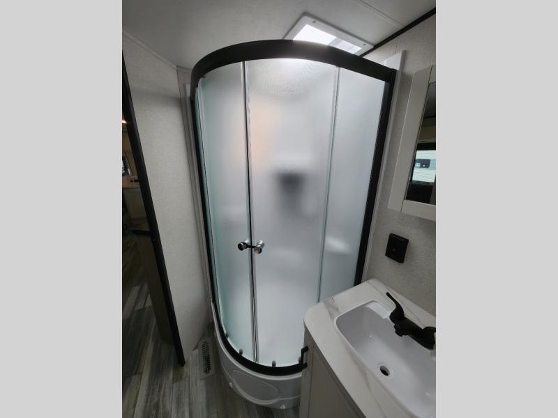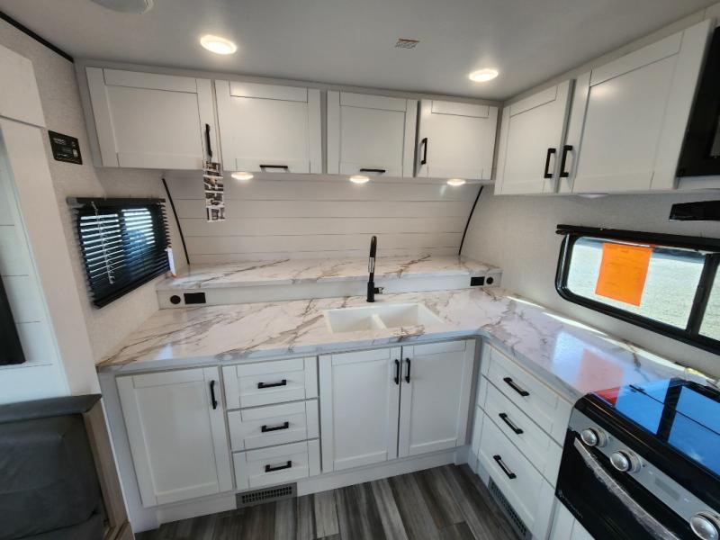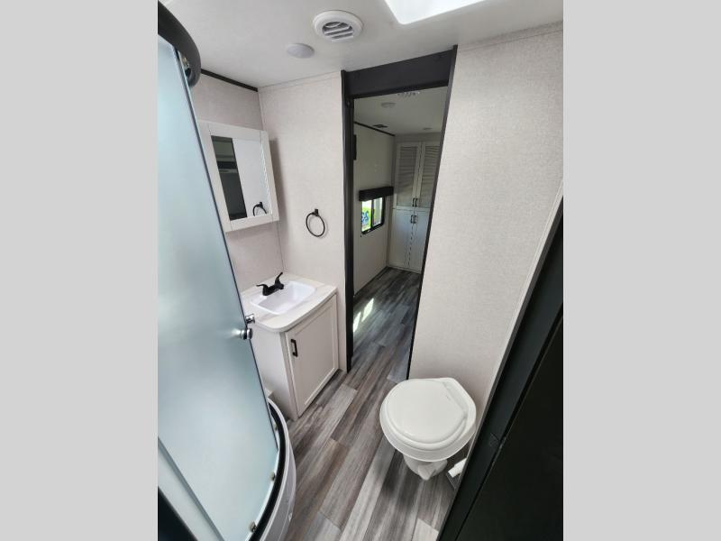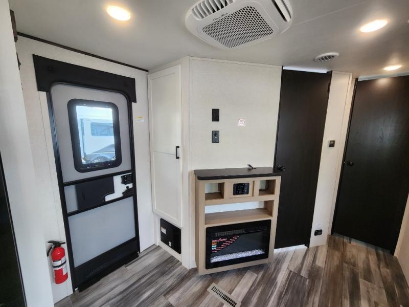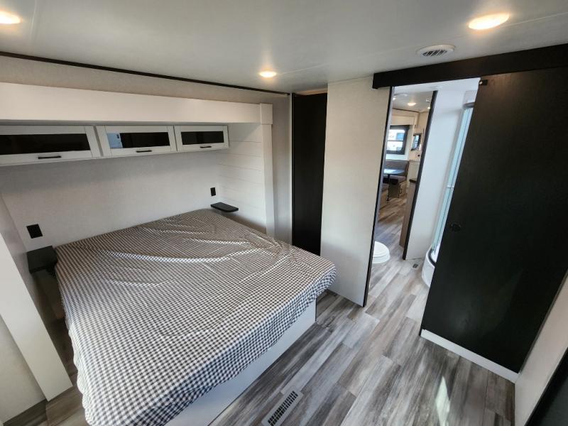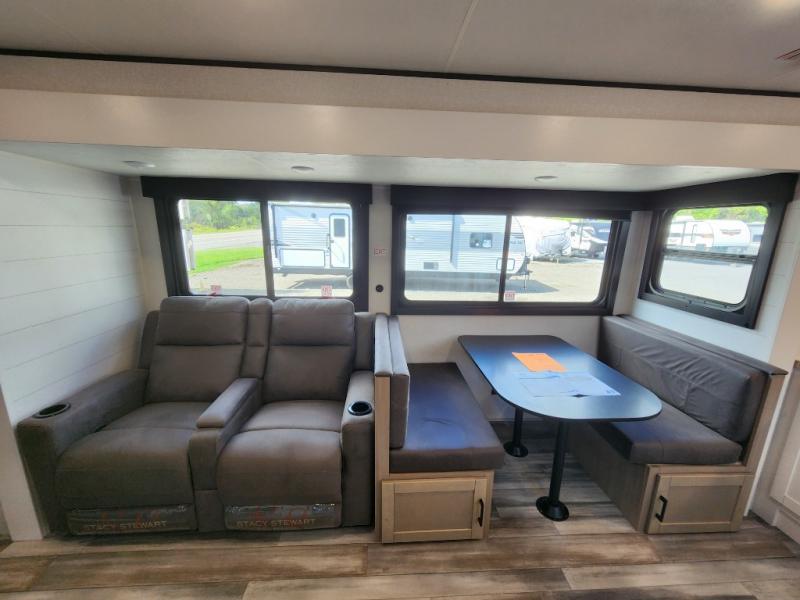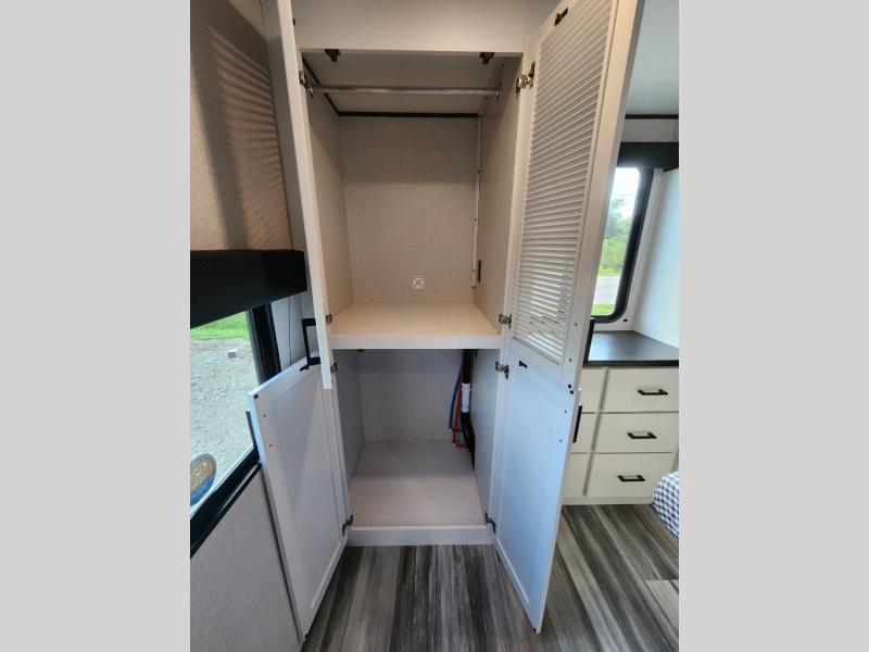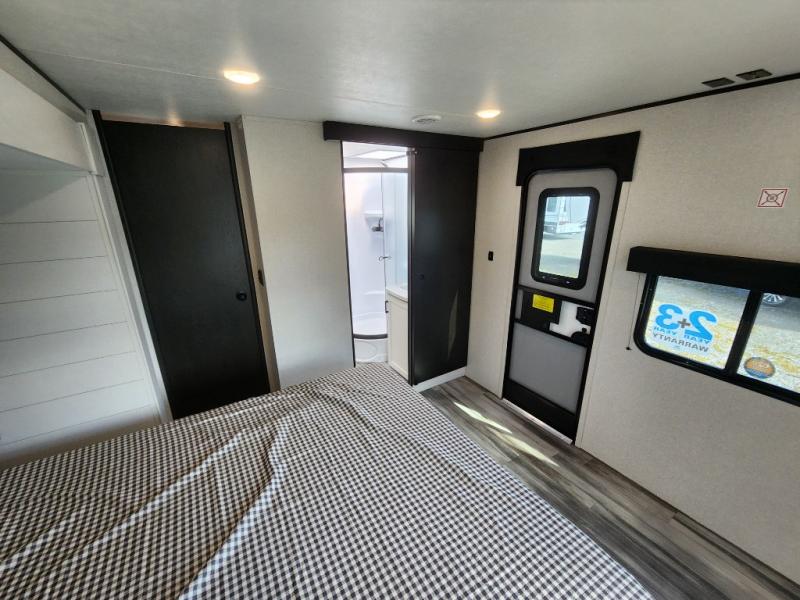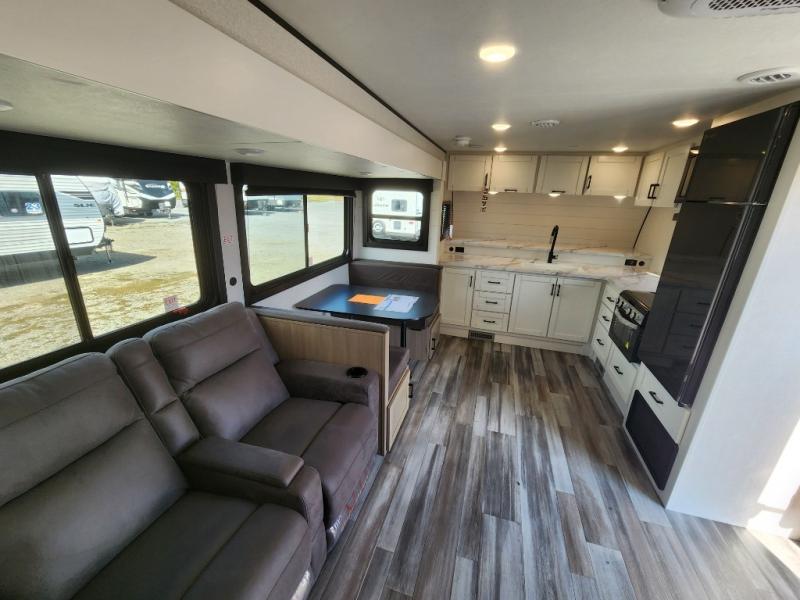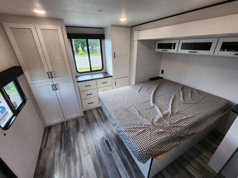 This front kitchen travel trailer is perfect for weekend trips or extended stays at the location of your choice! You'll love the ample counter space to prep meals, and there is a booth dinette where you can dine together each day. A theater seat is in great view of the entertainment center if you want to add a TV, or you may just find yourselves outdoors under the 20' power awning. This unit features a dual entry bath with a private entrance into the rear master bedroom. This room also includes a queen bed slide, a wardrobe and two dressers, plus additional storage with washer and dryer prep. And one of the dual entry doors is found here so you can slip out in the morning for some early fishing!