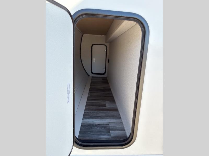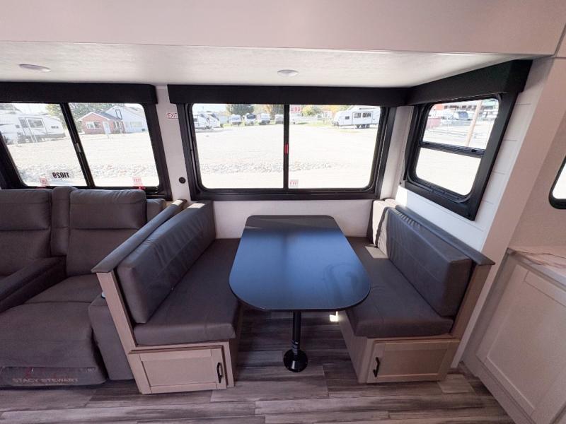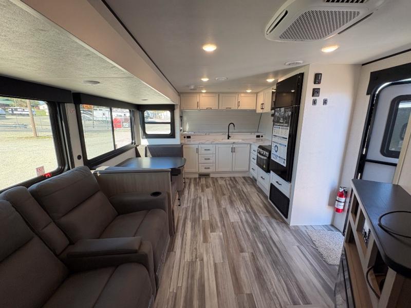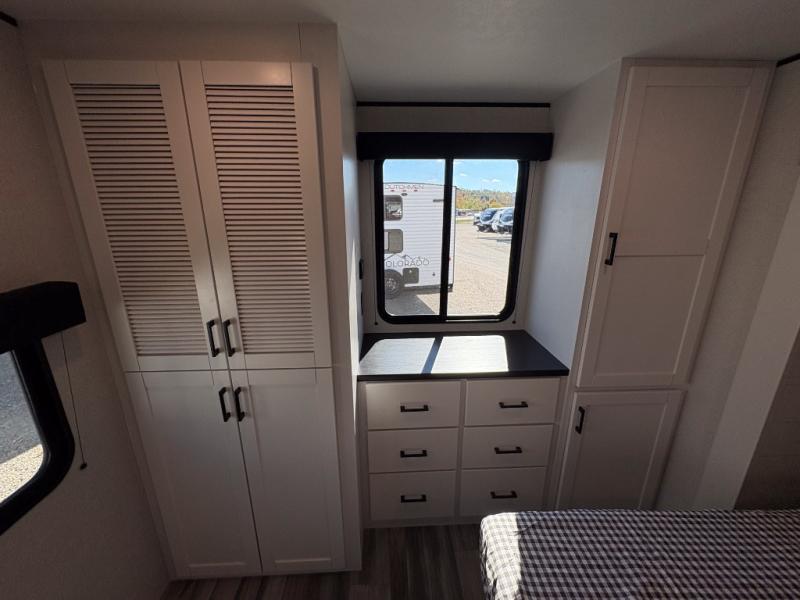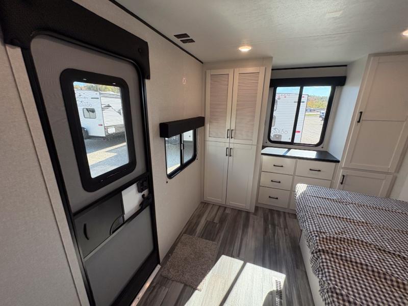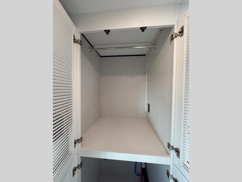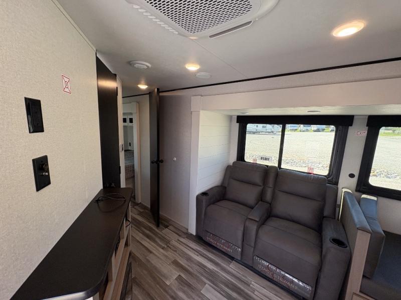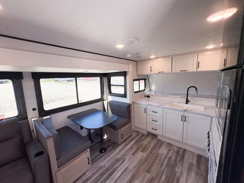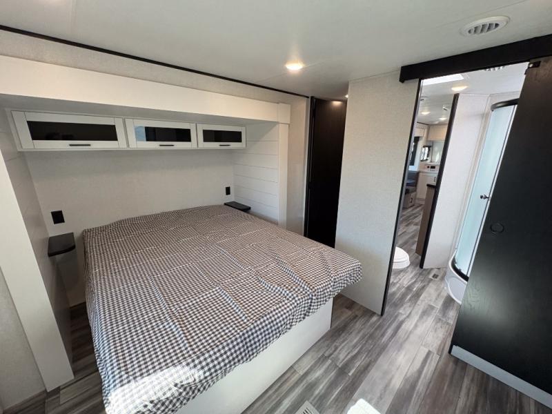 This front kitchen travel trailer is perfect for weekend trips or extended stays at the location of your choice! You'll love the ample counter space to prep meals, and there is a booth dinette where you can dine together each day. A theater seat is in great view of the entertainment center if you want to add a TV, or you may just find yourselves outdoors under the 20' power awning. This unit features a dual entry bath with a private entrance into the rear master bedroom. This room also includes a queen bed slide, a wardrobe and two dressers, plus additional storage with washer and dryer prep. And one of the dual entry doors is found here so you can slip out in the morning for some early fishing!