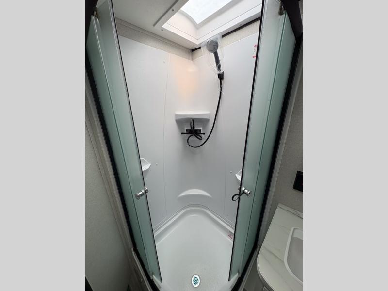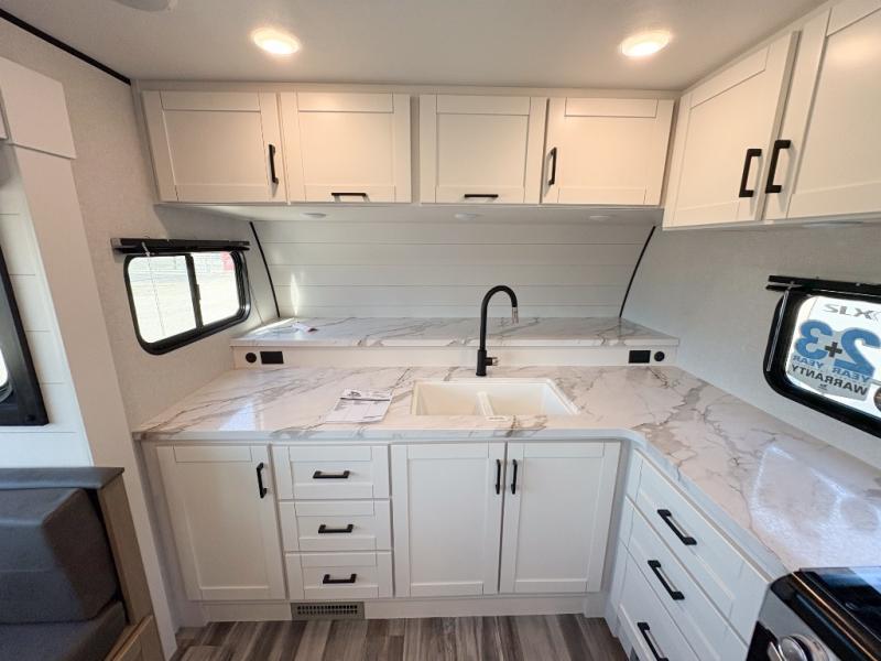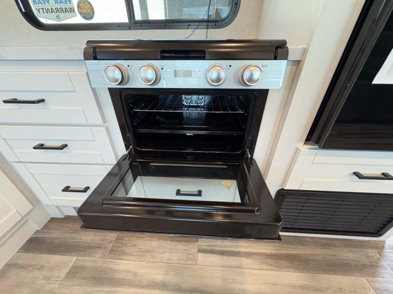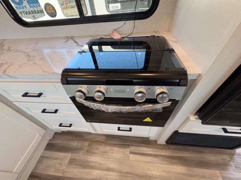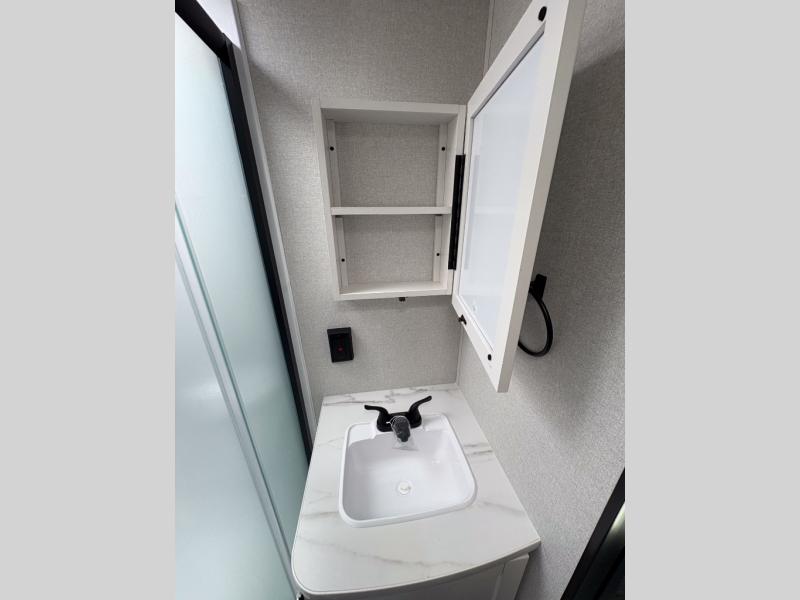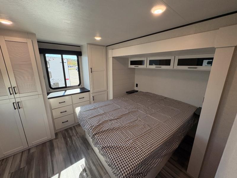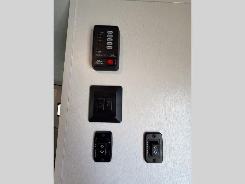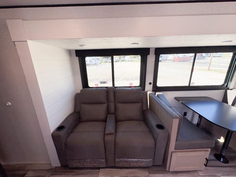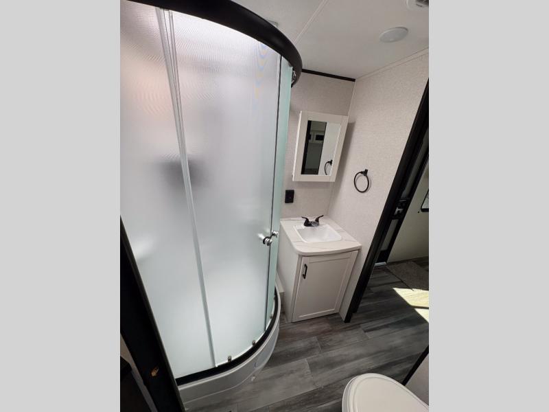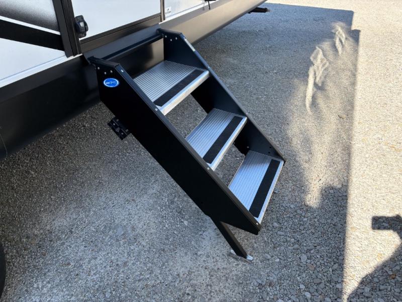 This front kitchen travel trailer is perfect for weekend trips or extended stays at the location of your choice! You'll love the ample counter space to prep meals, and there is a booth dinette where you can dine together each day. A theater seat is in great view of the entertainment center if you want to add a TV, or you may just find yourselves outdoors under the 20' power awning. This unit features a dual entry bath with a private entrance into the rear master bedroom. This room also includes a queen bed slide, a wardrobe and two dressers, plus additional storage with washer and dryer prep. And one of the dual entry doors is found here so you can slip out in the morning for some early fishing!