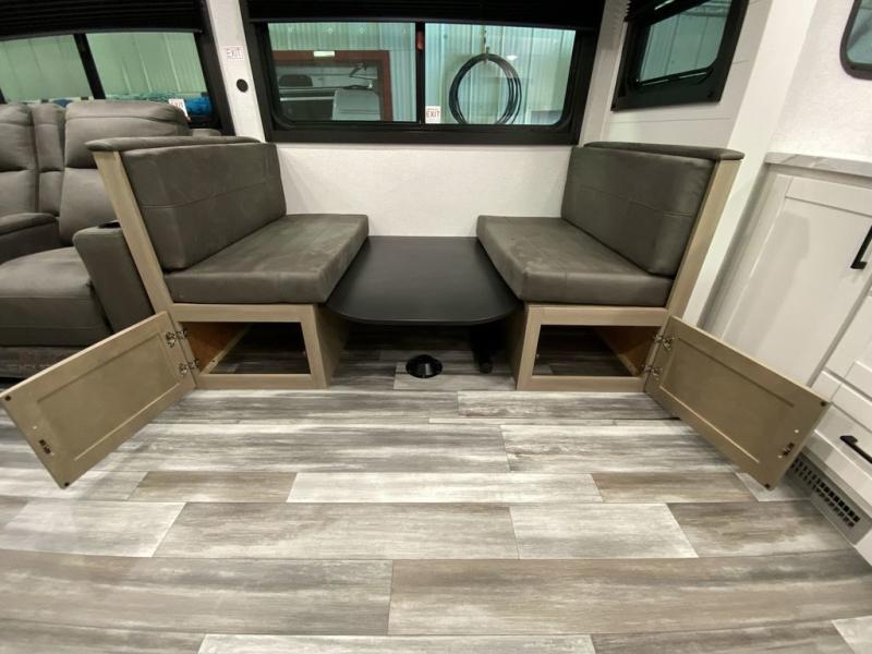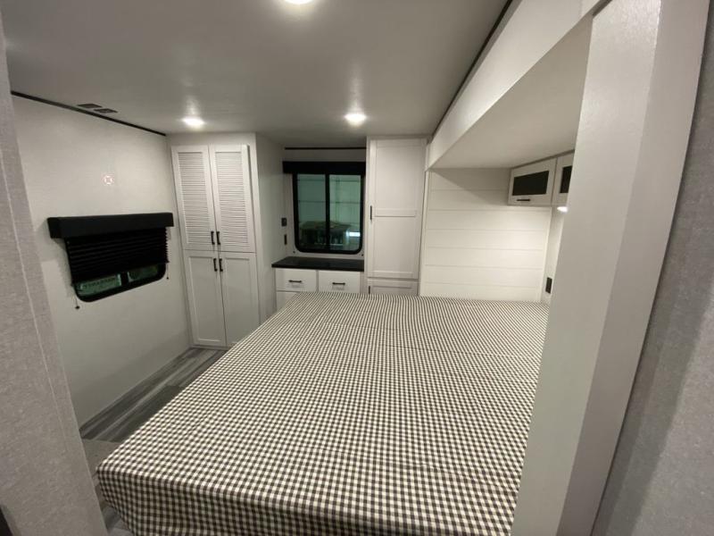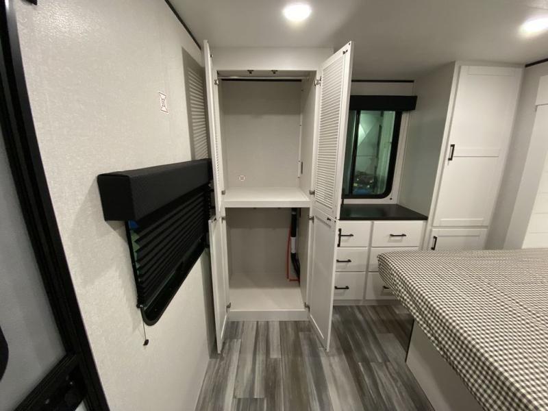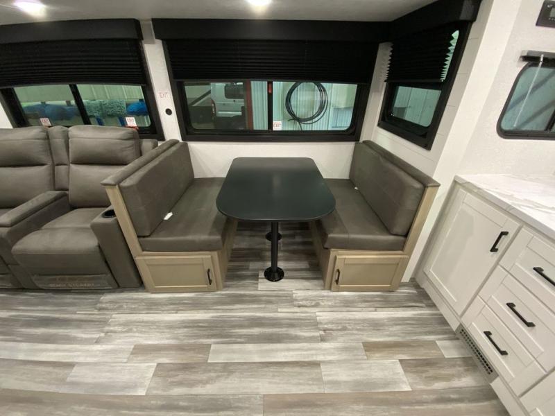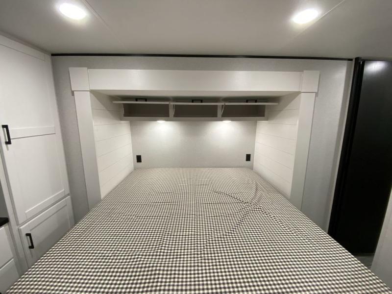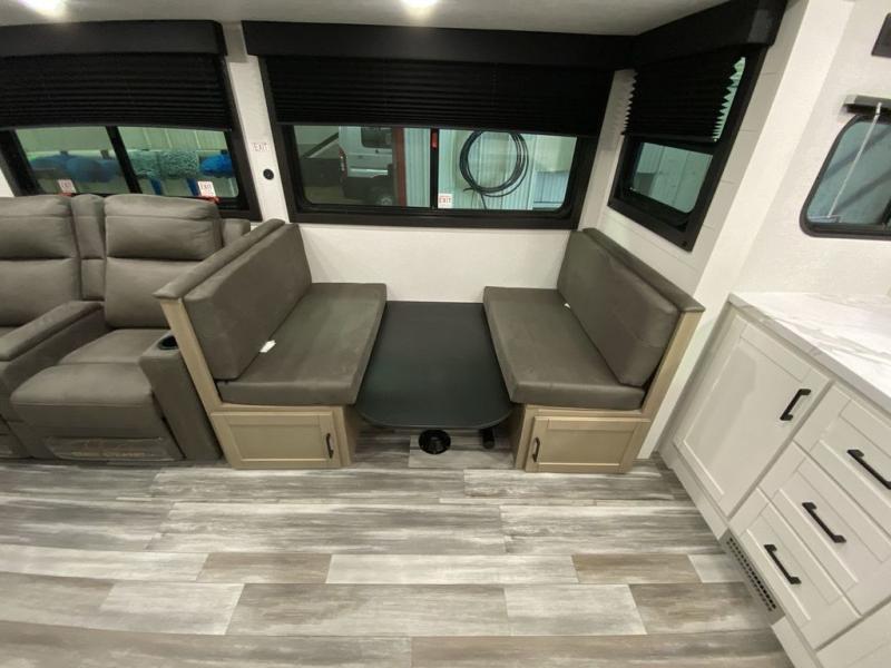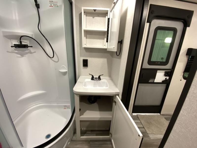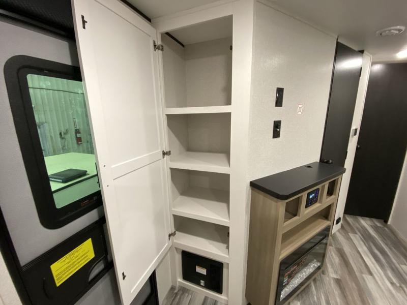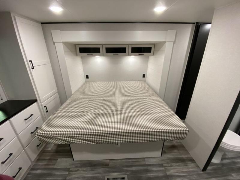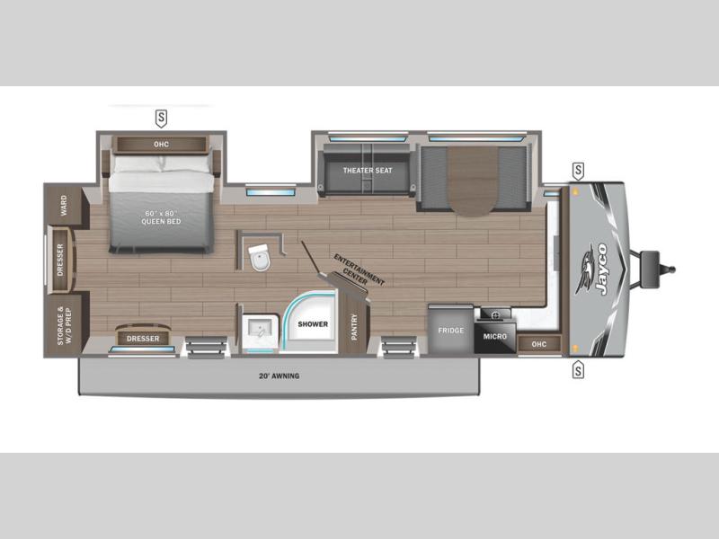 This front kitchen travel trailer is perfect for weekend trips or extended stays at the location of your choice! You'll love the ample counter space to prep meals, and there is a booth dinette where you can dine together each day. A theater seat is in great view of the entertainment center if you want to add a TV, or you may just find yourselves outdoors under the 20' power awning. This unit features a dual entry bath with a private entrance into the rear master bedroom. This room also includes a queen bed slide, a wardrobe and two dressers, plus additional storage with washer and dryer prep. And one of the dual entry doors is found here so you can slip out in the morning for some early fishing!