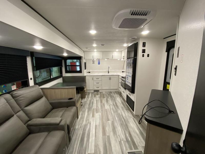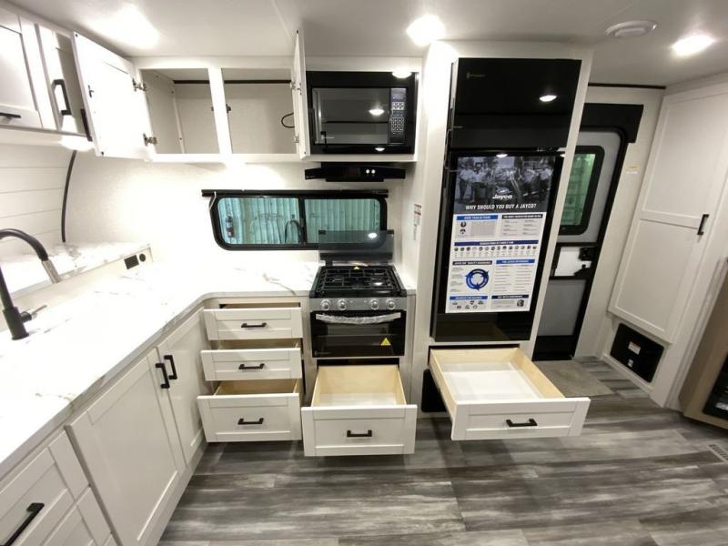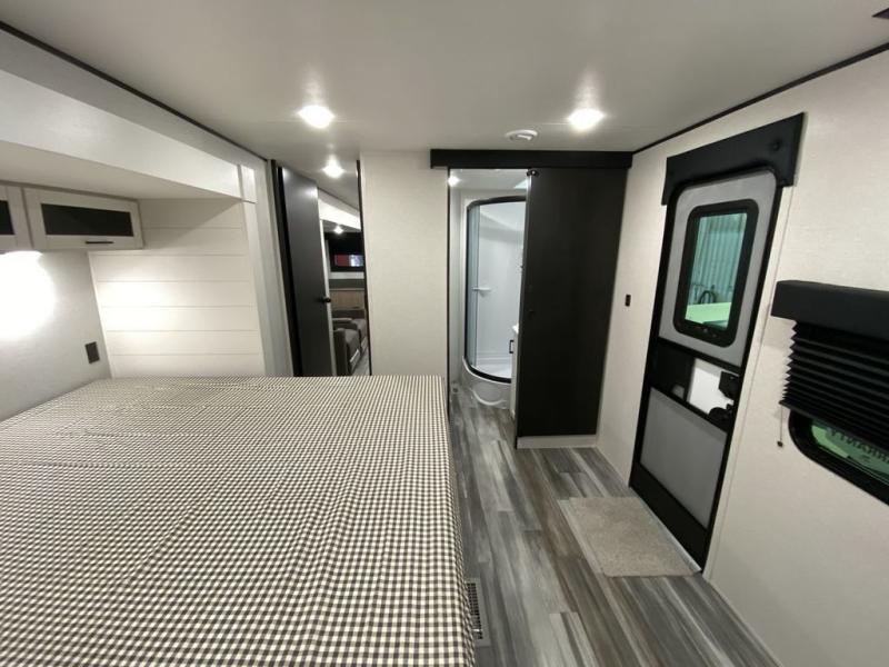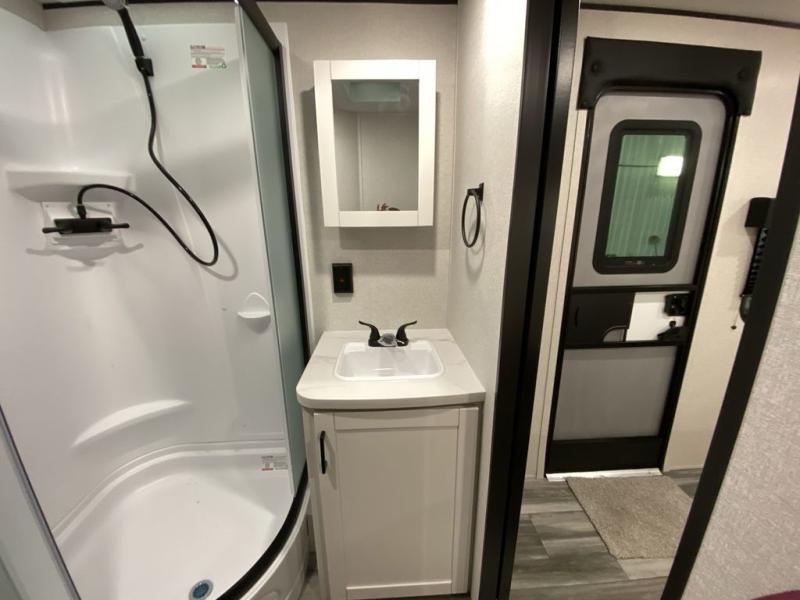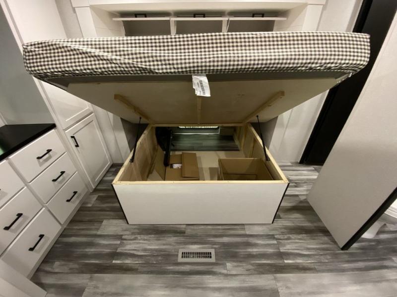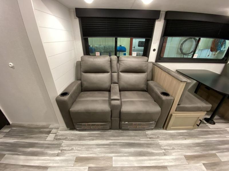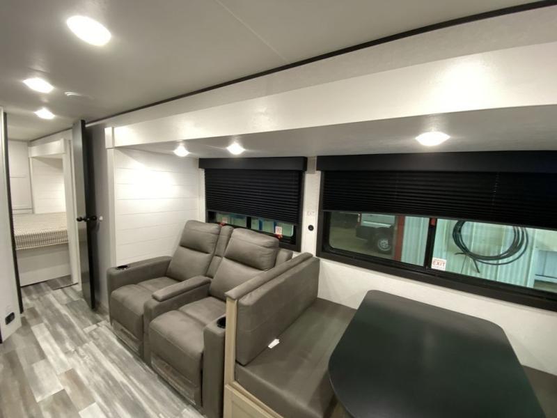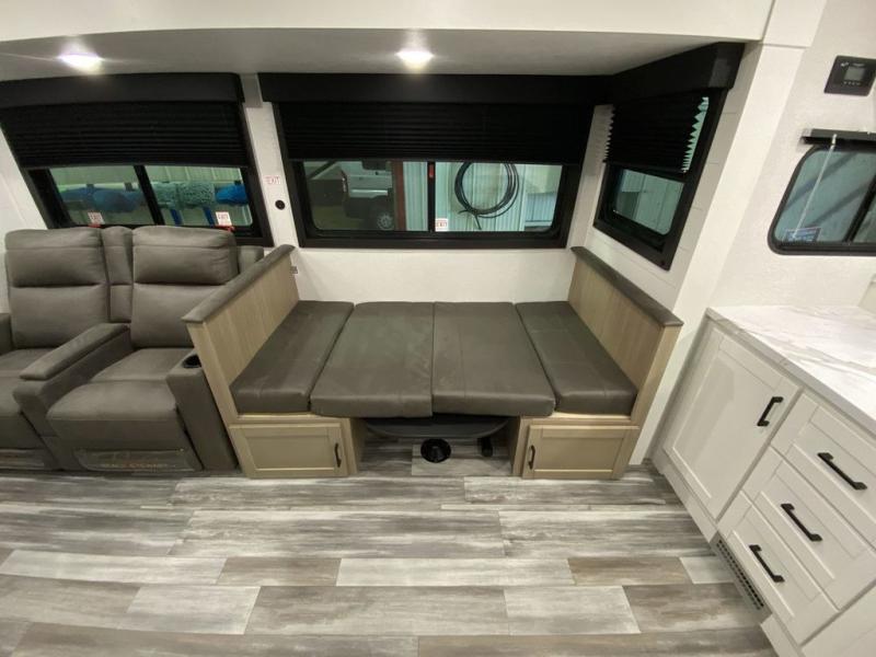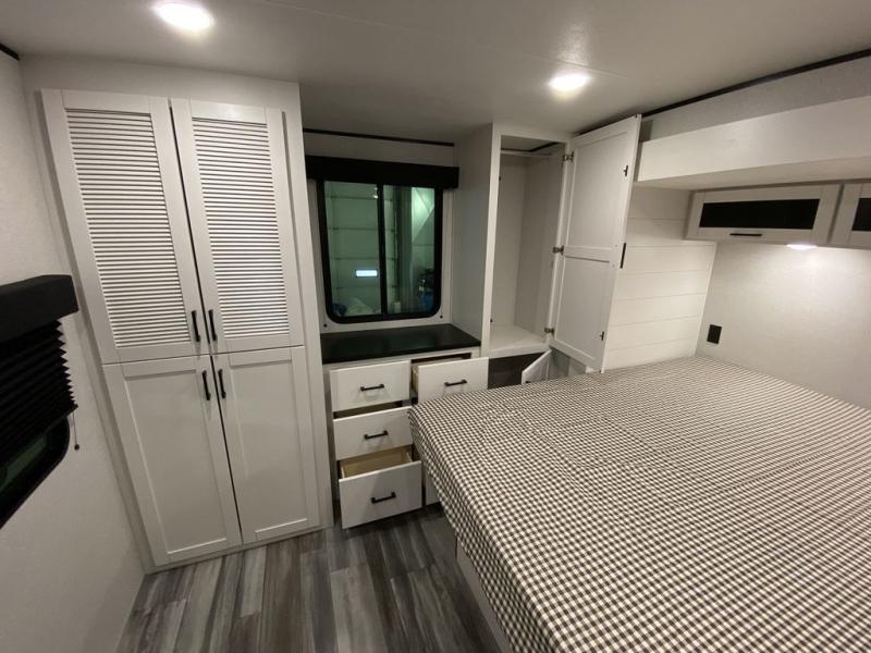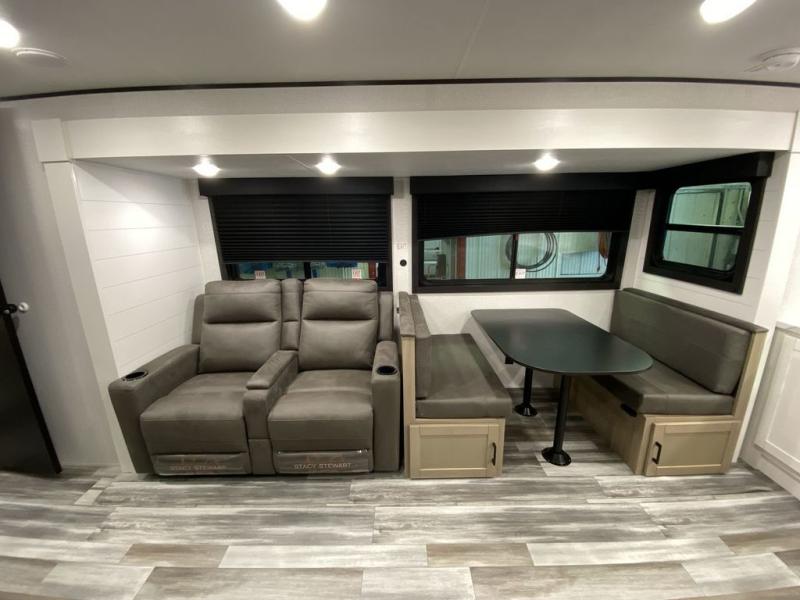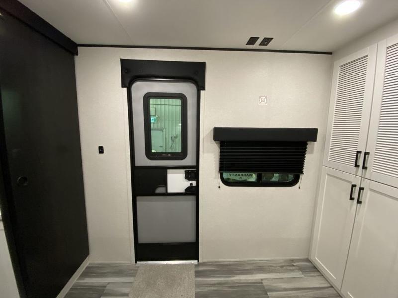 This front kitchen travel trailer is perfect for weekend trips or extended stays at the location of your choice! You'll love the ample counter space to prep meals, and there is a booth dinette where you can dine together each day. A theater seat is in great view of the entertainment center if you want to add a TV, or you may just find yourselves outdoors under the 20' power awning. This unit features a dual entry bath with a private entrance into the rear master bedroom. This room also includes a queen bed slide, a wardrobe and two dressers, plus additional storage with washer and dryer prep. And one of the dual entry doors is found here so you can slip out in the morning for some early fishing!