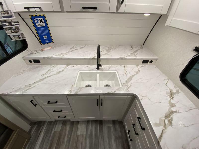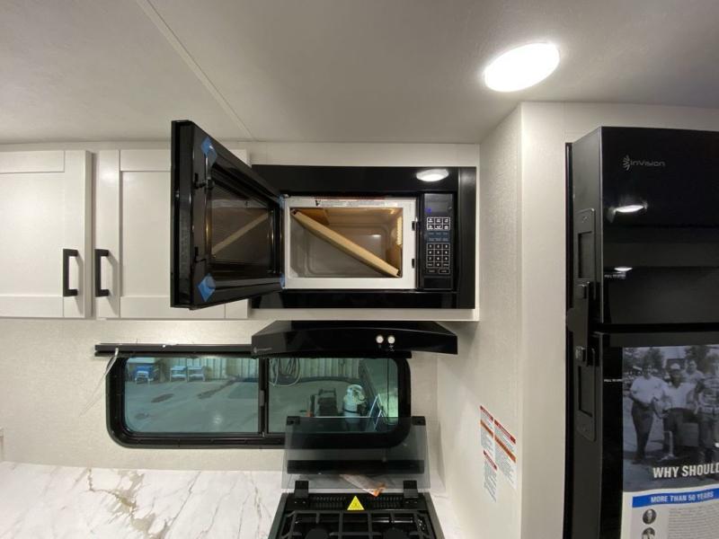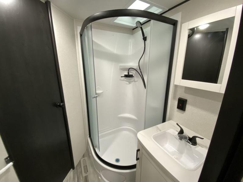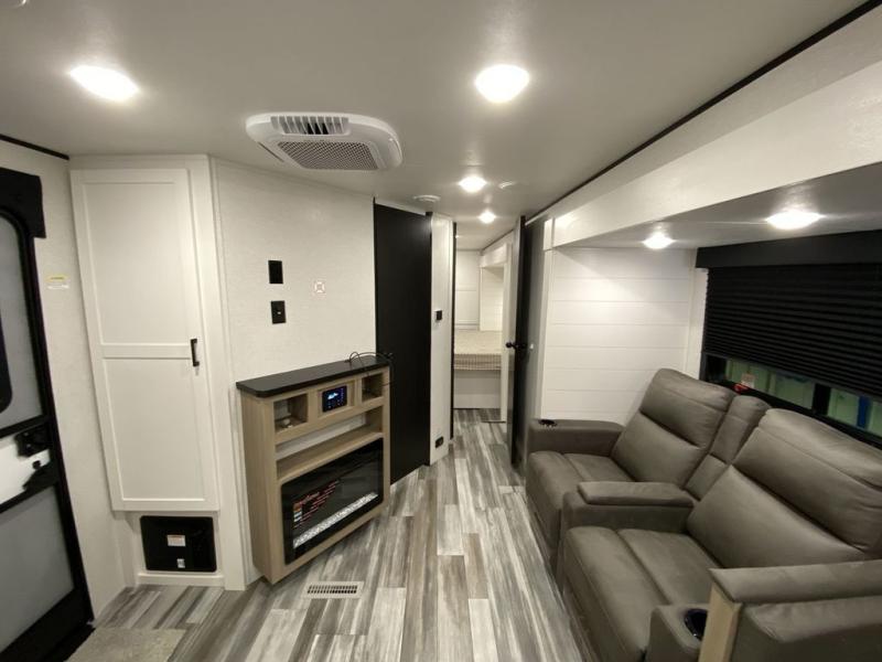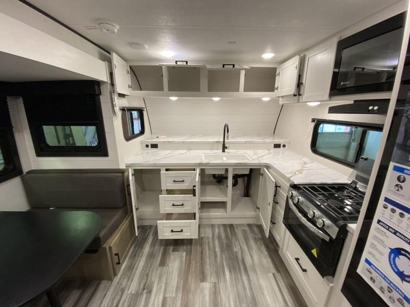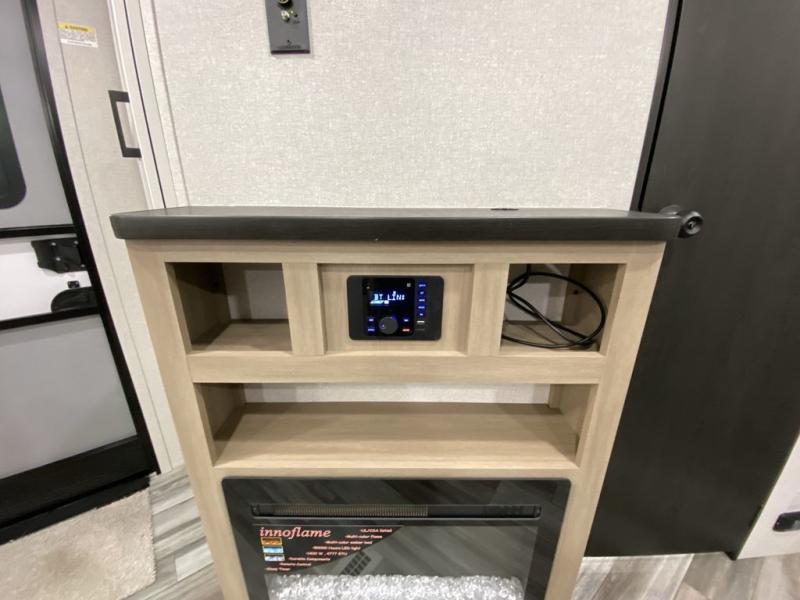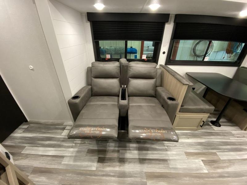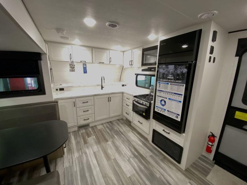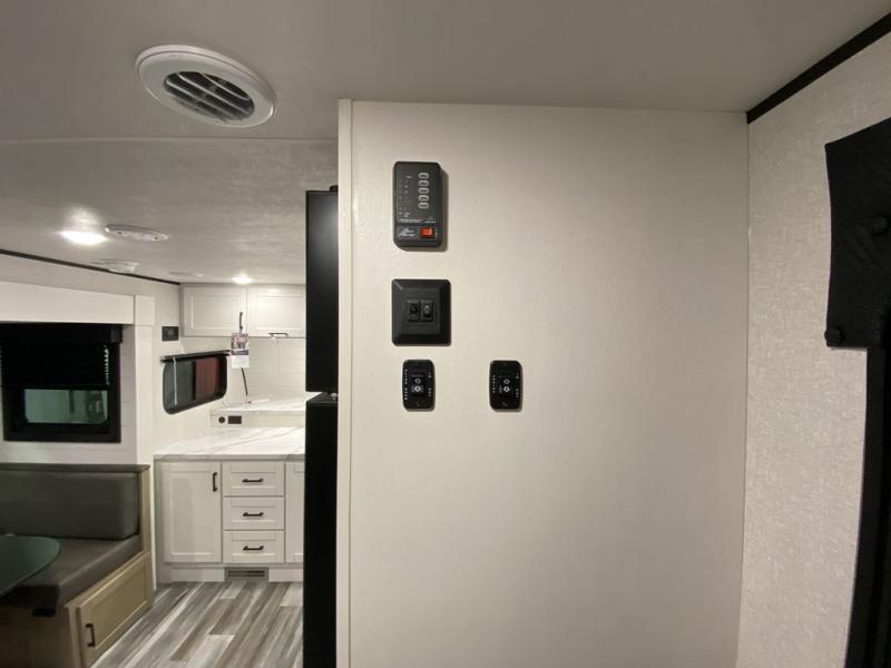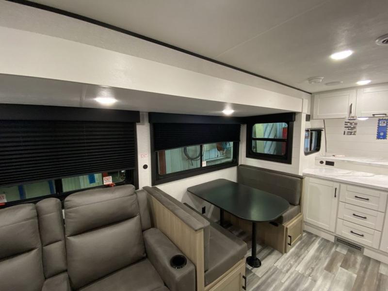 This front kitchen travel trailer is perfect for weekend trips or extended stays at the location of your choice! You'll love the ample counter space to prep meals, and there is a booth dinette where you can dine together each day. A theater seat is in great view of the entertainment center if you want to add a TV, or you may just find yourselves outdoors under the 20' power awning. This unit features a dual entry bath with a private entrance into the rear master bedroom. This room also includes a queen bed slide, a wardrobe and two dressers, plus additional storage with washer and dryer prep. And one of the dual entry doors is found here so you can slip out in the morning for some early fishing!