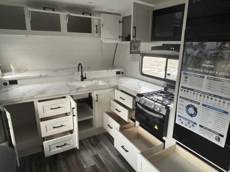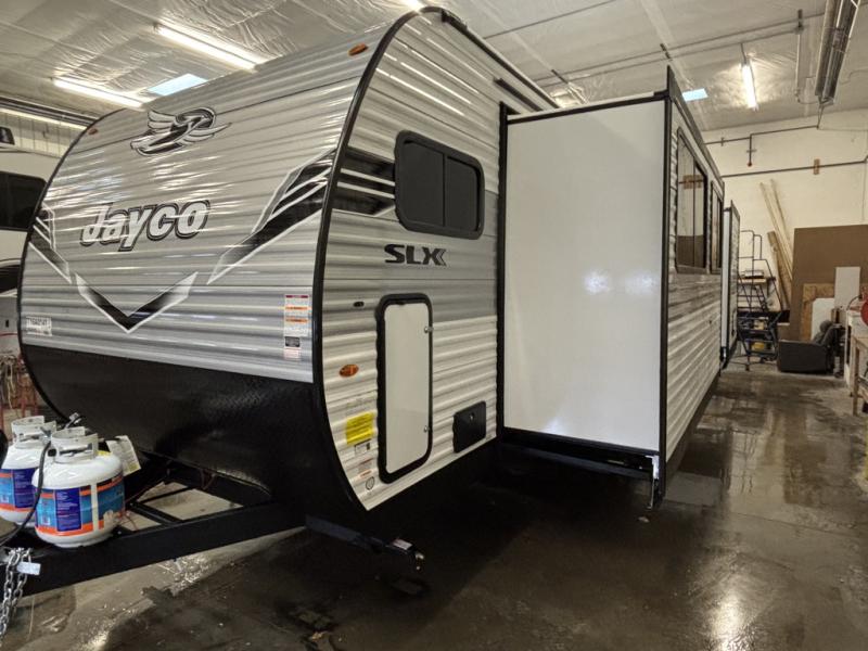 The Jayco Jay Flight SLX travel trailer is quite easy to own because it is lightweight for an easier towing experience. Built on a fully integrated A-frame with galvanized-steel, impact-resistant wheel wells, the Jay Flight SLX has quality at its very foundation. That quality continues on to the electric self-adjusting brakes, easy-lube hubs, Magnum Truss roof system, and LP quick connect. Some of what the mandatory Customer Value Package includes is backup camera prep, Keyed-Alike entry and baggage doors, and an on-demand tankless water heater.