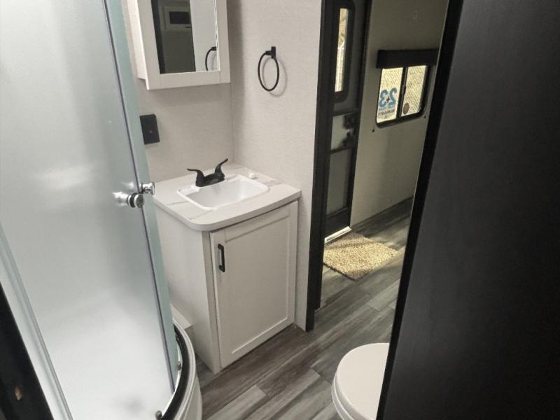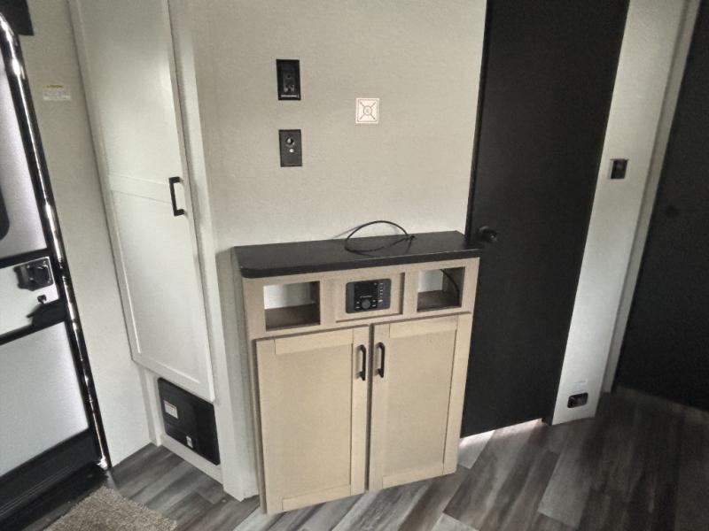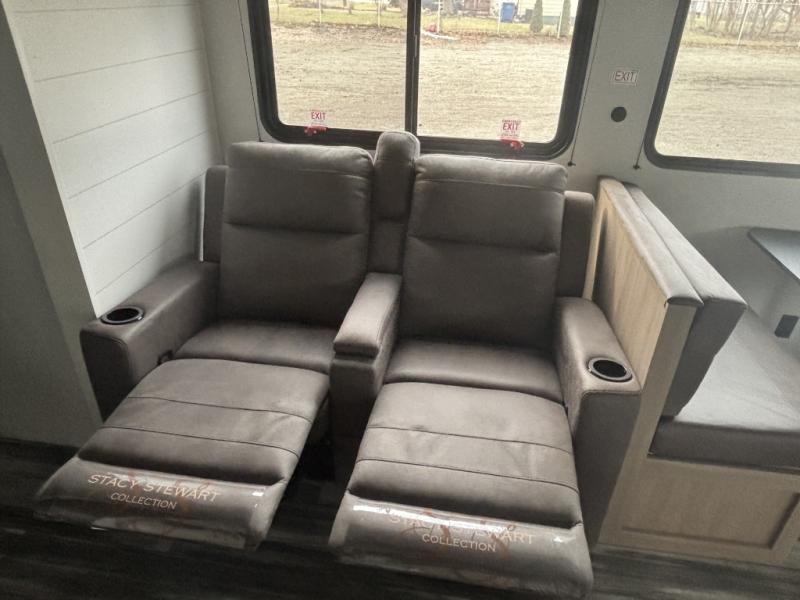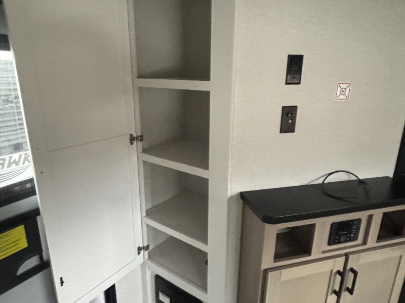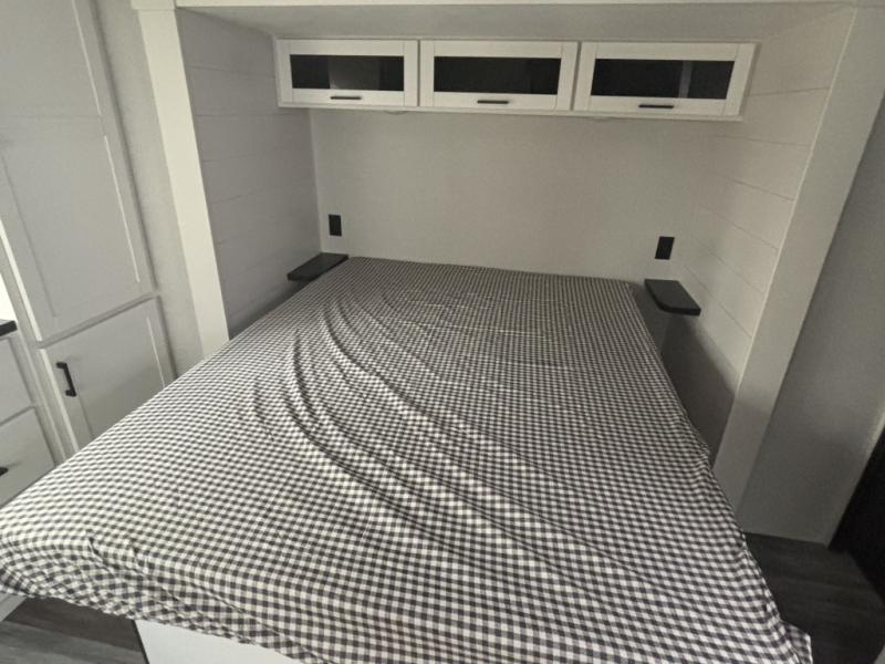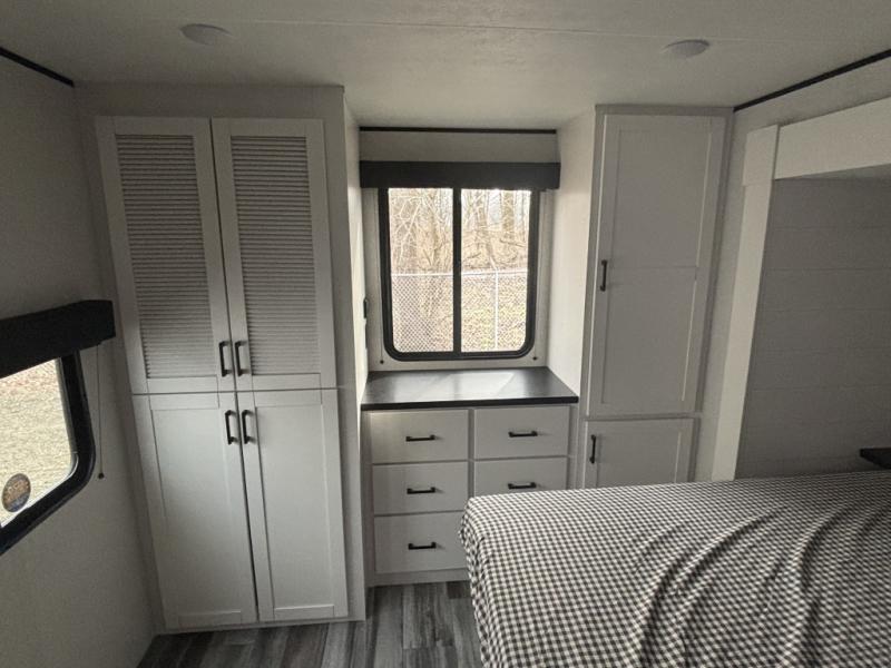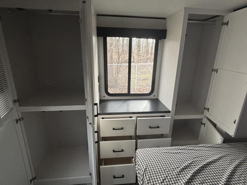 This front kitchen travel trailer is perfect for weekend trips or extended stays at the location of your choice! You'll love the ample counter space to prep meals, and there is a booth dinette where you can dine together each day. A theater seat is in great view of the entertainment center if you want to add a TV, or you may just find yourselves outdoors under the 20' power awning. This unit features a dual entry bath with a private entrance into the rear master bedroom. This room also includes a queen bed slide, a wardrobe and two dressers, plus additional storage with washer and dryer prep. And one of the dual entry doors is found here so you can slip out in the morning for some early fishing!