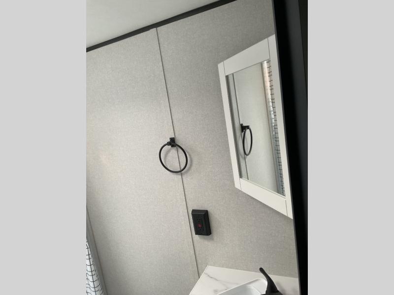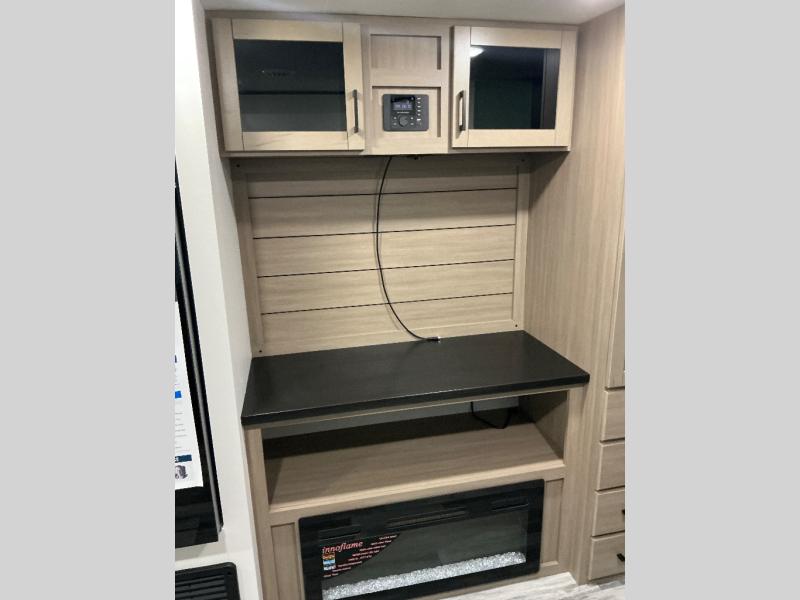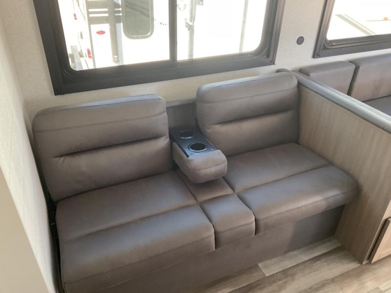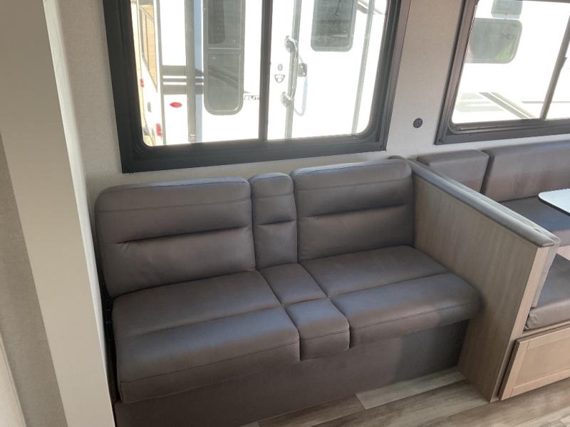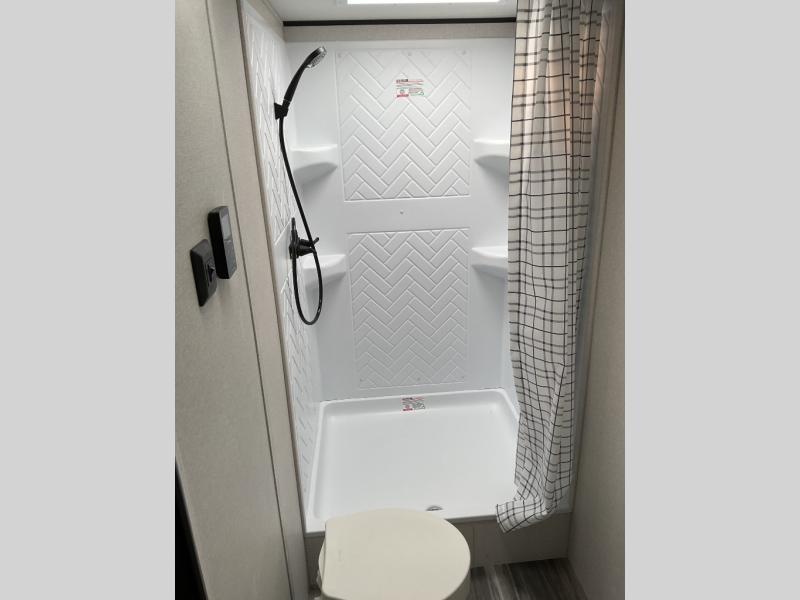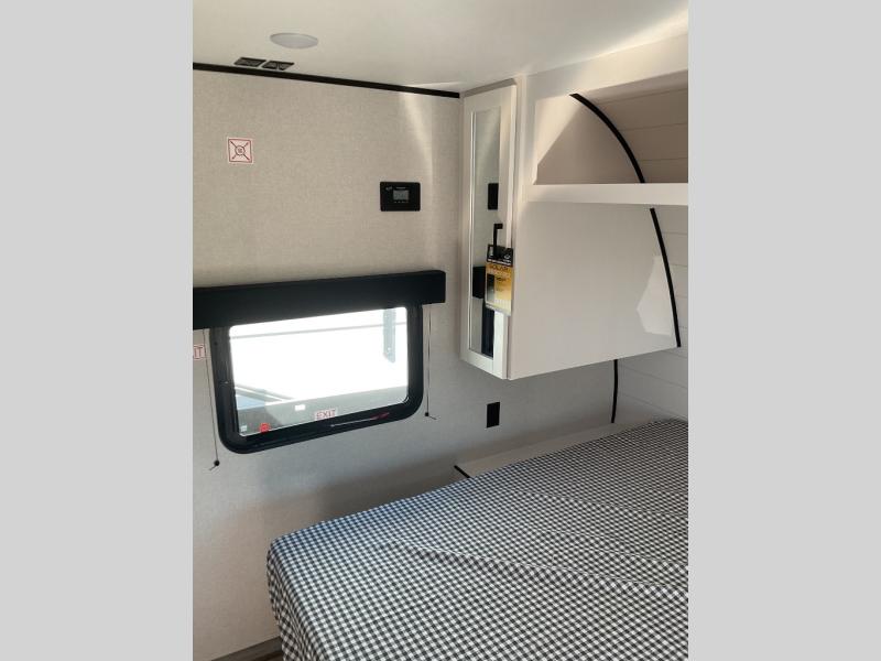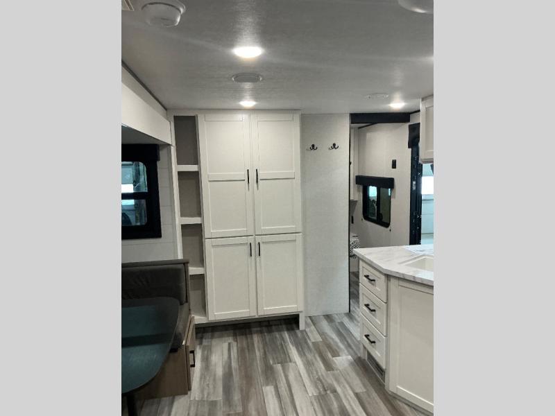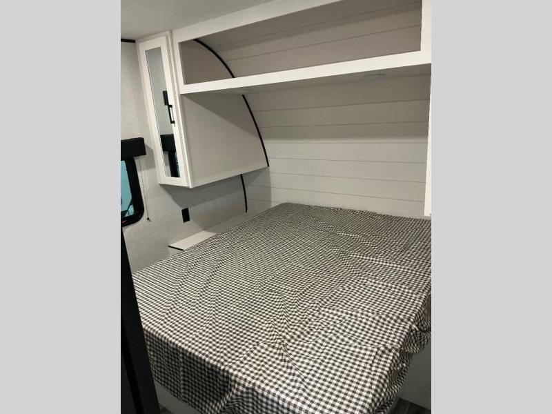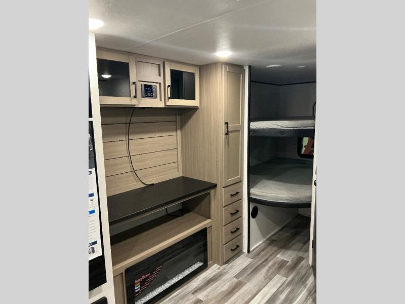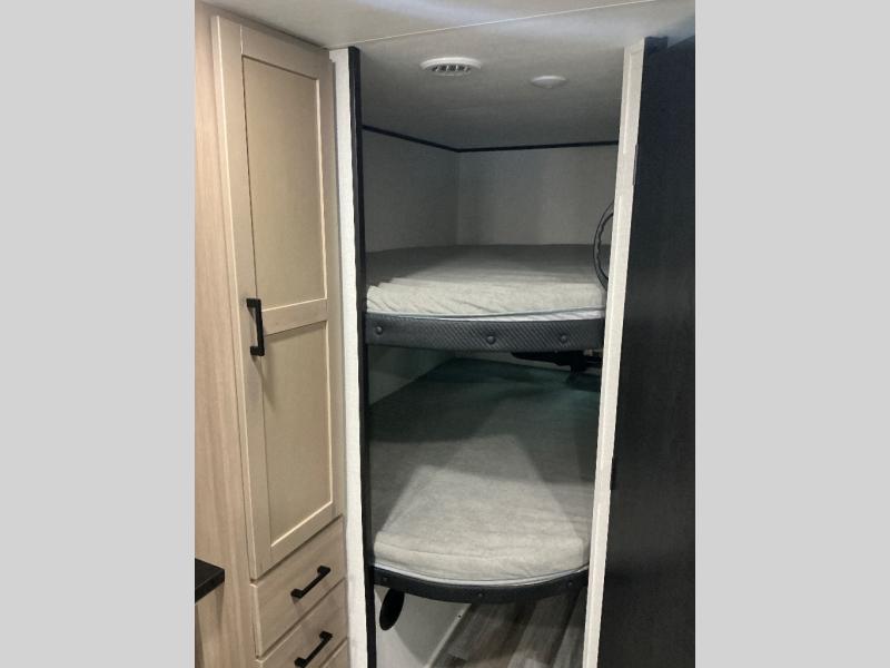 Loads of fun like hiking, fishing, and playing outdoor camping games are waiting for you to make that reservation, hitch up and head out! This trailer allows the owners to sleep in privacy behind the space saving sliding door on a 60" x 75" queen bed. And the kids or grandkids can sleep on the double-size bunks in the rear next to the full bathroom including a tub/shower. They even have a wardrobe nearby for their things. The slide out jackknife sofa and U-shaped dinette offers more floor space, a place to relax and dine, plus you can play games at the dinette. This model also includes an exterior refrigerator so you can grab a cold drink while under the 16' power awning!