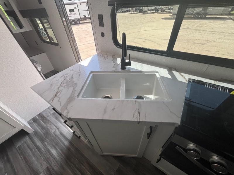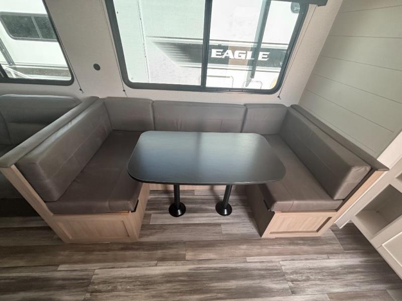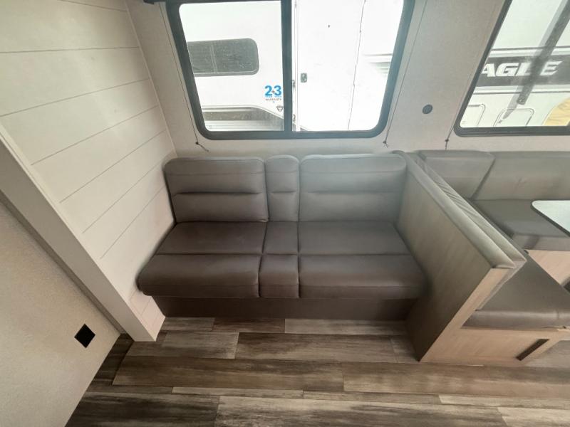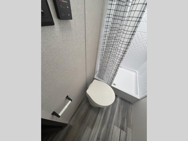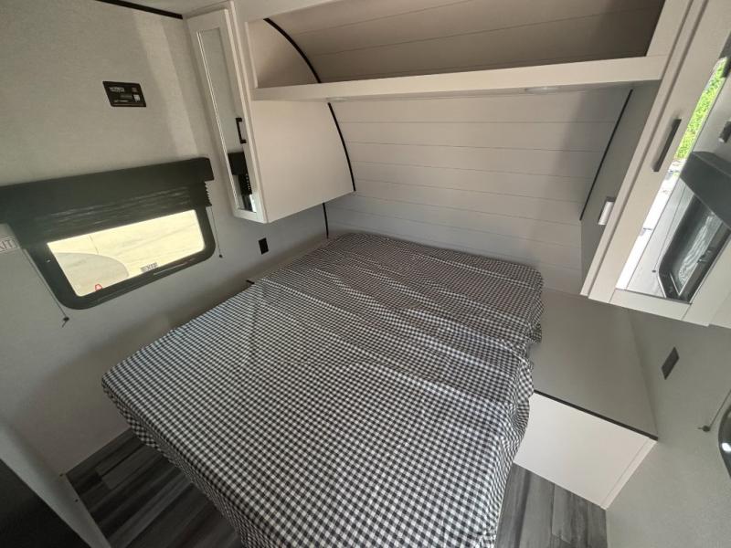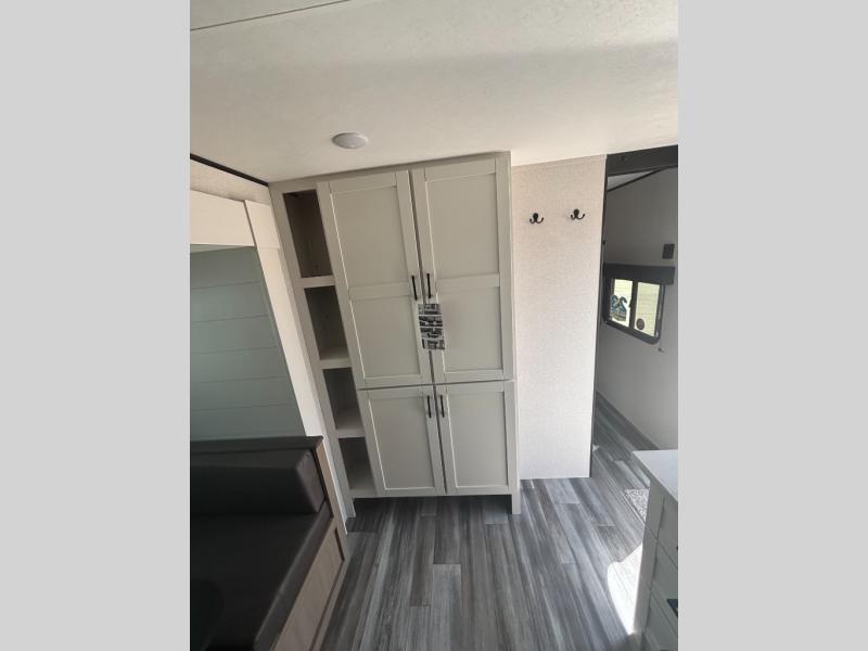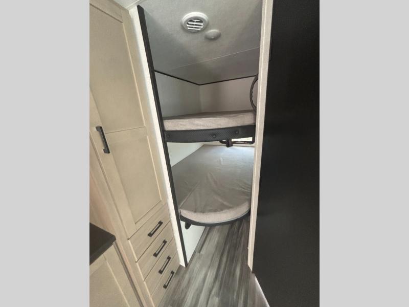 Comfort and fun is waiting for you! This trailer allows the owners to sleep in privacy behind the space saving sliding door on a 60" x 75" queen bed. And the kids or grandkids can sleep on the double-size bunks in the rear next to the full bathroom including a shower. They even have a wardrobe nearby for their things. The slide out jackknife sofa and U-shaped dinette offers more floor space, a place to relax and dine, plus you can play games at the dinette. This model also includes an exterior refrigerator so you can grab a cold drink while under the 16' power awning!