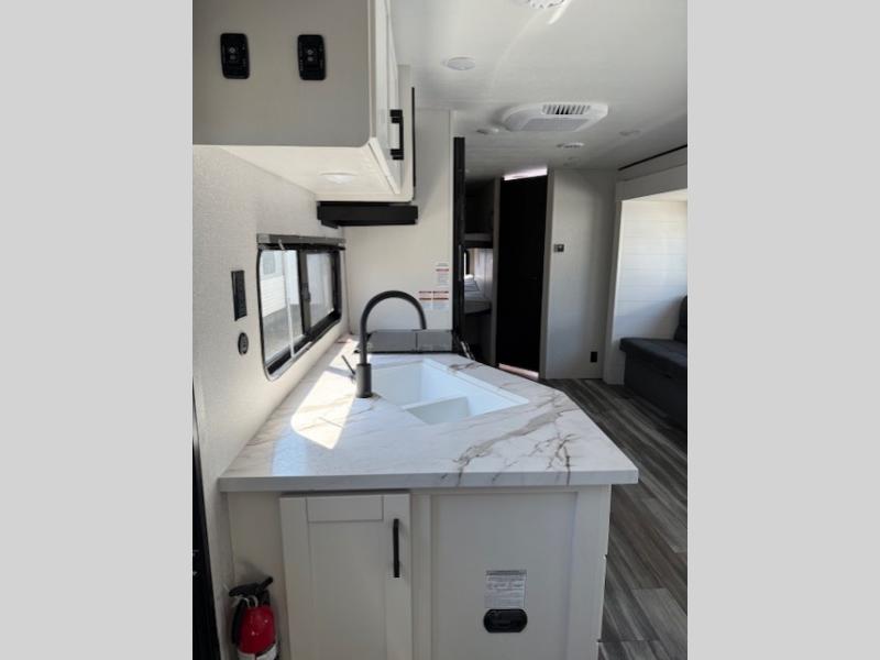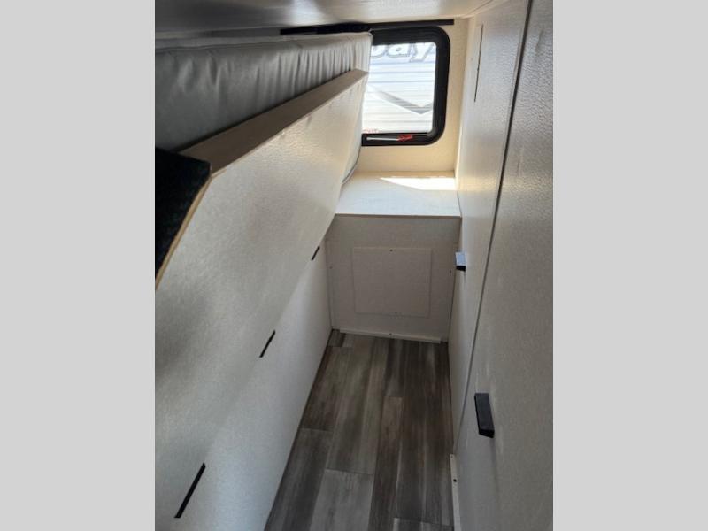 Comfort and fun is waiting for you! This trailer allows the owners to sleep in privacy behind the space saving sliding door on a 60" x 75" queen bed. And the kids or grandkids can sleep on the double-size bunks in the rear next to the full bathroom including a shower. They even have a wardrobe nearby for their things. The slide out jackknife sofa and U-shaped dinette offers more floor space, a place to relax and dine, plus you can play games at the dinette. This model also includes an exterior refrigerator so you can grab a cold drink while under the 16' power awning!