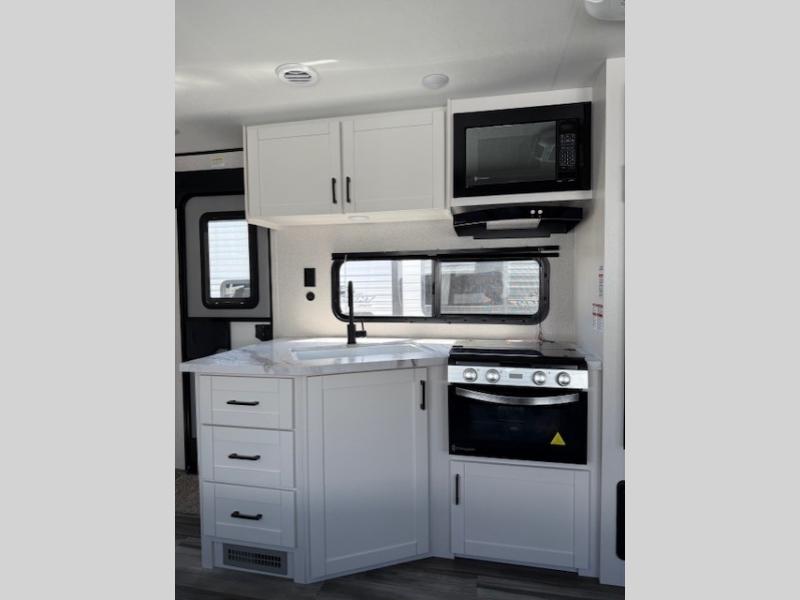 The Jayco Jay Flight SLX travel trailer is quite easy to own because it is lightweight for an easier towing experience. Built on a fully integrated A-frame with galvanized-steel, impact-resistant wheel wells, the Jay Flight SLX has quality at its very foundation. That quality continues on to the electric self-adjusting brakes, easy-lube hubs, Magnum Truss roof system, and LP quick connect. Some of what the mandatory Customer Value Package includes is backup camera prep, Keyed-Alike entry and baggage doors, and an on-demand tankless water heater.