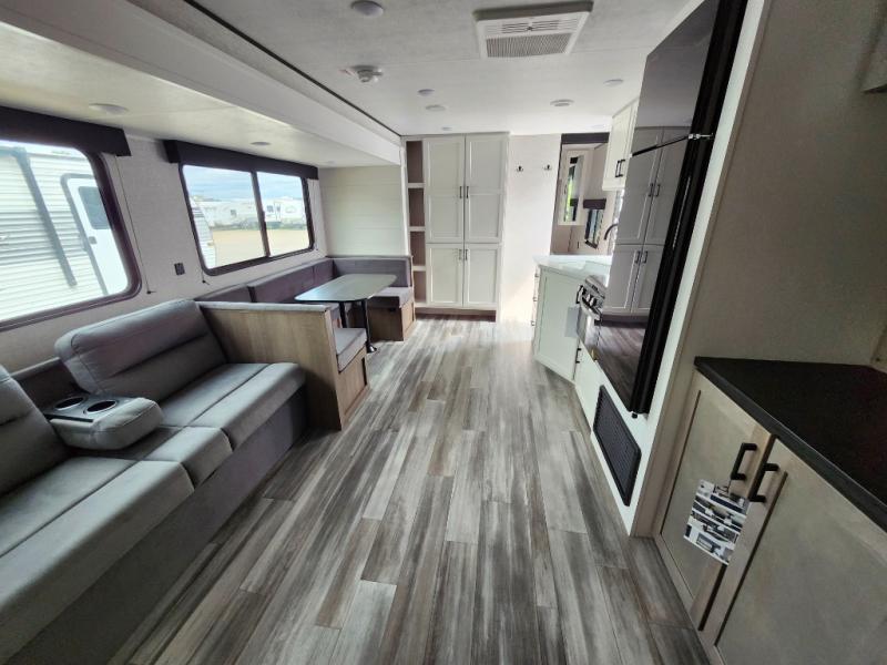 Comfort and fun is waiting for you! This trailer allows the owners to sleep in privacy behind the space saving sliding door on a 60" x 75" queen bed. And the kids or grandkids can sleep on the double-size bunks in the rear next to the full bathroom including a shower. They even have a wardrobe nearby for their things. The slide out jackknife sofa and U-shaped dinette offers more floor space, a place to relax and dine, plus you can play games at the dinette. This model also includes an exterior refrigerator so you can grab a cold drink while under the 16' power awning!