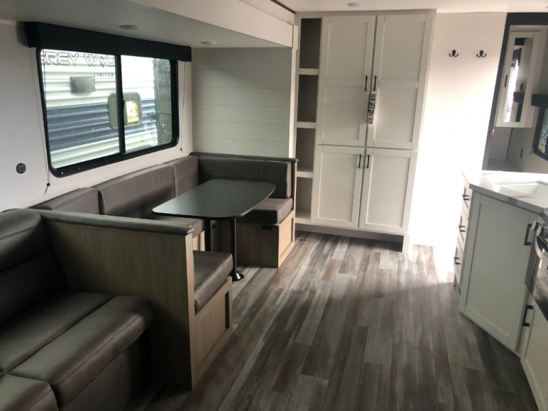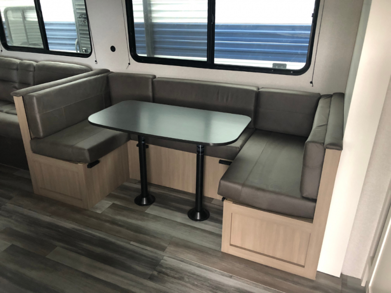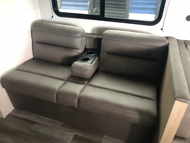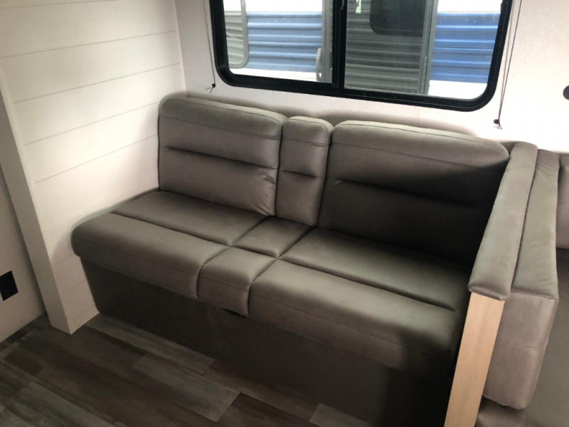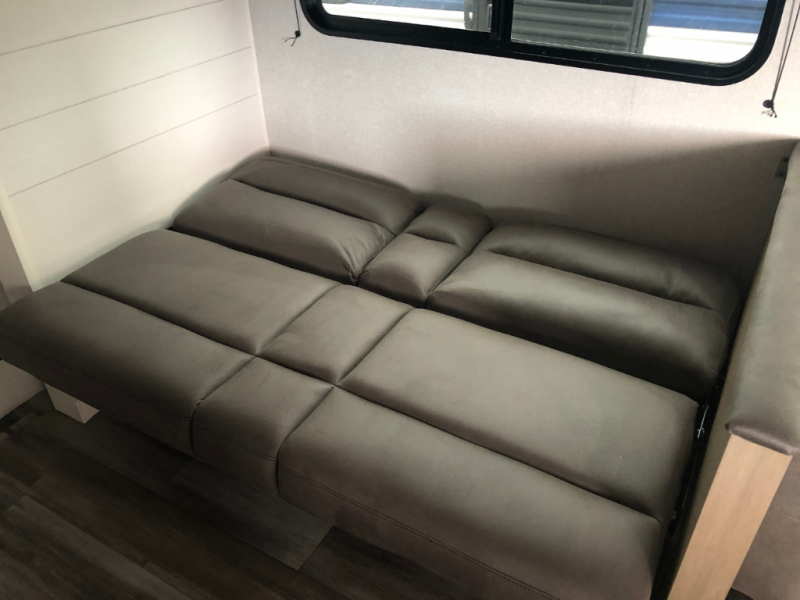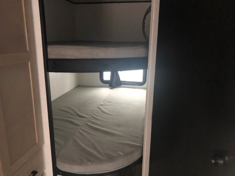 Comfort and fun is waiting for you! This trailer allows the owners to sleep in privacy behind the space saving sliding door on a 60" x 75" queen bed. And the kids or grandkids can sleep on the double-size bunks in the rear next to the full bathroom including a shower. They even have a wardrobe nearby for their things. The slide out jackknife sofa and U-shaped dinette offers more floor space, a place to relax and dine, plus you can play games at the dinette. This model also includes an exterior refrigerator so you can grab a cold drink while under the 16' power awning!