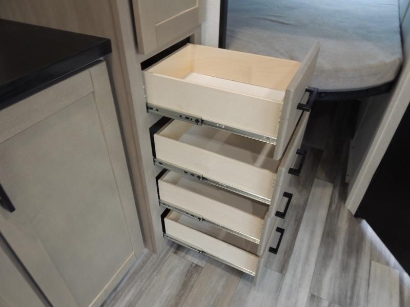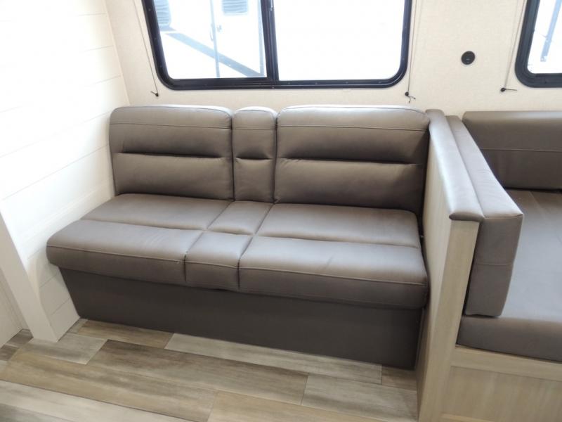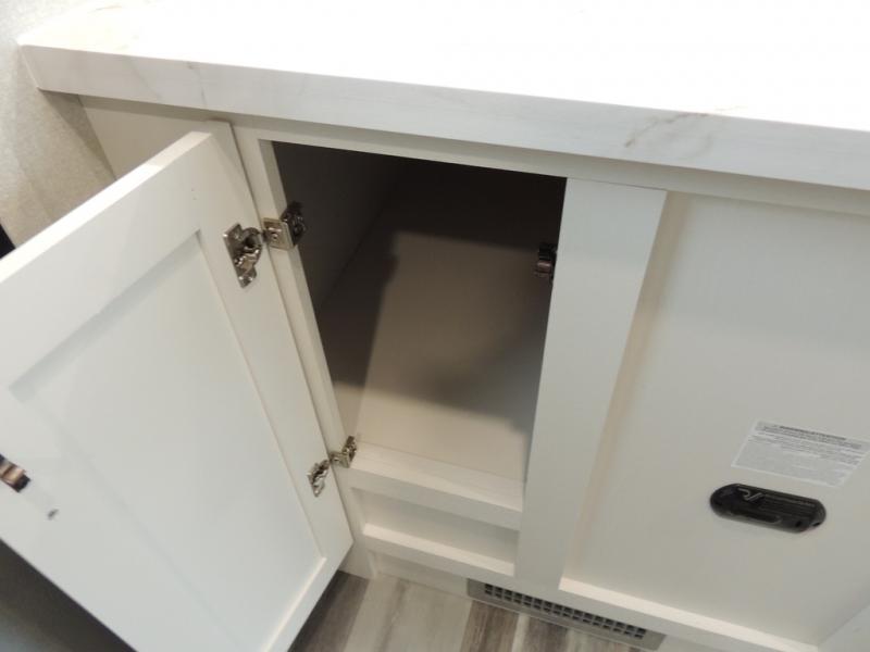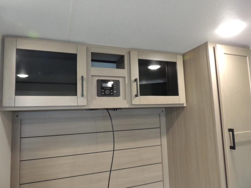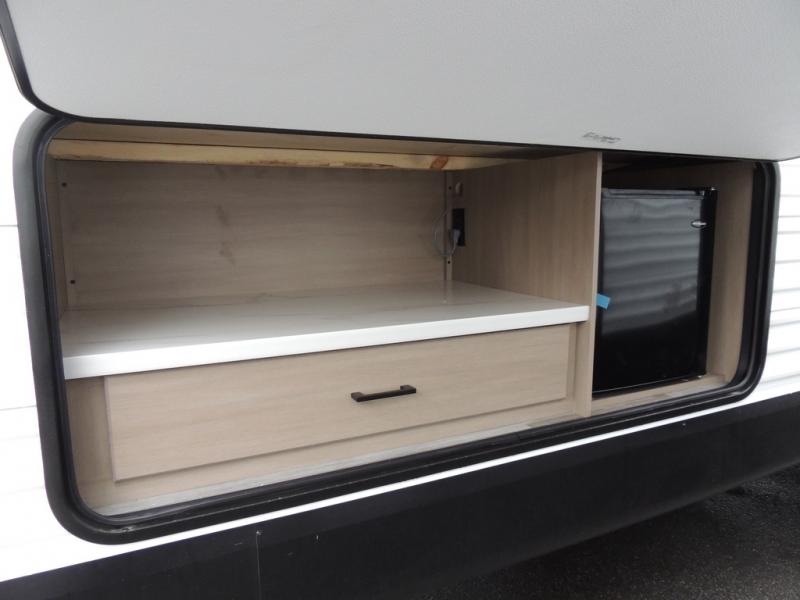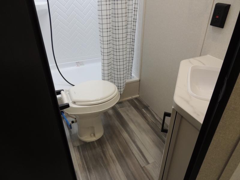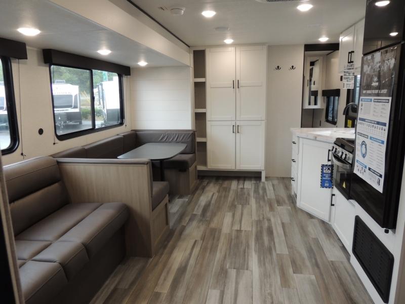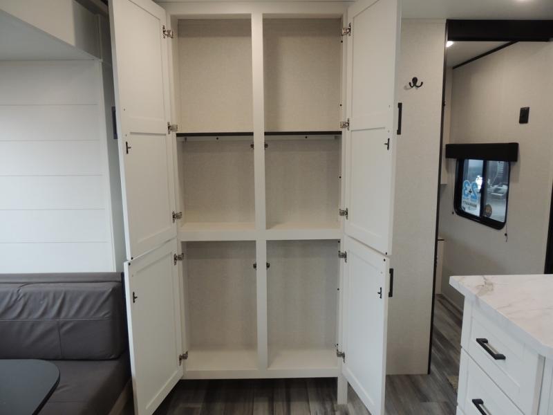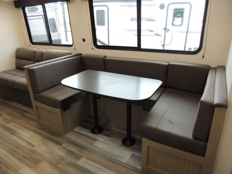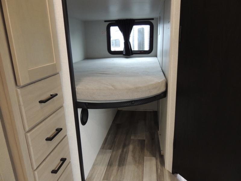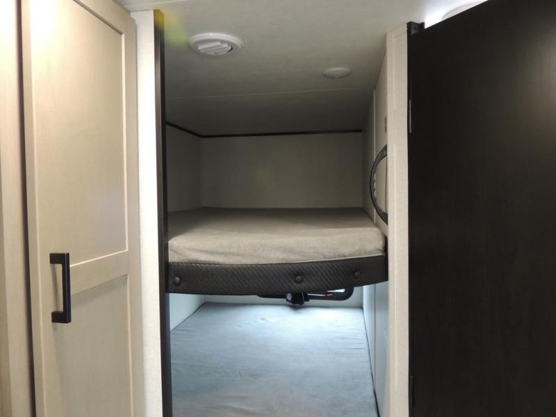 Comfort and fun is waiting for you! This trailer allows the owners to sleep in privacy behind the space saving sliding door on a 60" x 75" queen bed. And the kids or grandkids can sleep on the double-size bunks in the rear next to the full bathroom including a shower. They even have a wardrobe nearby for their things. The slide out jackknife sofa and U-shaped dinette offers more floor space, a place to relax and dine, plus you can play games at the dinette. This model also includes an exterior refrigerator so you can grab a cold drink while under the 16' power awning!