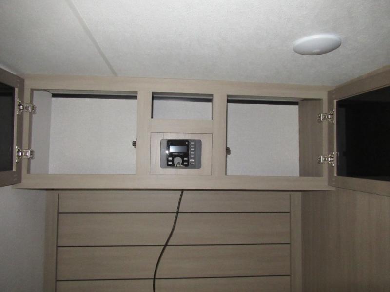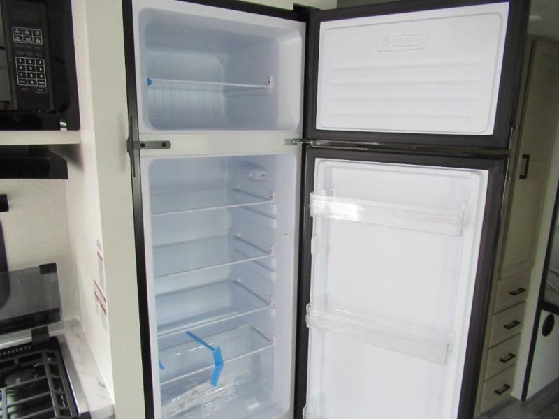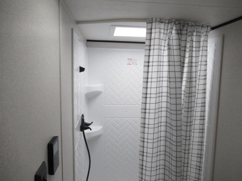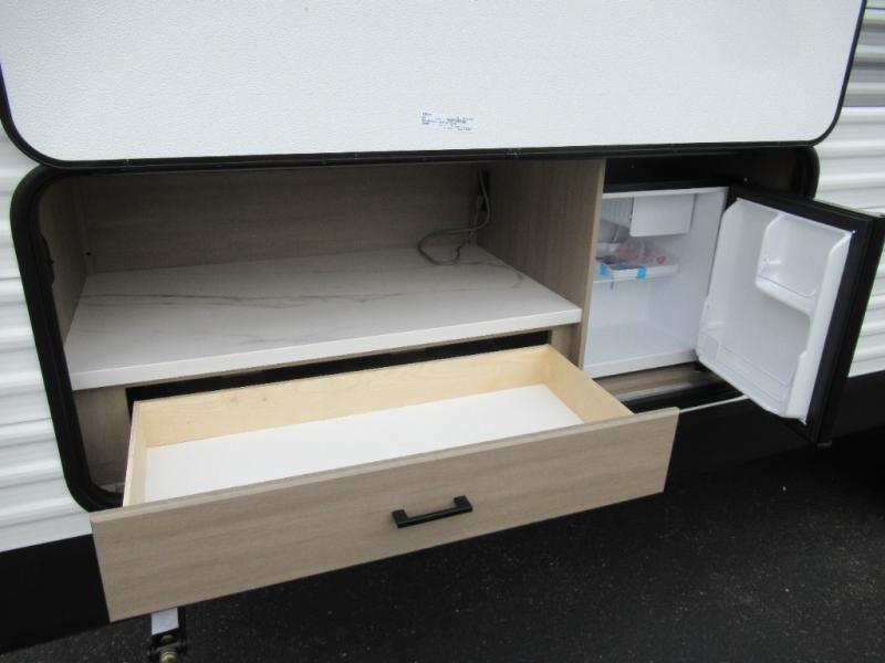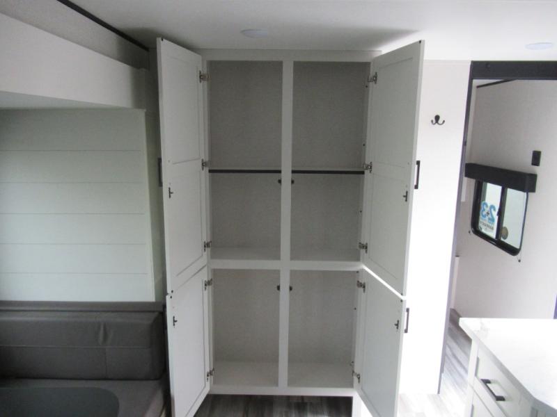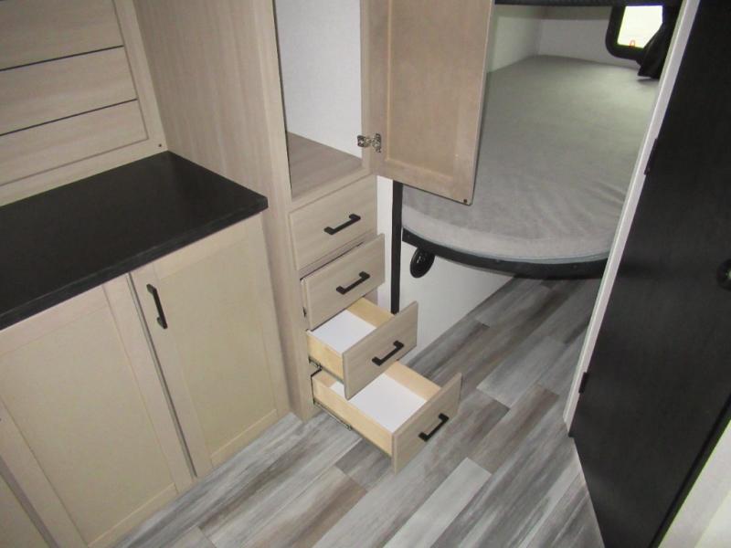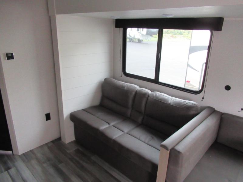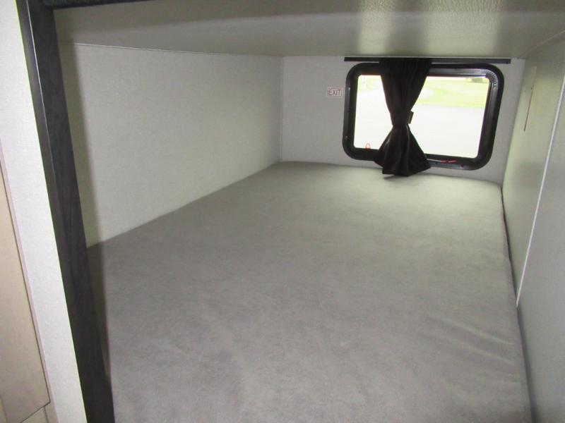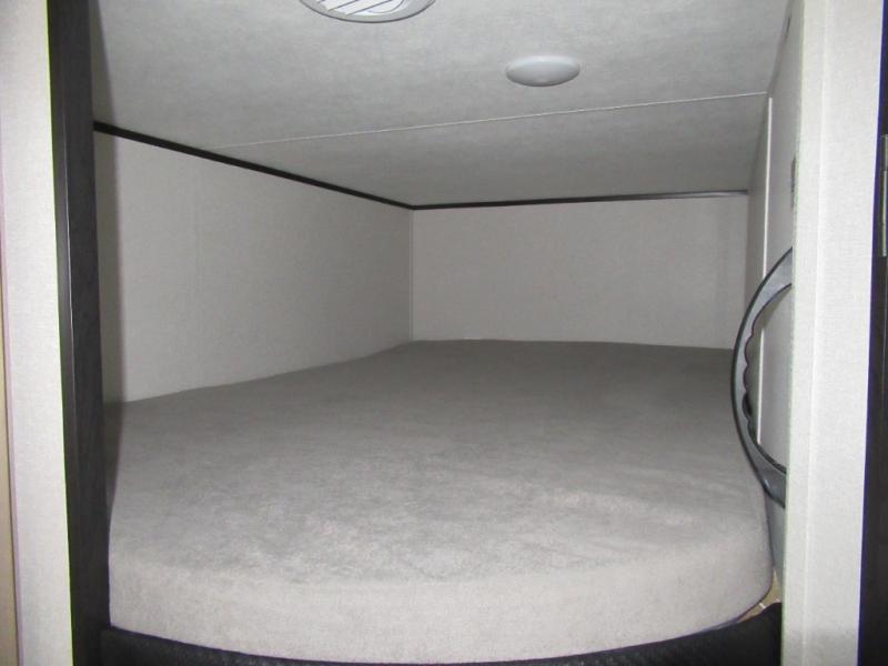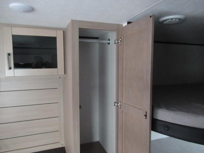 Comfort and fun is waiting for you! This trailer allows the owners to sleep in privacy behind the space saving sliding door on a 60" x 75" queen bed. And the kids or grandkids can sleep on the double-size bunks in the rear next to the full bathroom including a shower. They even have a wardrobe nearby for their things. The slide out jackknife sofa and U-shaped dinette offers more floor space, a place to relax and dine, plus you can play games at the dinette. This model also includes an exterior refrigerator so you can grab a cold drink while under the 16' power awning!