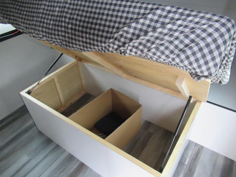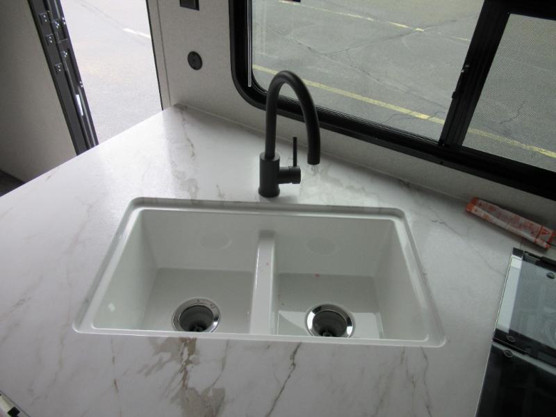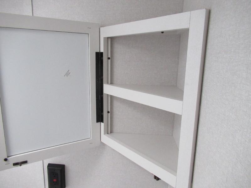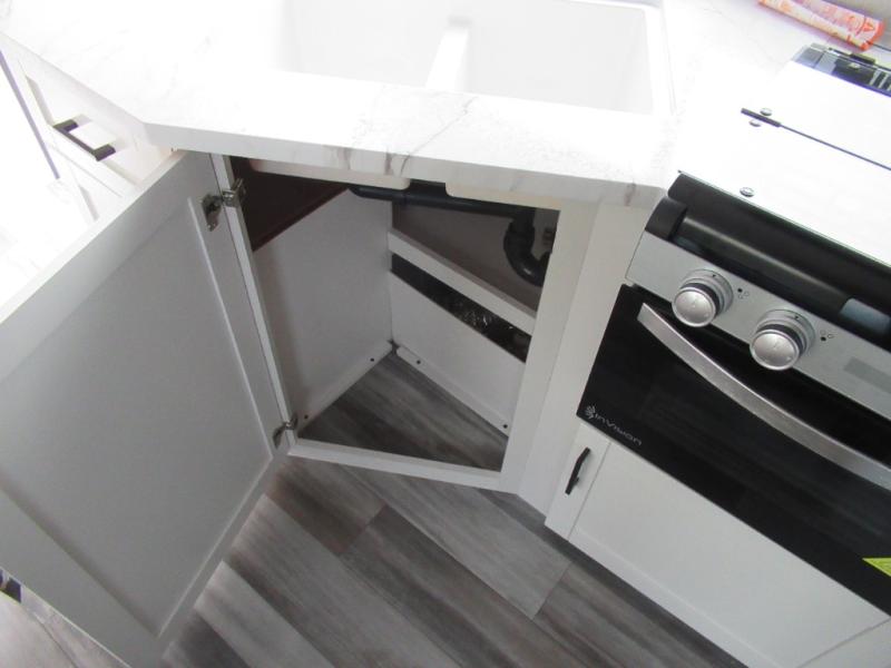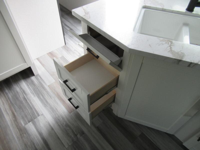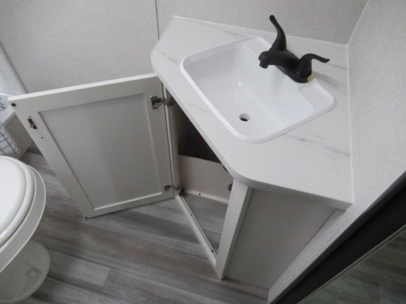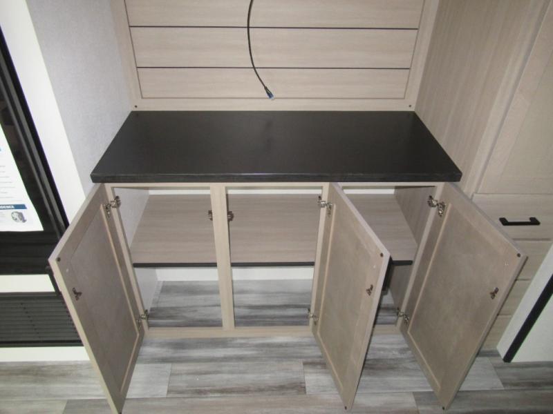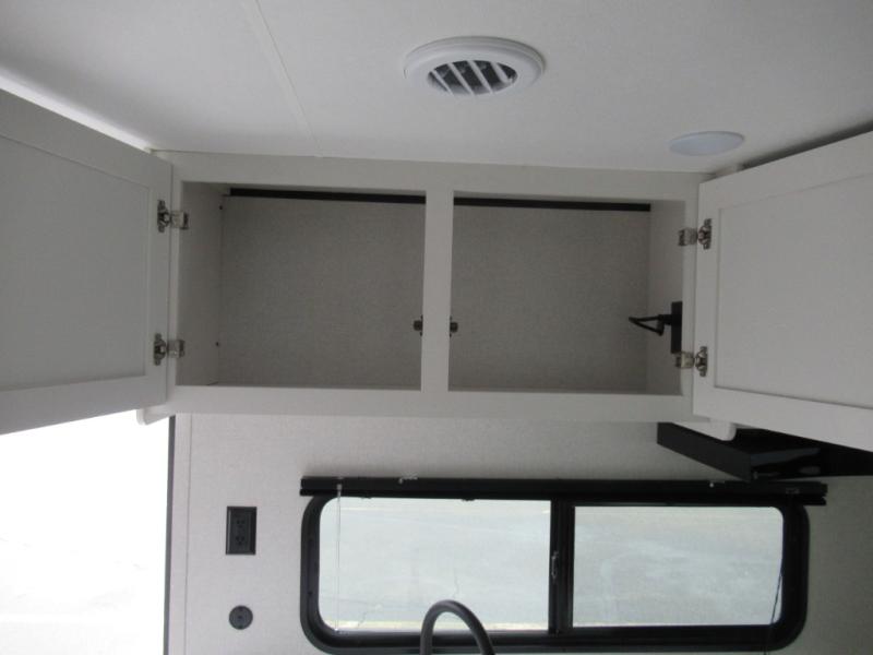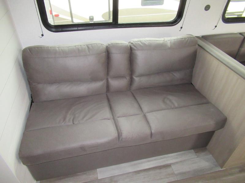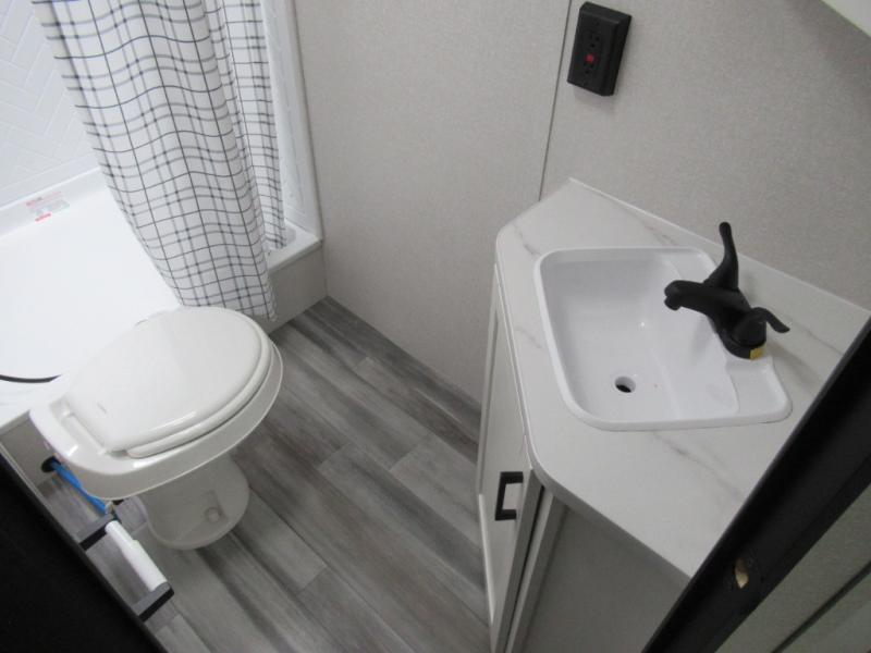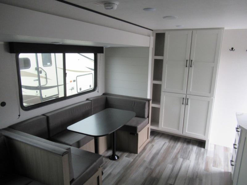 Comfort and fun is waiting for you! This trailer allows the owners to sleep in privacy behind the space saving sliding door on a 60" x 75" queen bed. And the kids or grandkids can sleep on the double-size bunks in the rear next to the full bathroom including a shower. They even have a wardrobe nearby for their things. The slide out jackknife sofa and U-shaped dinette offers more floor space, a place to relax and dine, plus you can play games at the dinette. This model also includes an exterior refrigerator so you can grab a cold drink while under the 16' power awning!