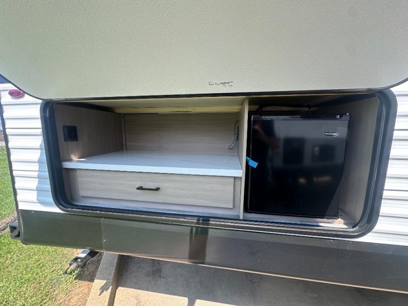 Comfort and fun is waiting for you! This trailer allows the owners to sleep in privacy behind the space saving sliding door on a 60" x 75" queen bed. And the kids or grandkids can sleep on the double-size bunks in the rear next to the full bathroom including a shower. They even have a wardrobe nearby for their things. The slide out jackknife sofa and U-shaped dinette offers more floor space, a place to relax and dine, plus you can play games at the dinette. This model also includes an exterior refrigerator so you can grab a cold drink while under the 16' power awning!