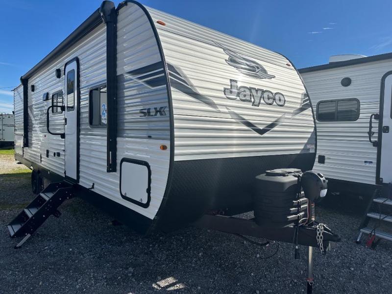 The Jayco Jay Flight SLX travel trailer is quite easy to own because it is lightweight for an easier towing experience. Built on a fully integrated A-frame with galvanized-steel, impact-resistant wheel wells, the Jay Flight SLX has quality at its very foundation. That quality continues on to the electric self-adjusting brakes, easy-lube hubs, Magnum Truss roof system, and LP quick connect. Some of what the mandatory Customer Value Package includes is backup camera prep, Keyed-Alike entry and baggage doors, and an on-demand tankless water heater.