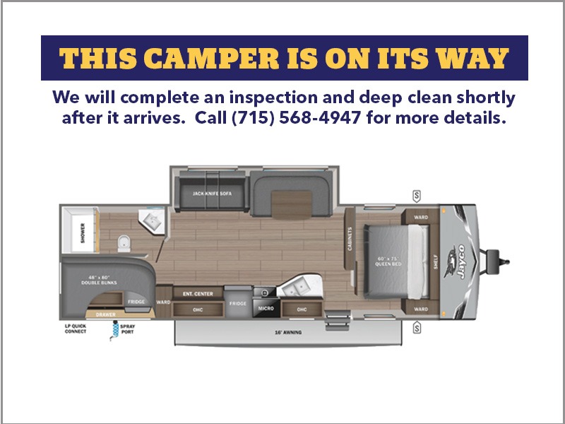 Comfort and fun is waiting for you! This trailer allows the owners to sleep in privacy behind the space saving sliding door on a 60" x 75" queen bed. And the kids or grandkids can sleep on the double-size bunks in the rear next to the full bathroom including a shower. They even have a wardrobe nearby for their things. The slide out jackknife sofa and U-shaped dinette offers more floor space, a place to relax and dine, plus you can play games at the dinette. This model also includes an exterior refrigerator so you can grab a cold drink while under the 16' power awning!