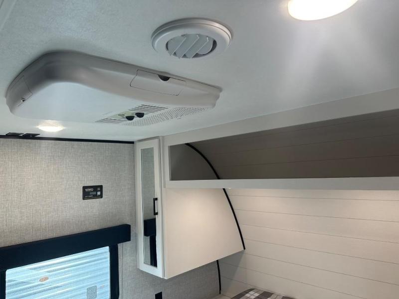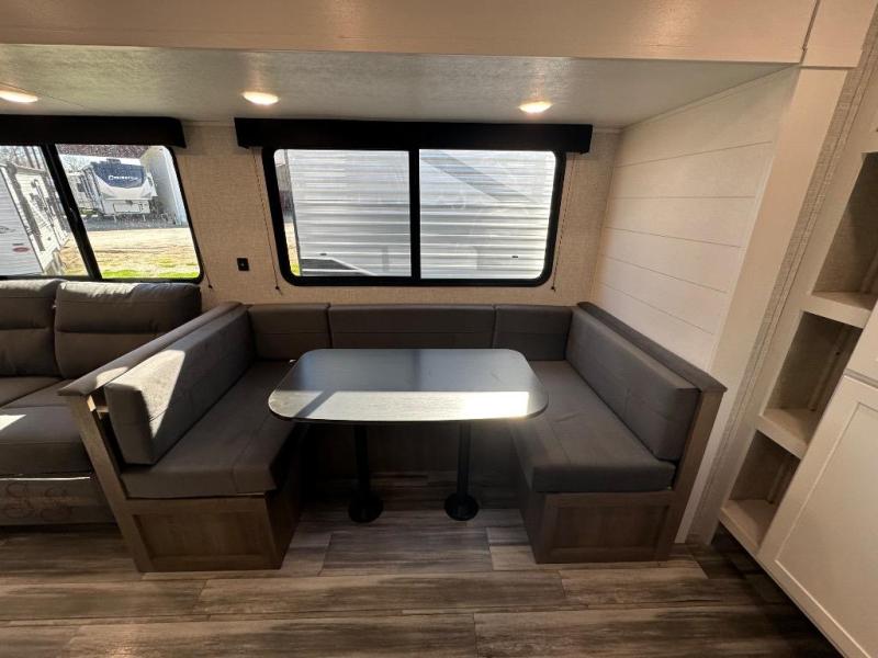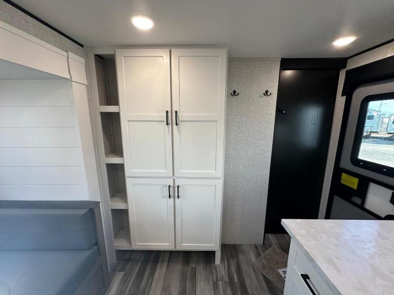 Comfort and fun is waiting for you! This trailer allows the owners to sleep in privacy behind the space saving sliding door on a 60" x 75" queen bed. And the kids or grandkids can sleep on the double-size bunks in the rear next to the full bathroom including a shower. They even have a wardrobe nearby for their things. The slide out jackknife sofa and U-shaped dinette offers more floor space, a place to relax and dine, plus you can play games at the dinette. This model also includes an exterior refrigerator so you can grab a cold drink while under the 16' power awning!