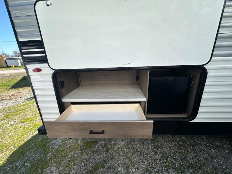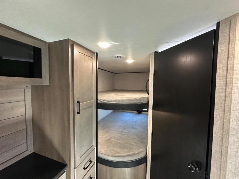 Comfort and fun is waiting for you! This trailer allows the owners to sleep in privacy behind the space saving sliding door on a 60" x 75" queen bed. And the kids or grandkids can sleep on the double-size bunks in the rear next to the full bathroom including a shower. They even have a wardrobe nearby for their things. The slide out jackknife sofa and U-shaped dinette offers more floor space, a place to relax and dine, plus you can play games at the dinette. This model also includes an exterior refrigerator so you can grab a cold drink while under the 16' power awning!