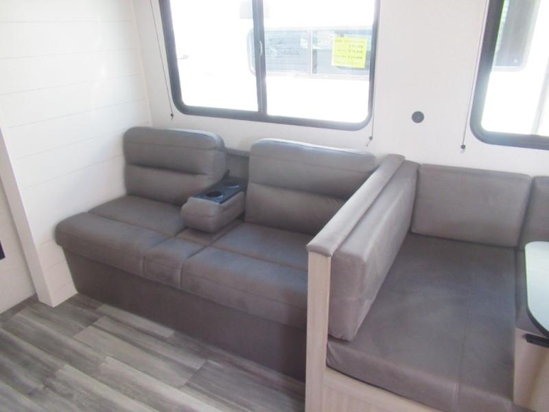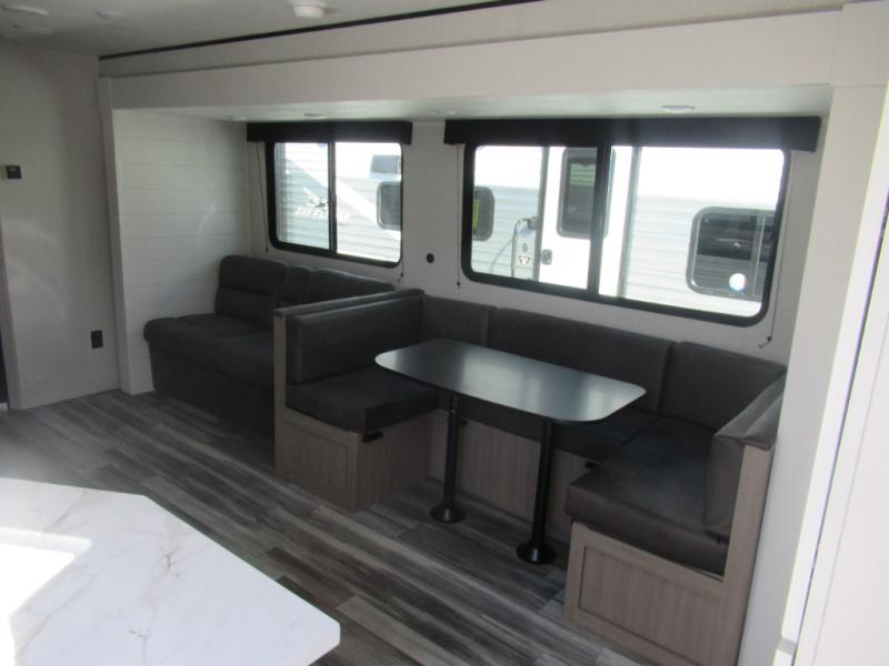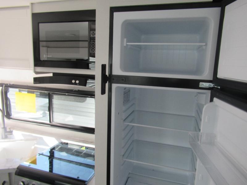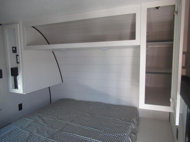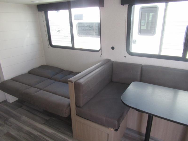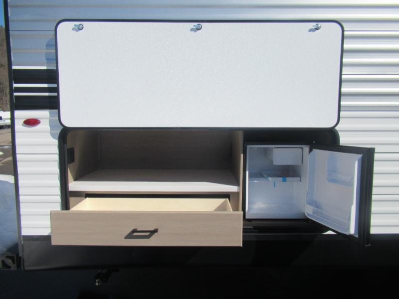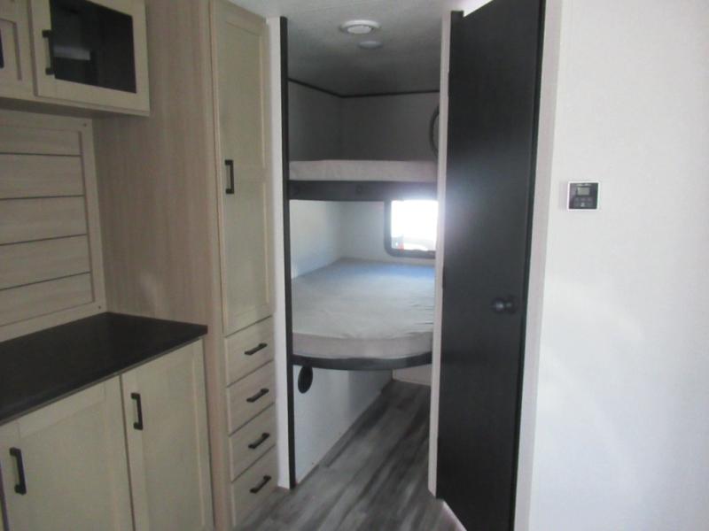 Comfort and fun is waiting for you! This trailer allows the owners to sleep in privacy behind the space saving sliding door on a 60" x 75" queen bed. And the kids or grandkids can sleep on the double-size bunks in the rear next to the full bathroom including a shower. They even have a wardrobe nearby for their things. The slide out jackknife sofa and U-shaped dinette offers more floor space, a place to relax and dine, plus you can play games at the dinette. This model also includes an exterior refrigerator so you can grab a cold drink while under the 16' power awning!