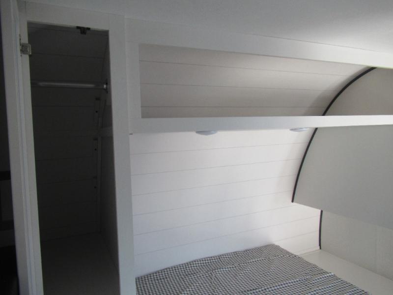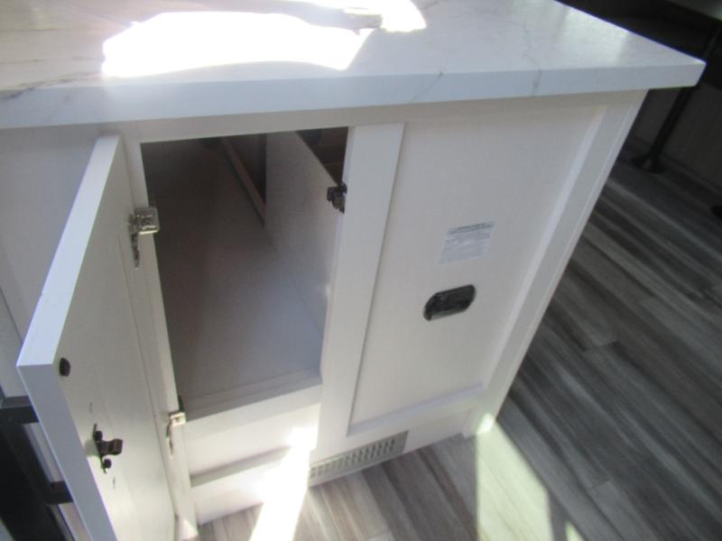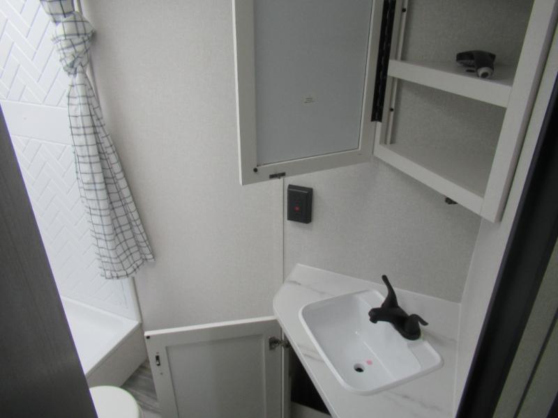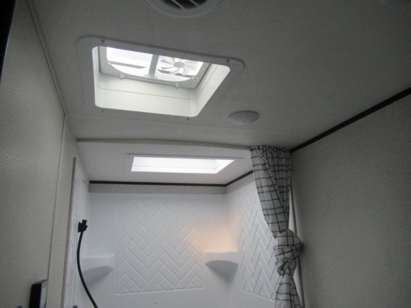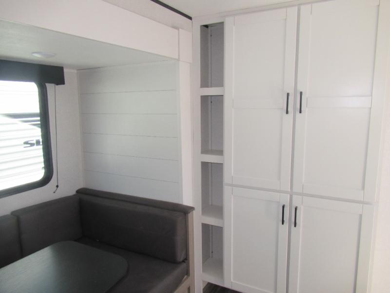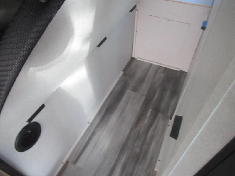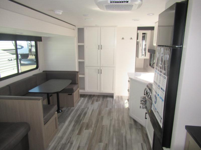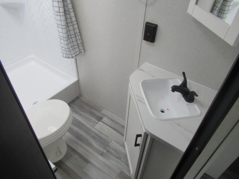 Comfort and fun is waiting for you! This trailer allows the owners to sleep in privacy behind the space saving sliding door on a 60" x 75" queen bed. And the kids or grandkids can sleep on the double-size bunks in the rear next to the full bathroom including a shower. They even have a wardrobe nearby for their things. The slide out jackknife sofa and U-shaped dinette offers more floor space, a place to relax and dine, plus you can play games at the dinette. This model also includes an exterior refrigerator so you can grab a cold drink while under the 16' power awning!