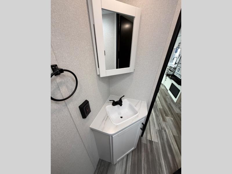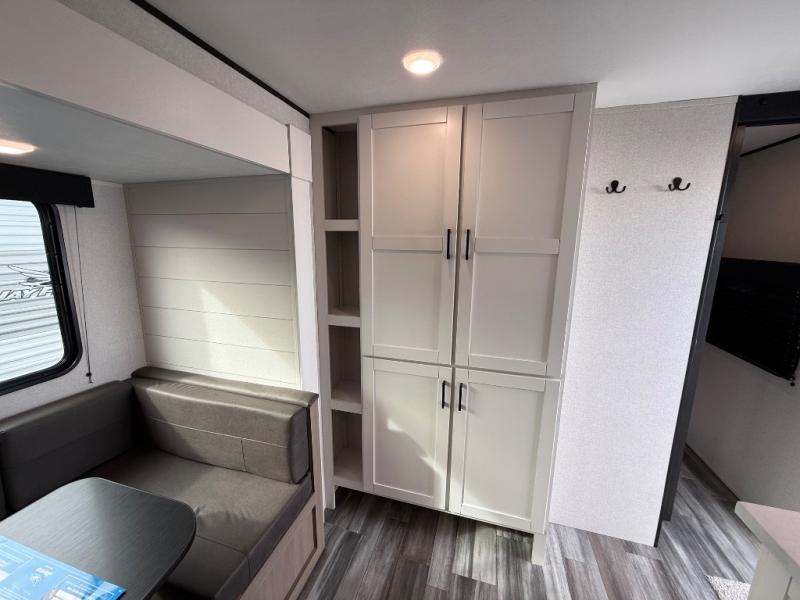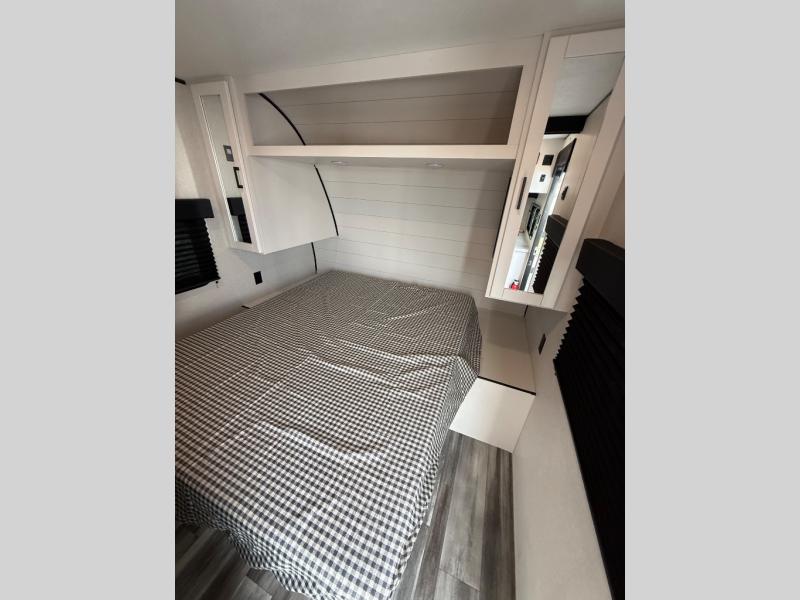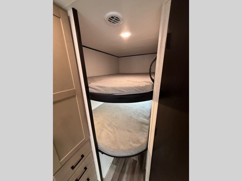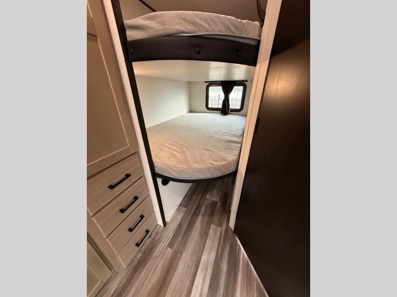 Comfort and fun is waiting for you! This trailer allows the owners to sleep in privacy behind the space saving sliding door on a 60" x 75" queen bed. And the kids or grandkids can sleep on the double-size bunks in the rear next to the full bathroom including a shower. They even have a wardrobe nearby for their things. The slide out jackknife sofa and U-shaped dinette offers more floor space, a place to relax and dine, plus you can play games at the dinette. This model also includes an exterior refrigerator so you can grab a cold drink while under the 16' power awning!