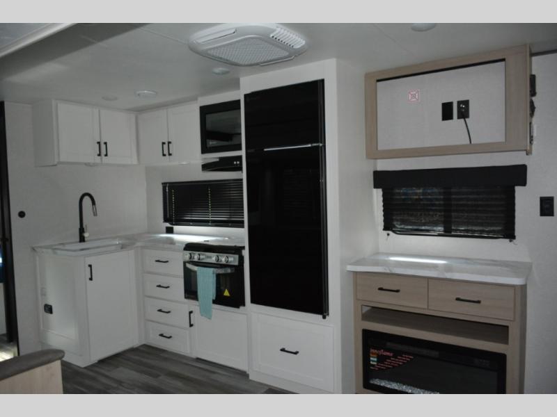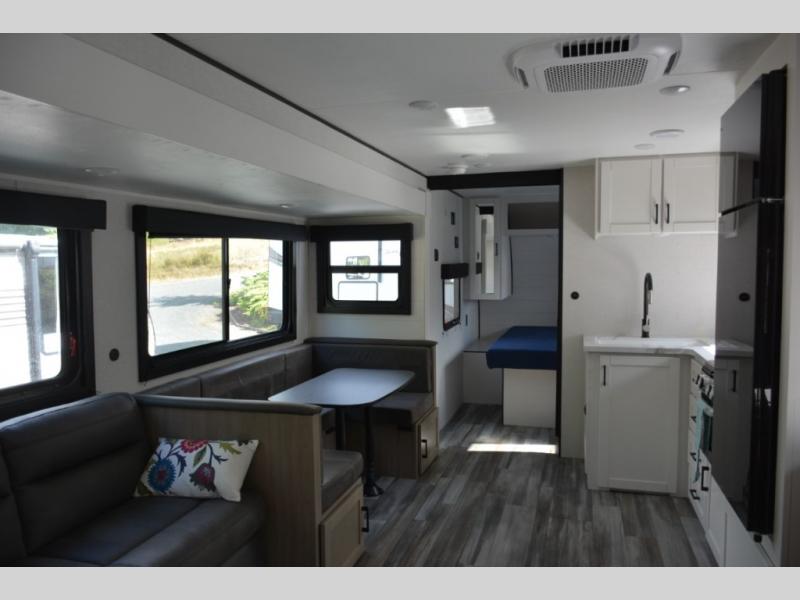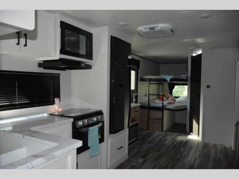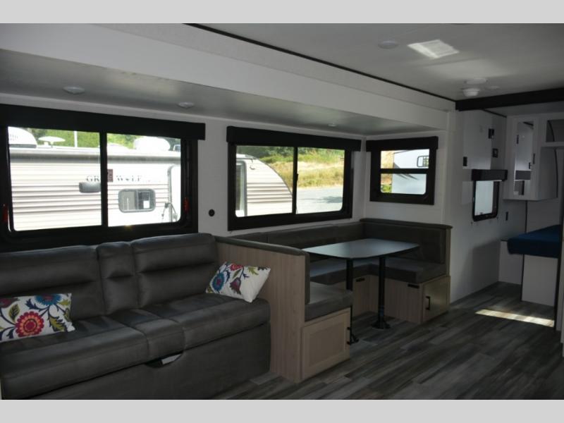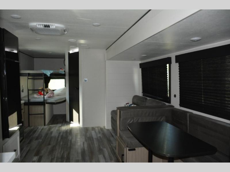 Pack your bags and load up the whole family for a fun camping experience in this travel trailer! It has a front private bedroom with a 60" x 75" queen bed to lay your head on at night, and a set of 48" x 75" bunk beds for the kids to sleep. You could even transform the U-shaped dinette and jackknife sofa slide into extra sleeping spaces for some cousins to tag along. The front bedroom also has one of the dual entry doors to the unit so you can slip away for an early morning fishing trip without waking the rest of the group. Prepare your best home cooked meals with the three burner cooktop, and stay hydrated even outside thanks to the outside refrigerator!