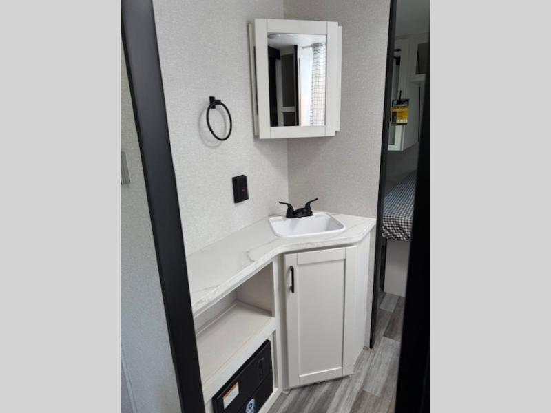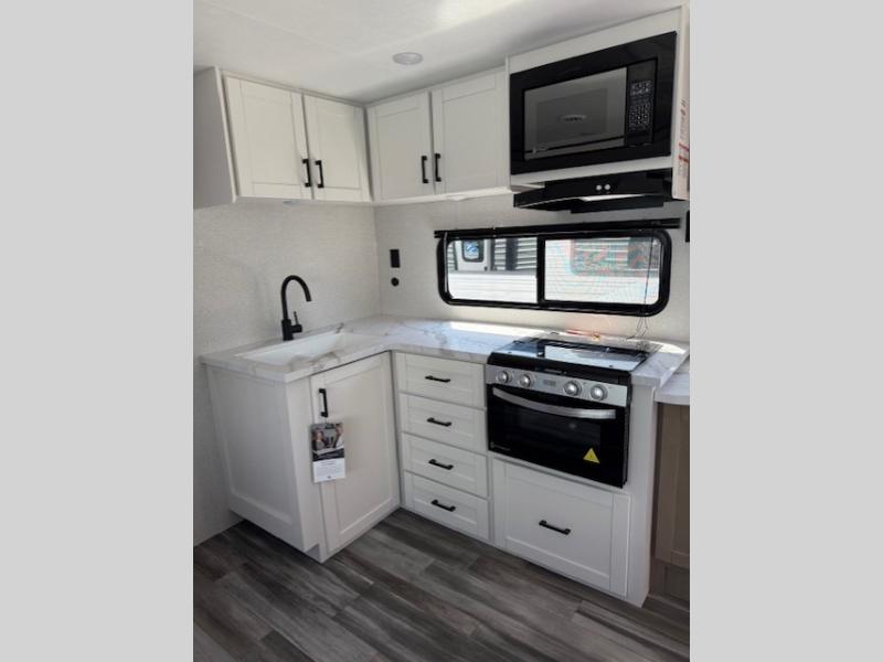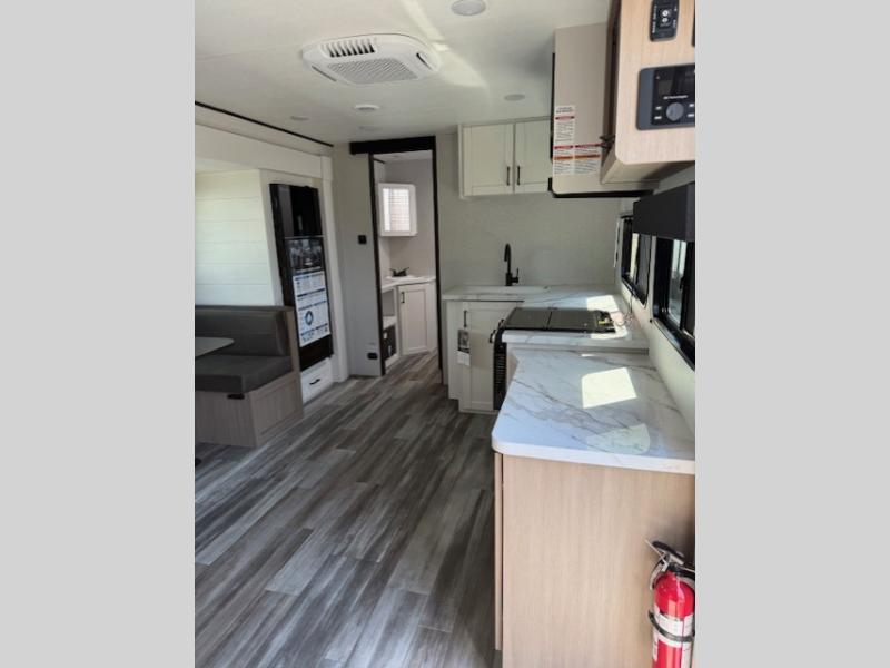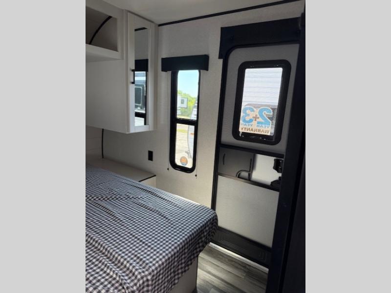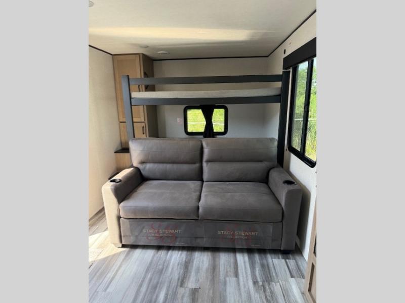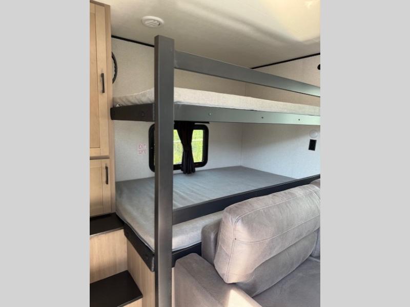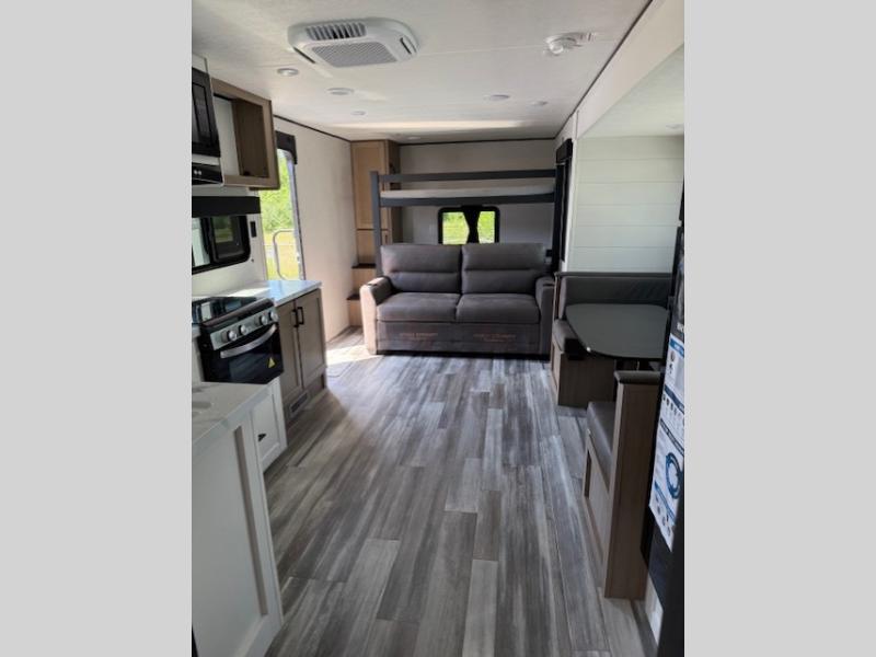 It's time to ditch that old tent and upgrade to this spacious travel trailer! The littles ones or your guests will love the double-size bunks with steps in the back, while you take the front master bedroom. One of the dual entry doors is also found here for convenience, and the walk-through bath is easily accessible for everyone. A U-shaped dinette slide and jack-knife sofa in the main living area provide your crew with space to relax and dine together, and the fully equipped kitchen lets you cook up your best meals. This unit includes ample storage space, including additional kitchen storage, wardrobes, overhead cabinets, and exterior storage!