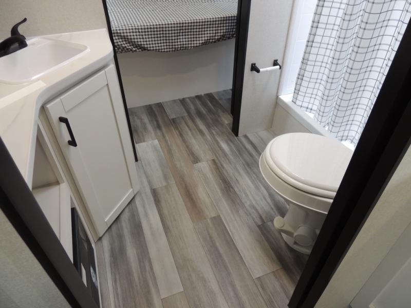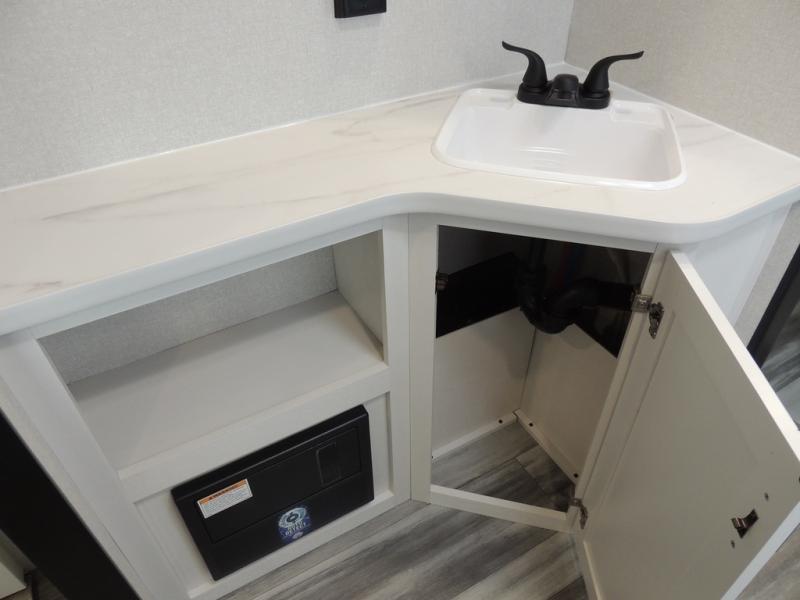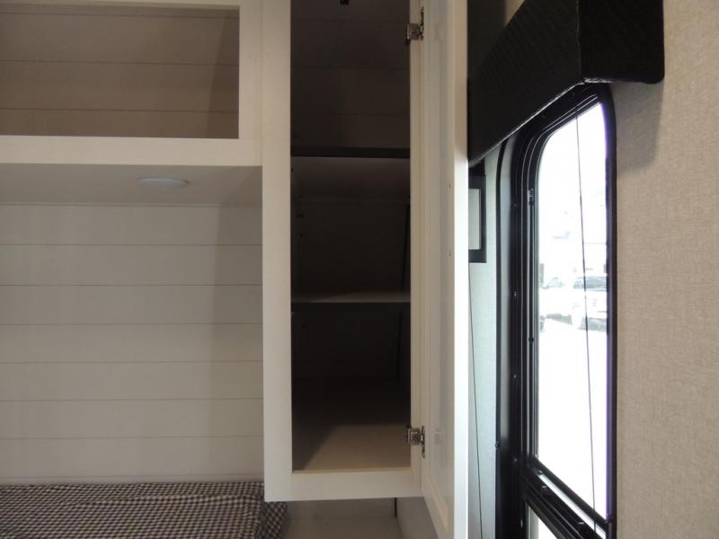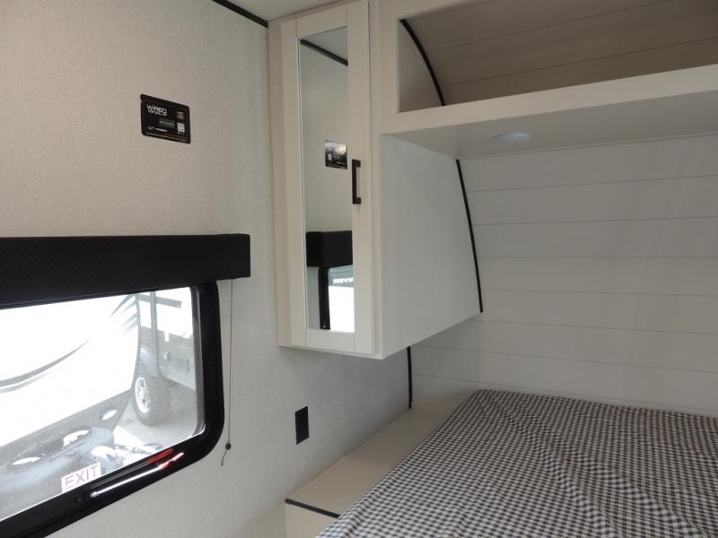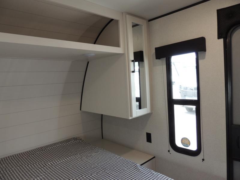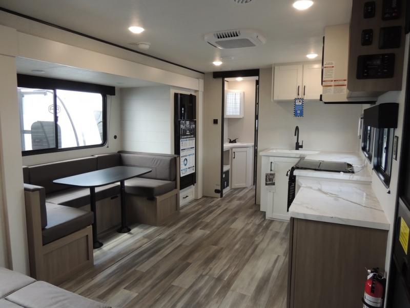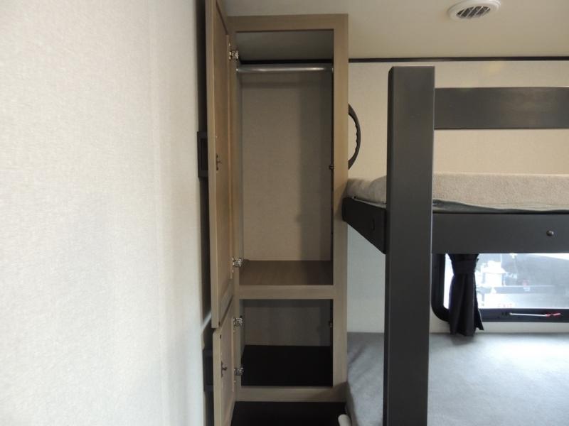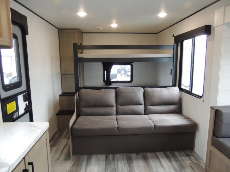 It's time to ditch that old tent and upgrade to this spacious travel trailer! The littles ones or your guests will love the double-size bunks with steps in the back, while you take the front master bedroom. One of the dual entry doors is also found here for convenience, and the walk-through bath is easily accessible for everyone. A U-shaped dinette slide and jack-knife sofa in the main living area provide your crew with space to relax and dine together, and the fully equipped kitchen lets you cook up your best meals. This unit includes ample storage space, including additional kitchen storage, wardrobes, overhead cabinets, and exterior storage!