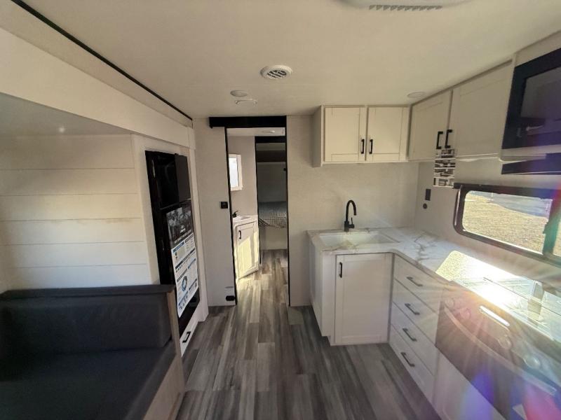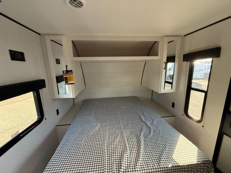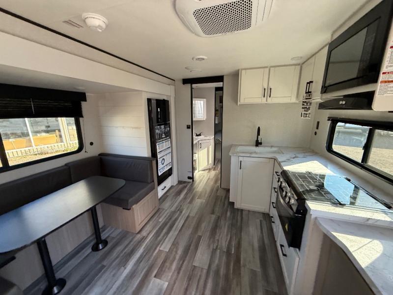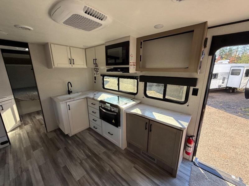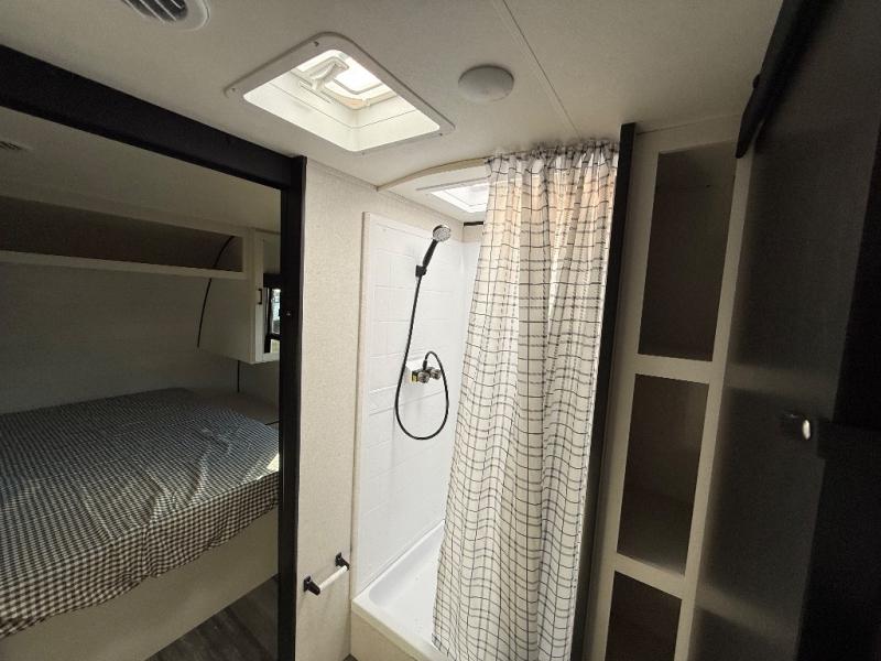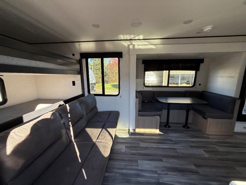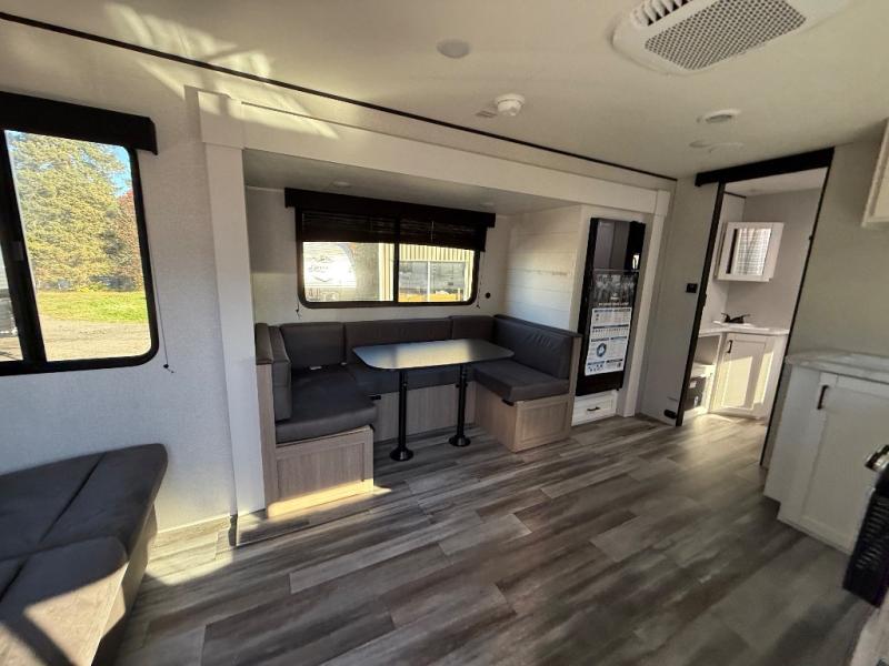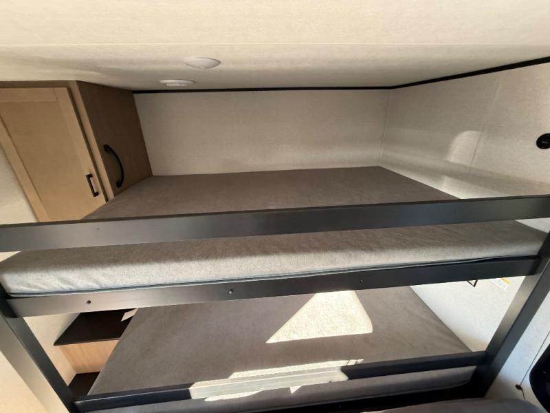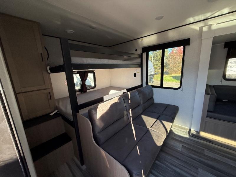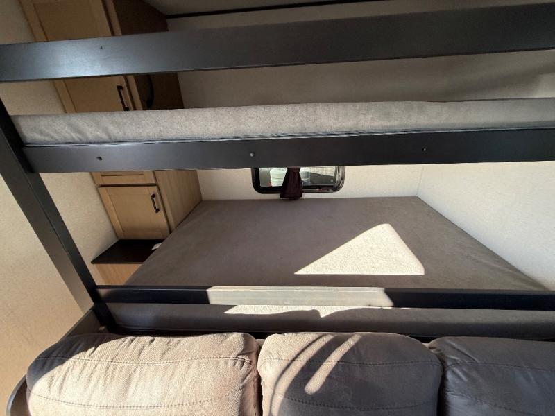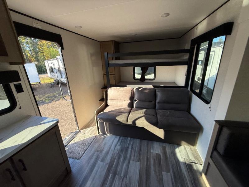 It's time to ditch that old tent and upgrade to this spacious travel trailer! The littles ones or your guests will love the double-size bunks with steps in the back, while you take the front master bedroom. One of the dual entry doors is also found here for convenience, and the walk-through bath is easily accessible for everyone. A U-shaped dinette slide and jack-knife sofa in the main living area provide your crew with space to relax and dine together, and the fully equipped kitchen lets you cook up your best meals. This unit includes ample storage space, including additional kitchen storage, wardrobes, overhead cabinets, and exterior storage!