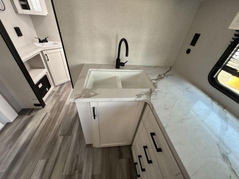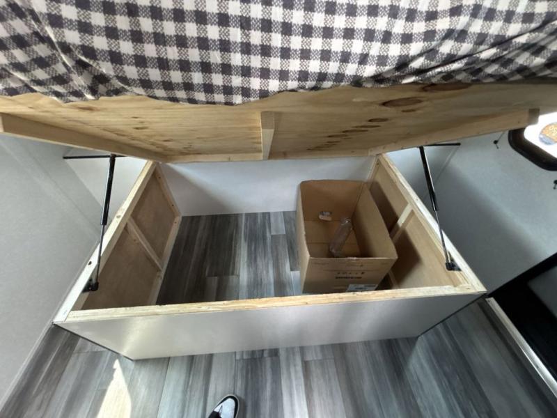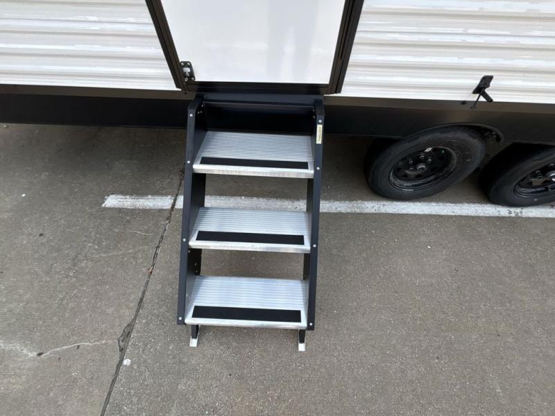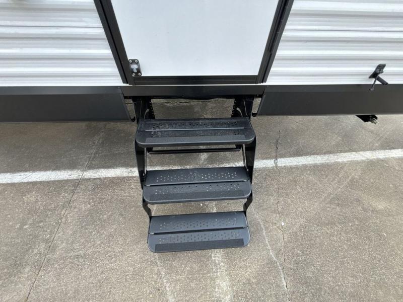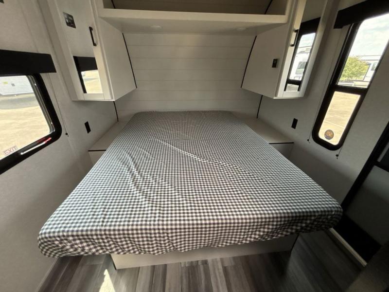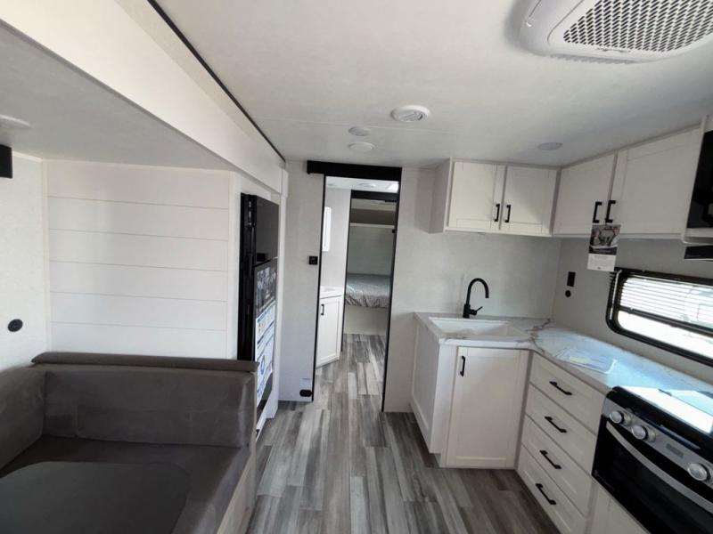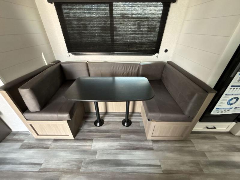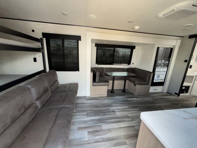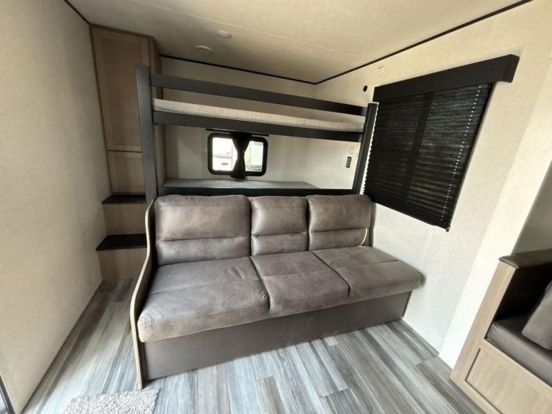 It's time to ditch that old tent and upgrade to this spacious travel trailer! The littles ones or your guests will love the double-size bunks with steps in the back, while you take the front master bedroom. One of the dual entry doors is also found here for convenience, and the walk-through bath is easily accessible for everyone. A U-shaped dinette slide and jack-knife sofa in the main living area provide your crew with space to relax and dine together, and the fully equipped kitchen lets you cook up your best meals. This unit includes ample storage space, including additional kitchen storage, wardrobes, overhead cabinets, and exterior storage!