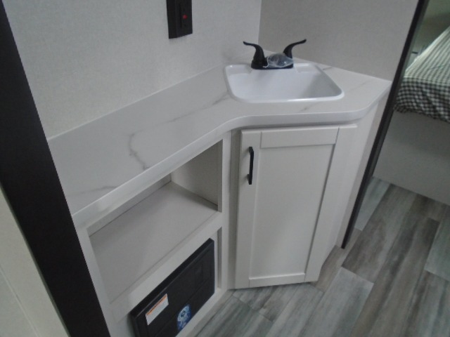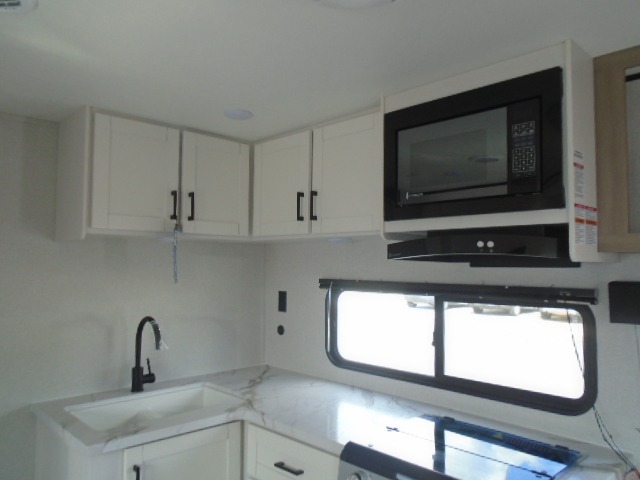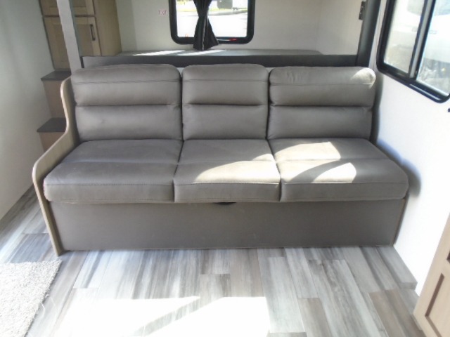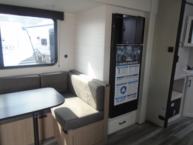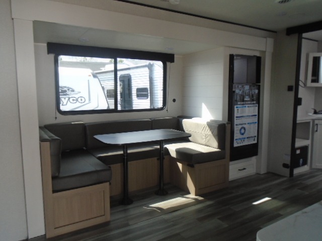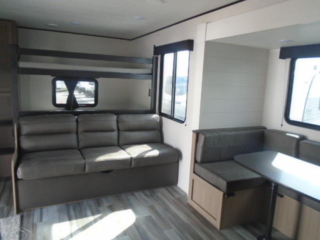 It's time to ditch that old tent and upgrade to this spacious travel trailer! The littles ones or your guests will love the double-size bunks with steps in the back, while you take the front master bedroom. One of the dual entry doors is also found here for convenience, and the walk-through bath is easily accessible for everyone. A U-shaped dinette slide and jack-knife sofa in the main living area provide your crew with space to relax and dine together, and the fully equipped kitchen lets you cook up your best meals. This unit includes ample storage space, including additional kitchen storage, wardrobes, overhead cabinets, and exterior storage!