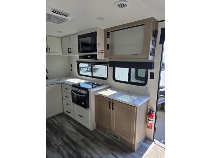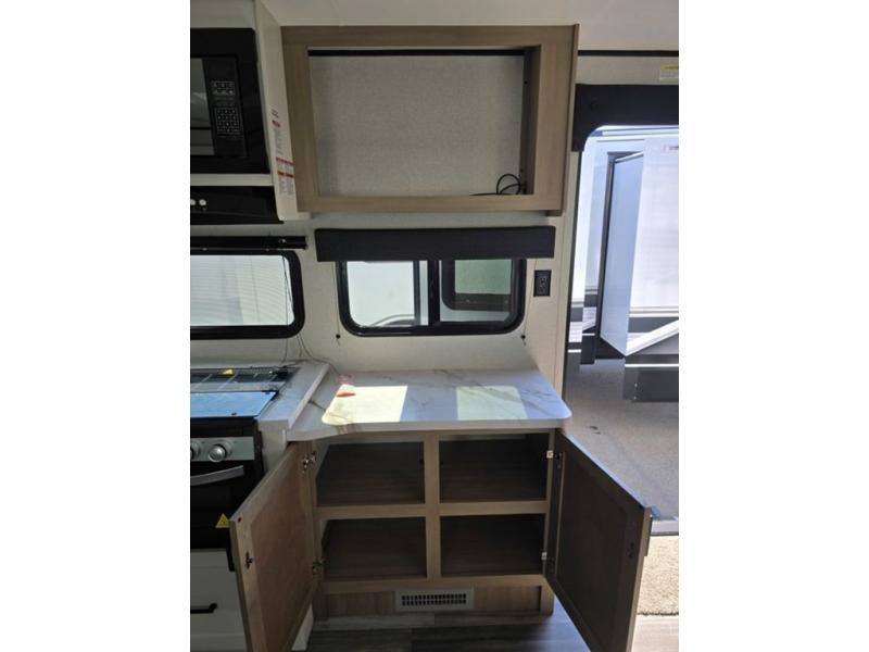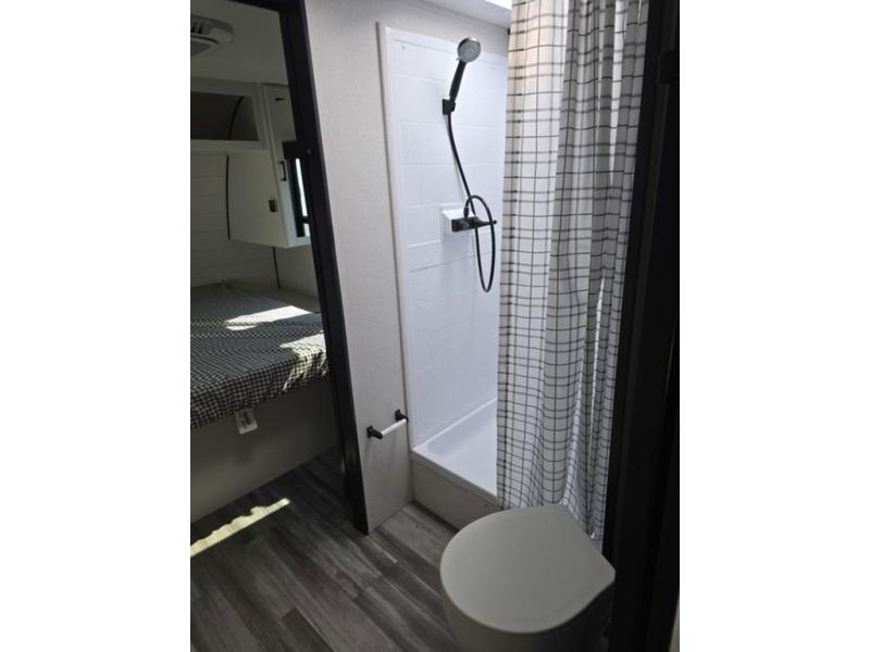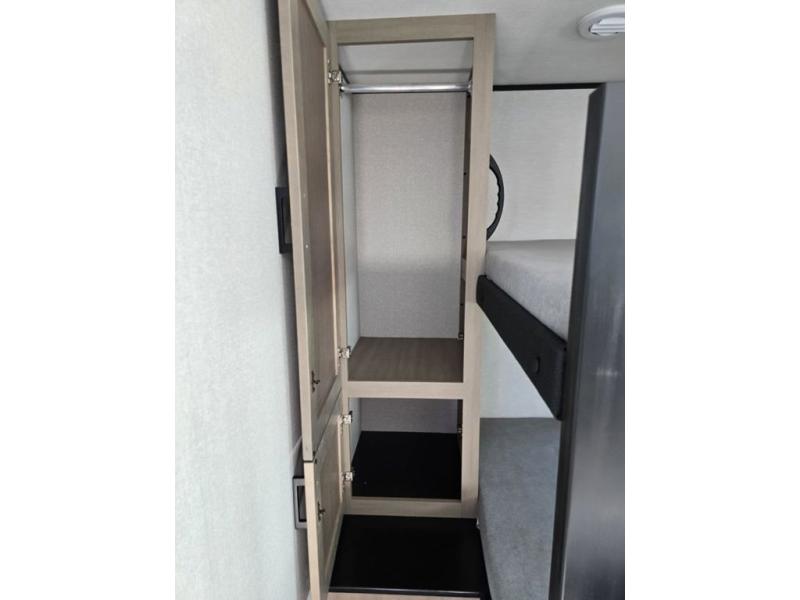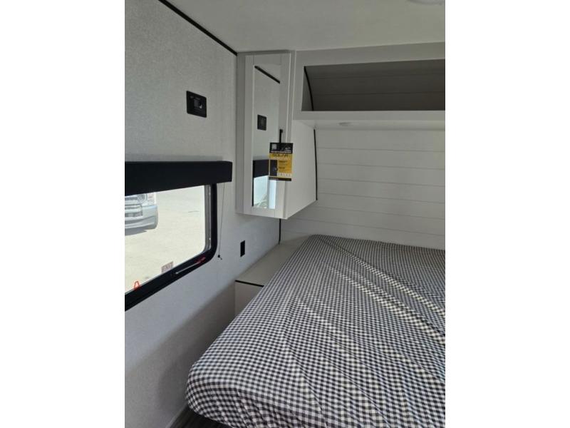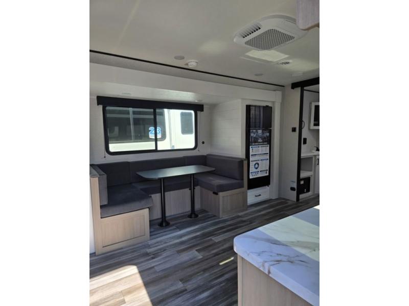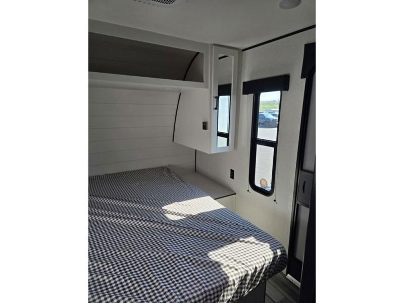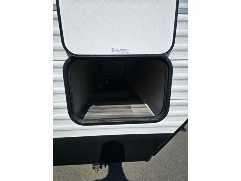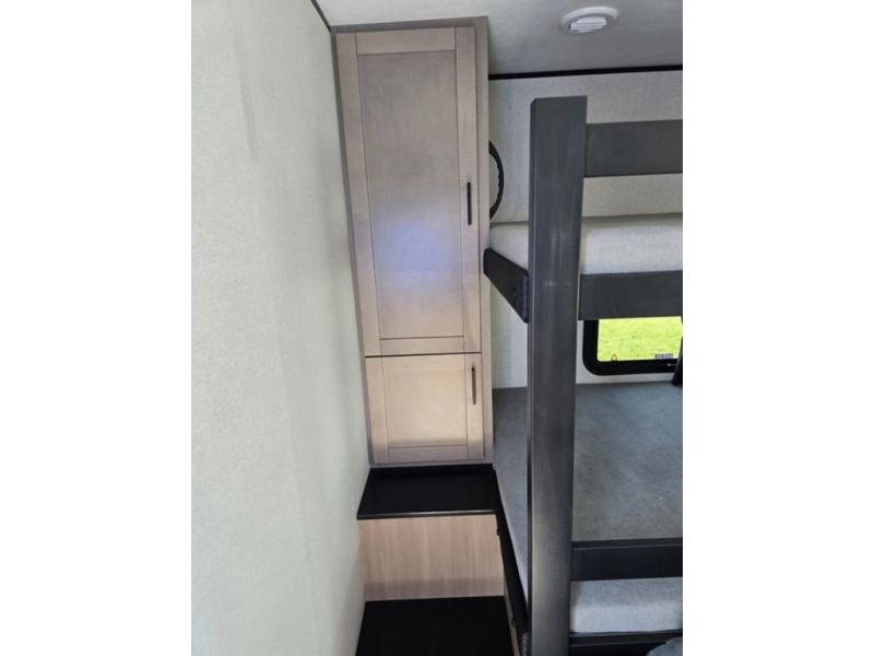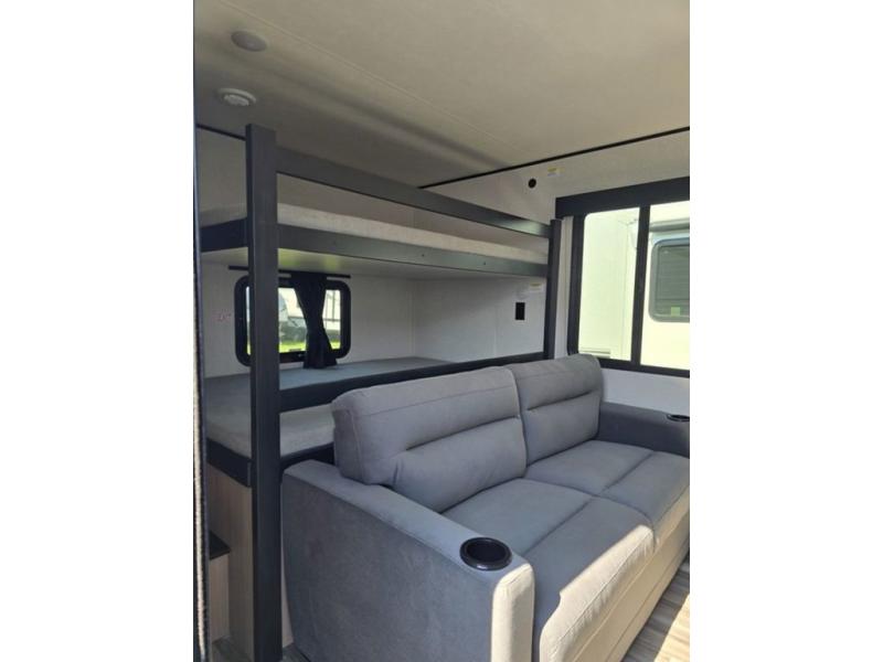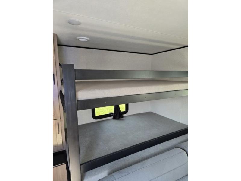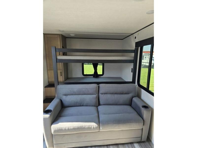 It's time to ditch that old tent and upgrade to this spacious travel trailer! The littles ones or your guests will love the double-size bunks with steps in the back, while you take the front master bedroom. One of the dual entry doors is also found here for convenience, and the walk-through bath is easily accessible for everyone. A U-shaped dinette slide and jack-knife sofa in the main living area provide your crew with space to relax and dine together, and the fully equipped kitchen lets you cook up your best meals. This unit includes ample storage space, including additional kitchen storage, wardrobes, overhead cabinets, and exterior storage!