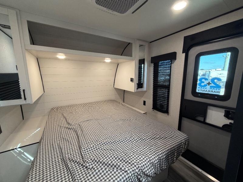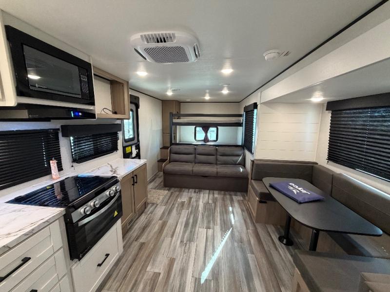 It's time to ditch that old tent and upgrade to this spacious travel trailer! The littles ones or your guests will love the double-size bunks with steps in the back, while you take the front master bedroom. One of the dual entry doors is also found here for convenience, and the walk-through bath is easily accessible for everyone. A U-shaped dinette slide and jack-knife sofa in the main living area provide your crew with space to relax and dine together, and the fully equipped kitchen lets you cook up your best meals. This unit includes ample storage space, including additional kitchen storage, wardrobes, overhead cabinets, and exterior storage!