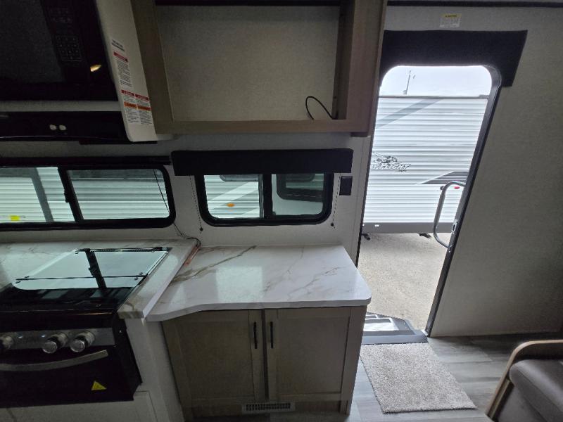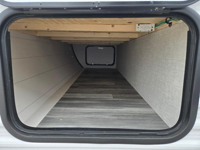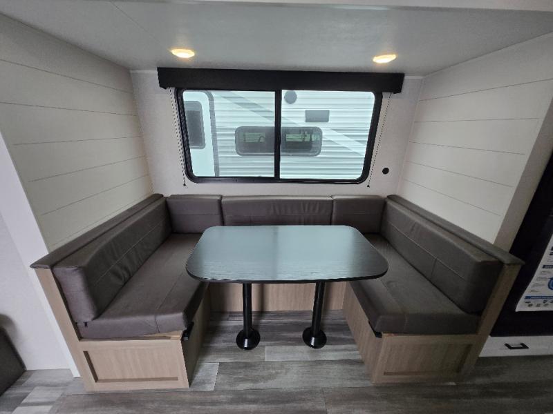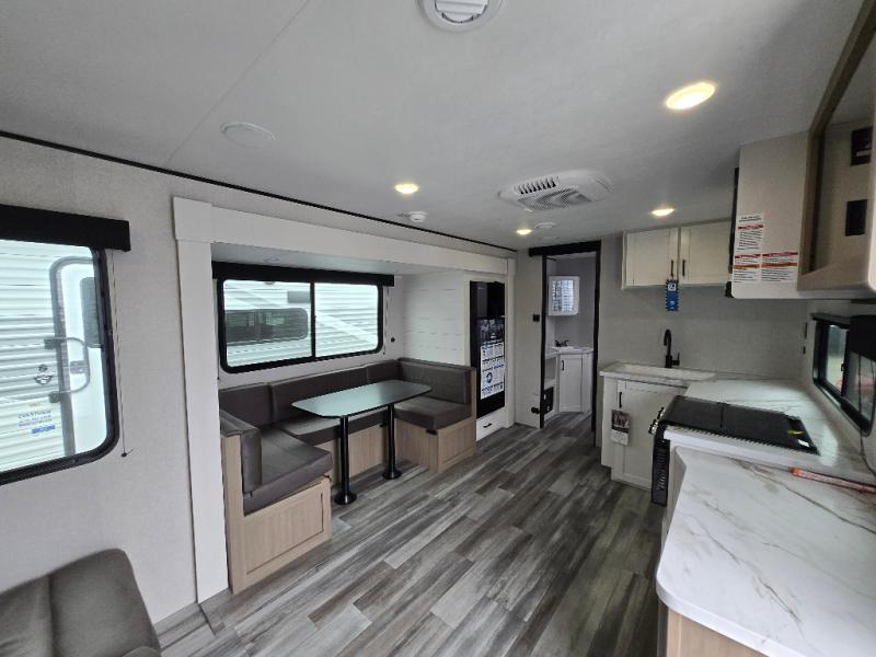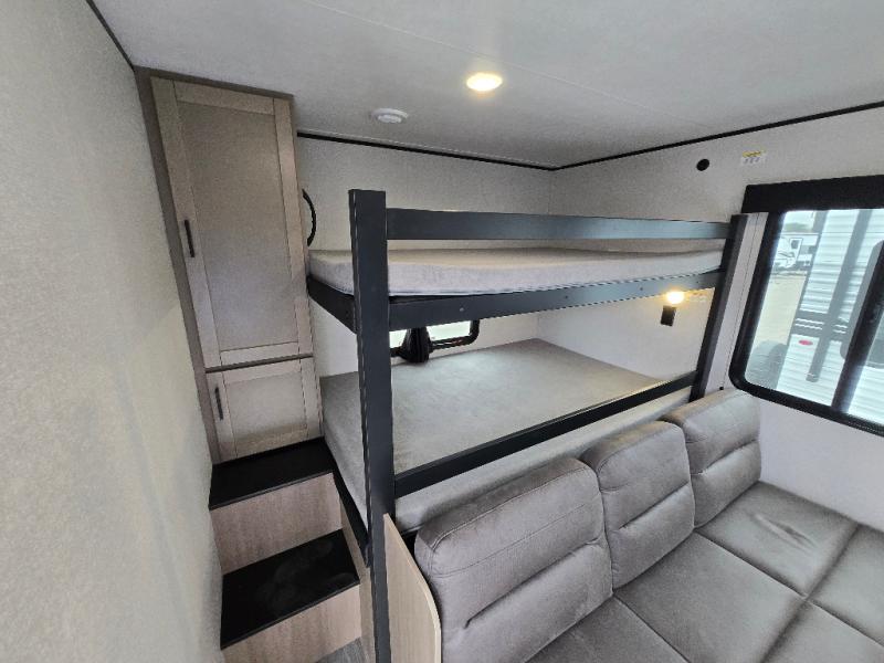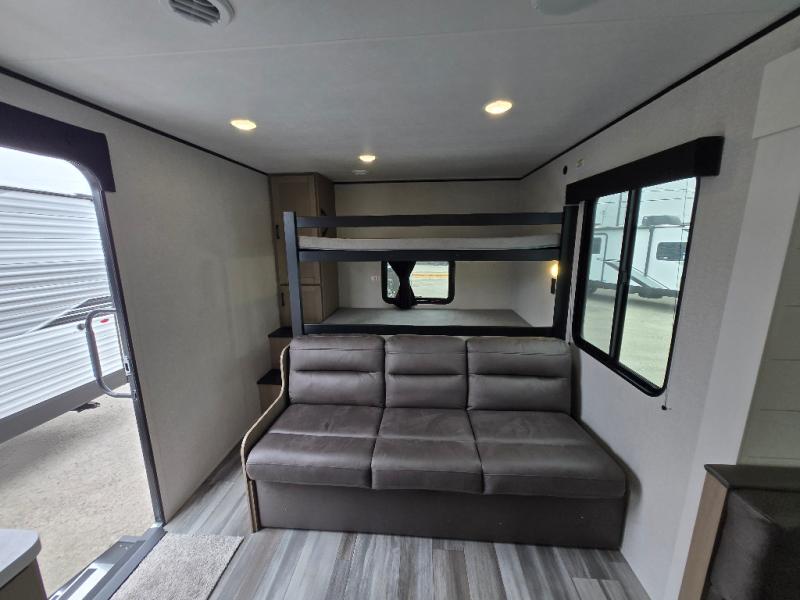 It's time to ditch that old tent and upgrade to this spacious travel trailer! The littles ones or your guests will love the double-size bunks with steps in the back, while you take the front master bedroom. One of the dual entry doors is also found here for convenience, and the walk-through bath is easily accessible for everyone. A U-shaped dinette slide and jack-knife sofa in the main living area provide your crew with space to relax and dine together, and the fully equipped kitchen lets you cook up your best meals. This unit includes ample storage space, including additional kitchen storage, wardrobes, overhead cabinets, and exterior storage!