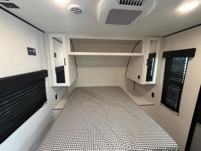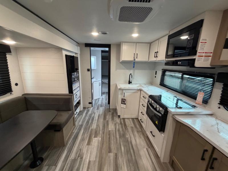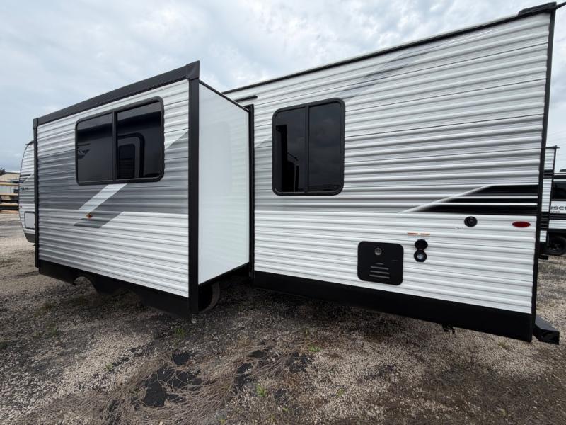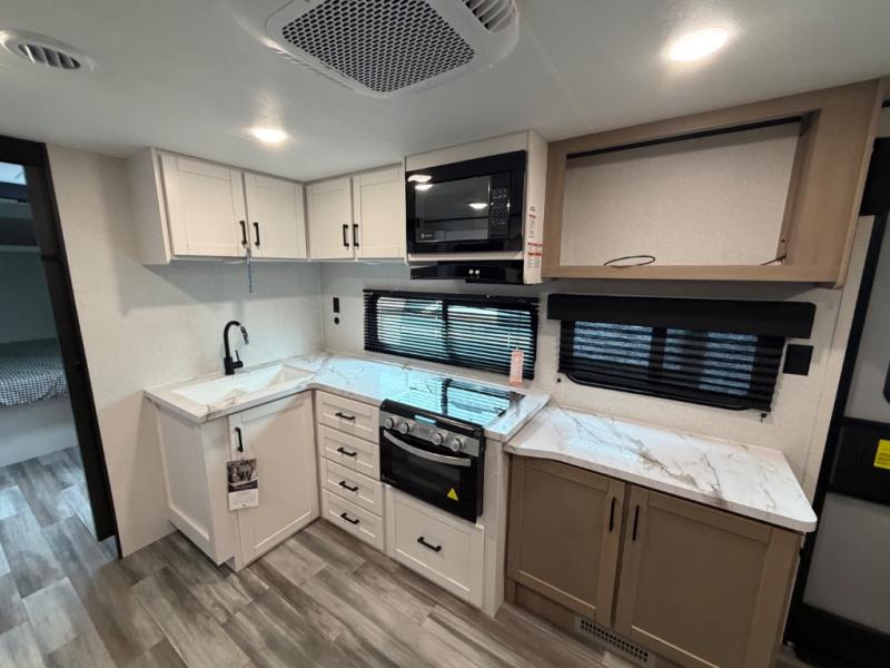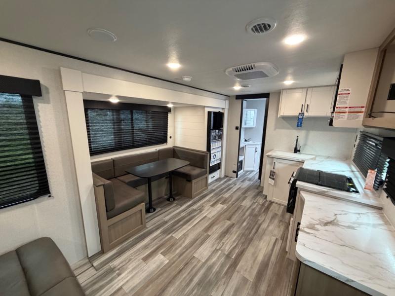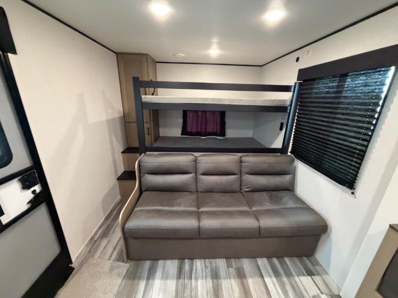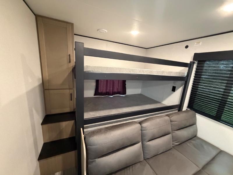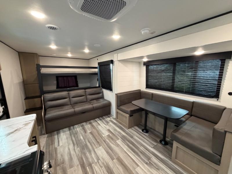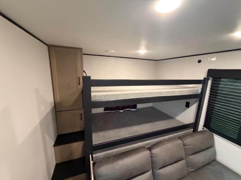 It's time to ditch that old tent and upgrade to this spacious travel trailer! The littles ones or your guests will love the double-size bunks with steps in the back, while you take the front master bedroom. One of the dual entry doors is also found here for convenience, and the walk-through bath is easily accessible for everyone. A U-shaped dinette slide and jack-knife sofa in the main living area provide your crew with space to relax and dine together, and the fully equipped kitchen lets you cook up your best meals. This unit includes ample storage space, including additional kitchen storage, wardrobes, overhead cabinets, and exterior storage!