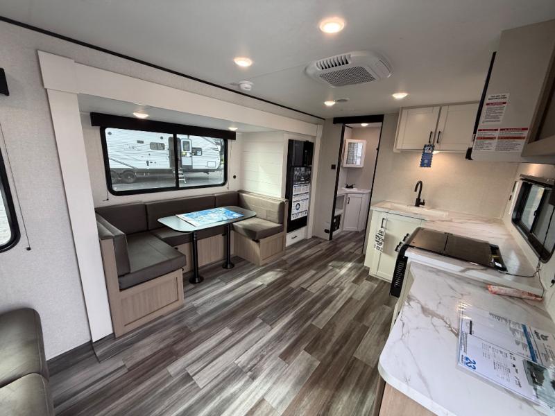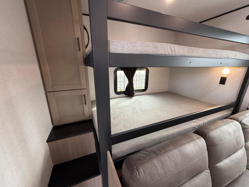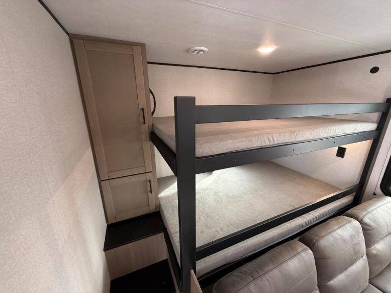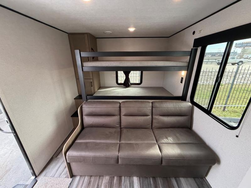 It's time to ditch that old tent and upgrade to this spacious travel trailer! The littles ones or your guests will love the double-size bunks with steps in the back, while you take the front master bedroom. One of the dual entry doors is also found here for convenience, and the walk-through bath is easily accessible for everyone. A U-shaped dinette slide and jack-knife sofa in the main living area provide your crew with space to relax and dine together, and the fully equipped kitchen lets you cook up your best meals. This unit includes ample storage space, including additional kitchen storage, wardrobes, overhead cabinets, and exterior storage!