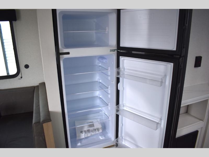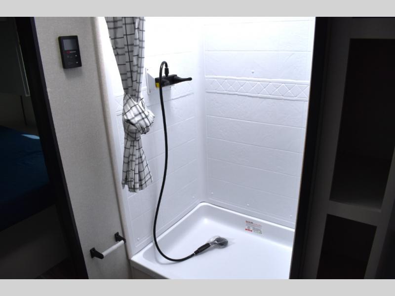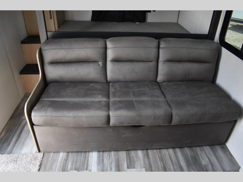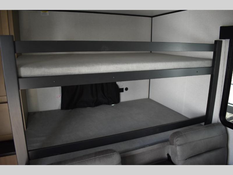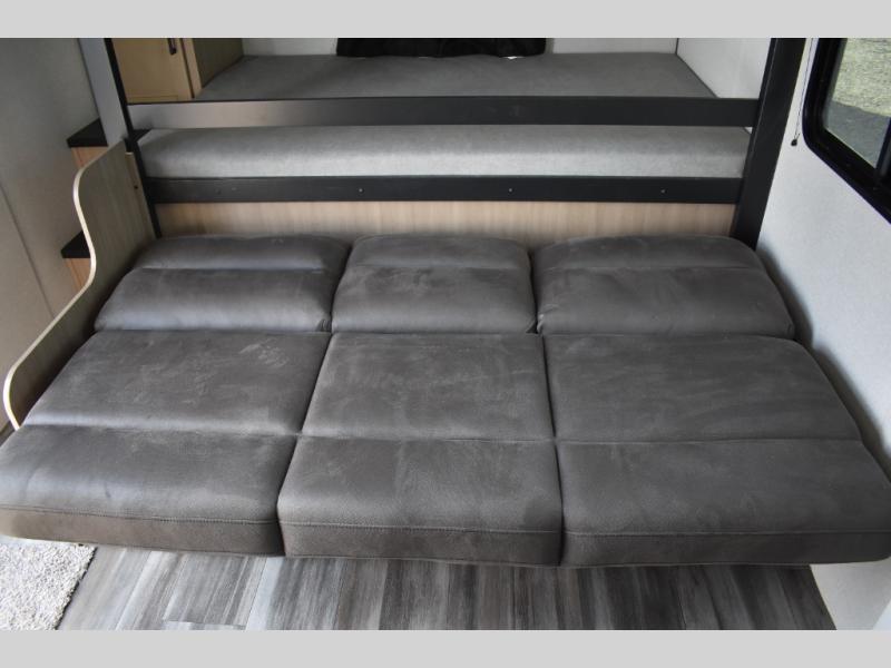 It's time to ditch that old tent and upgrade to this spacious travel trailer! The littles ones or your guests will love the double-size bunks with steps in the back, while you take the front master bedroom. One of the dual entry doors is also found here for convenience, and the walk-through bath is easily accessible for everyone. A U-shaped dinette slide and jack-knife sofa in the main living area provide your crew with space to relax and dine together, and the fully equipped kitchen lets you cook up your best meals. This unit includes ample storage space, including additional kitchen storage, wardrobes, overhead cabinets, and exterior storage!