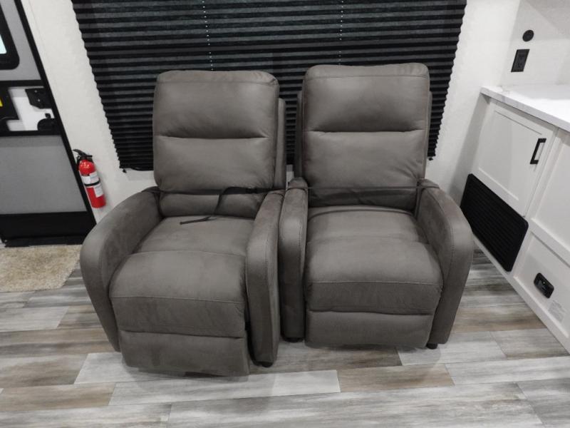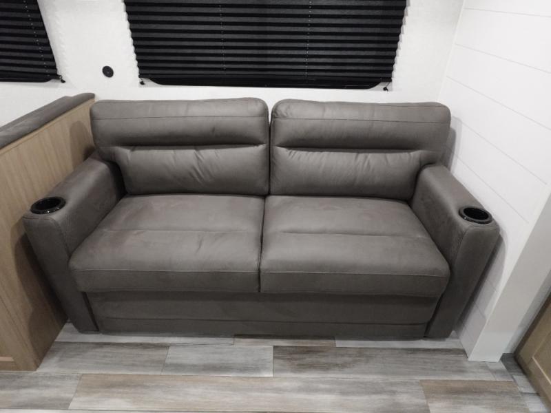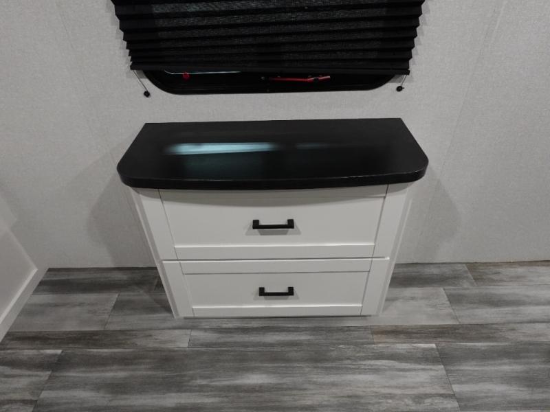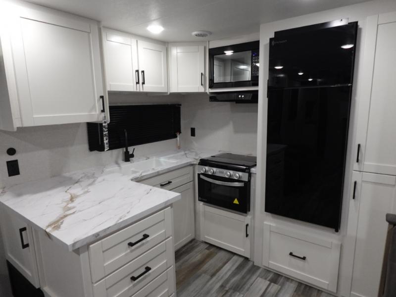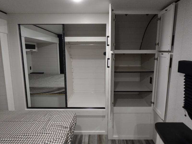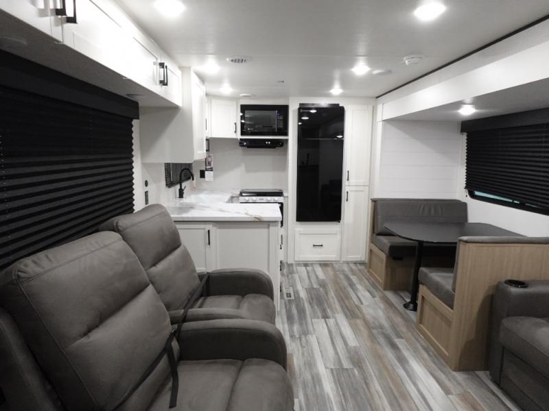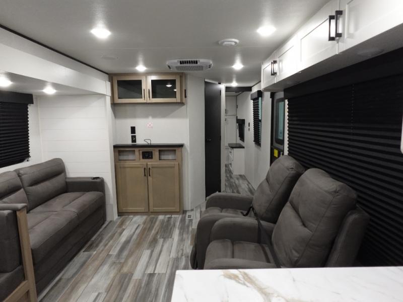 Time spent in this double slide out trailer will be time well spent! Your crew can relax on the sofa or lounge chairs, and dine at the booth dinette. A dual entry bath will create a front master bedroom you are sure to love. There is a queen bed slide out here, along with a front wardrobe, a dresser, plus washer and dryer prep. The rear kitchen includes ample counter space, all the appliances to create meals, and a pantry for snacks.