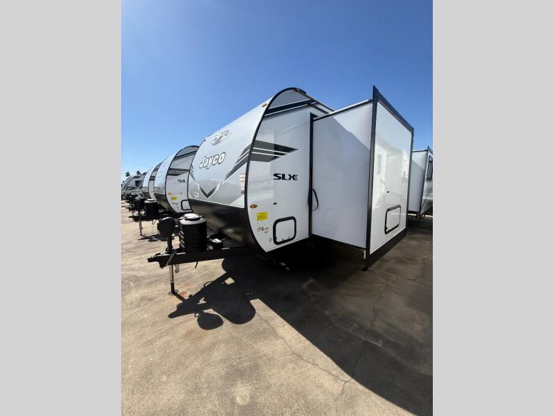 The Jayco Jay Flight SLX travel trailer is quite easy to own because it is lightweight for an easier towing experience. Built on a fully integrated A-frame with galvanized-steel, impact-resistant wheel wells, the Jay Flight SLX has quality at its very foundation. That quality continues on to the electric self-adjusting brakes, easy-lube hubs, Magnum Truss roof system, and LP quick connect. Some of what the mandatory Customer Value Package includes is backup camera prep, Keyed-Alike entry and baggage doors, and an on-demand tankless water heater.