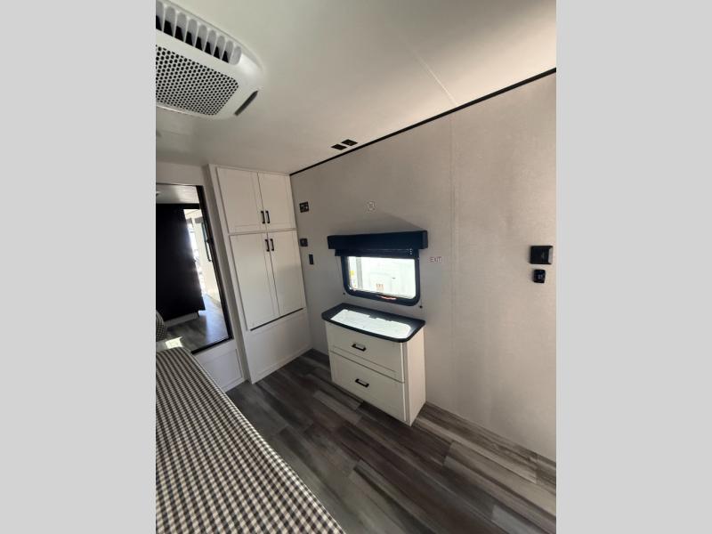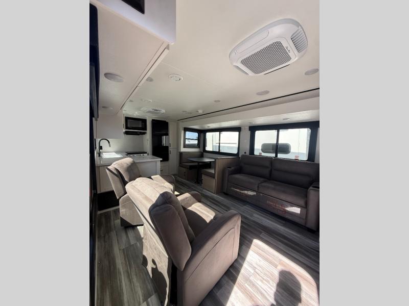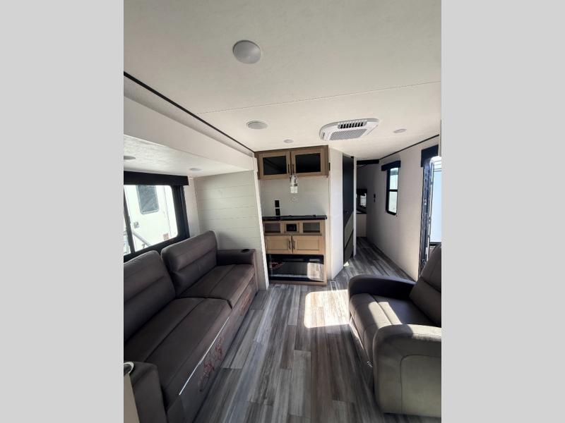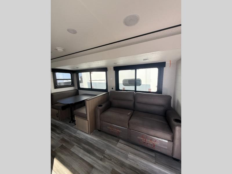 Time spent in this double slide out trailer will be time well spent! Your crew can relax on the sofa or lounge chairs, and dine at the booth dinette. A dual entry bath will create a front master bedroom you are sure to love. There is a queen bed slide out here, along with a front wardrobe, a dresser, plus washer and dryer prep. The rear kitchen includes ample counter space, all the appliances to create meals, and a pantry for snacks.