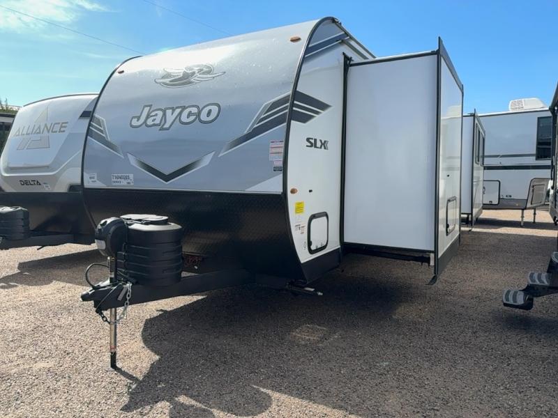 The Jayco Jay Flight SLX travel trailer is quite easy to own because it is lightweight for an easier towing experience. Built on a fully integrated A-frame with galvanized-steel, impact-resistant wheel wells, the Jay Flight SLX has quality at its very foundation. That quality continues on to the electric self-adjusting brakes, easy-lube hubs, Magnum Truss roof system, and LP quick connect. Some of what the mandatory Customer Value Package includes is backup camera prep, Keyed-Alike entry and baggage doors, and an on-demand tankless water heater.