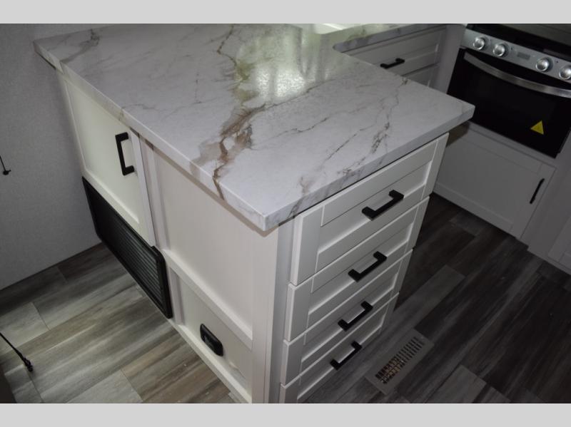 Time spent in this double slide out trailer will be time well spent! Your crew can relax on the sofa or lounge chairs, and dine at the booth dinette. A dual entry bath will create a front master bedroom you are sure to love. There is a queen bed slide out here, along with a front wardrobe, a dresser, plus washer and dryer prep. The rear kitchen includes ample counter space, all the appliances to create meals, and a pantry for snacks.