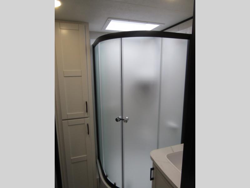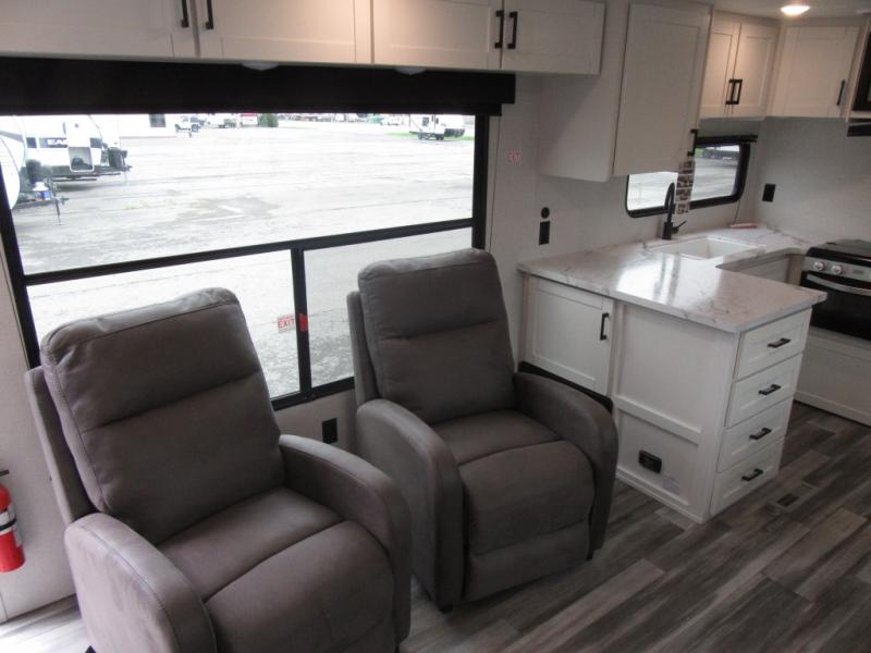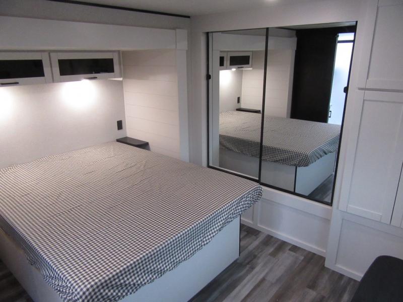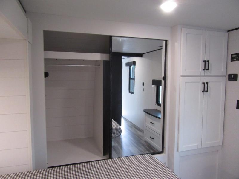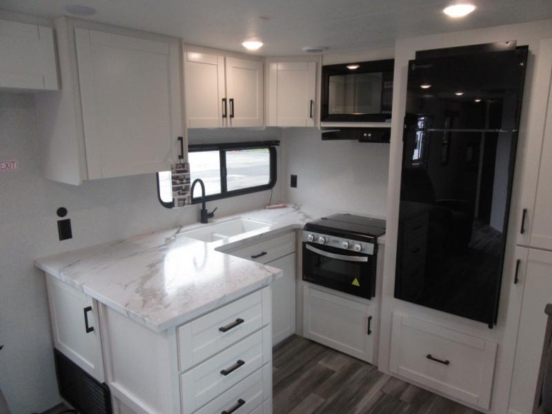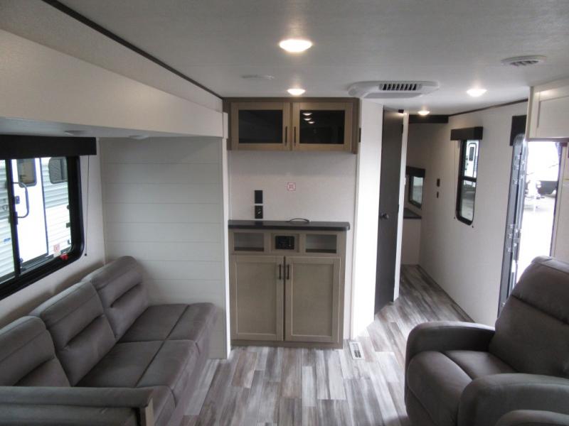 Time spent in this double slide out trailer will be time well spent! Your crew can relax on the sofa or lounge chairs, and dine at the booth dinette. A dual entry bath will create a front master bedroom you are sure to love. There is a queen bed slide out here, along with a front wardrobe, a dresser, plus washer and dryer prep. The rear kitchen includes ample counter space, all the appliances to create meals, and a pantry for snacks.