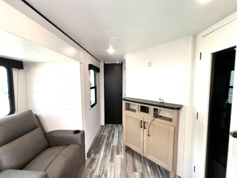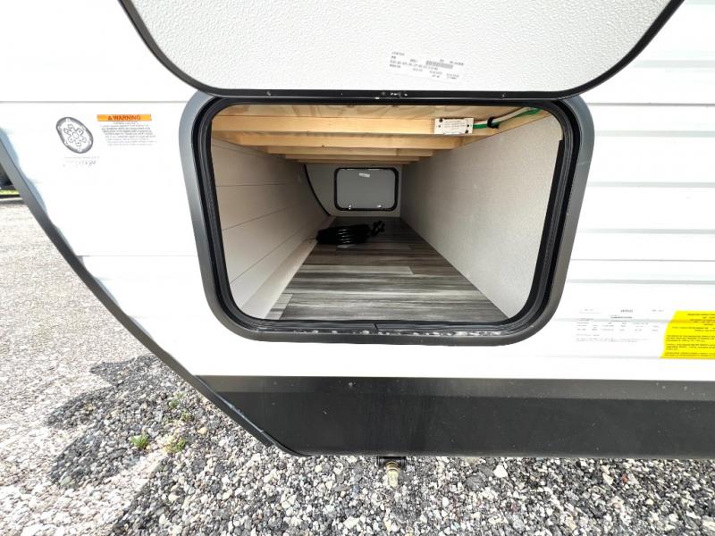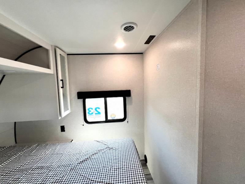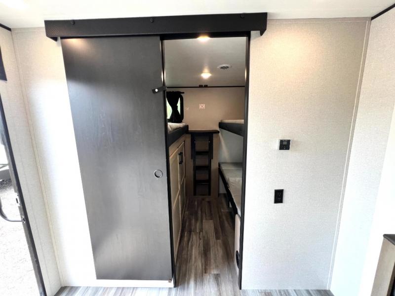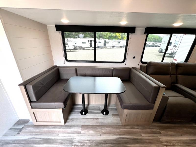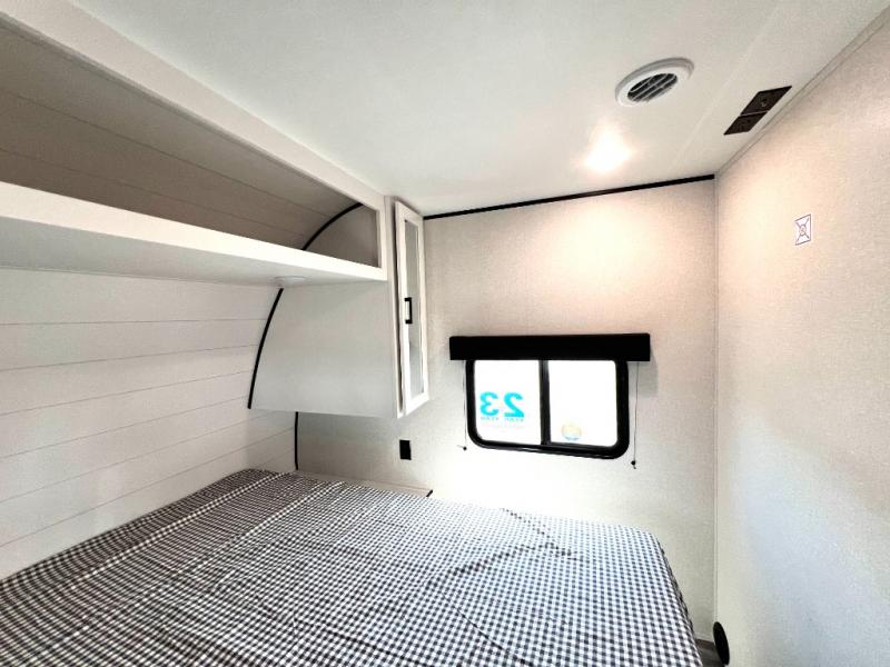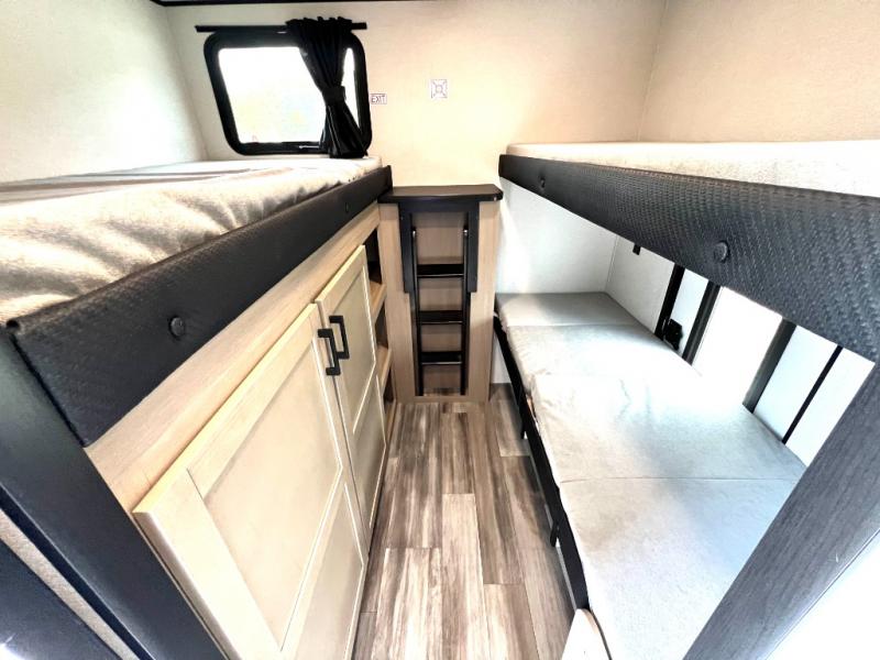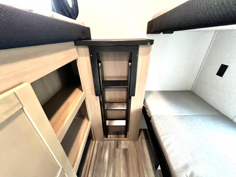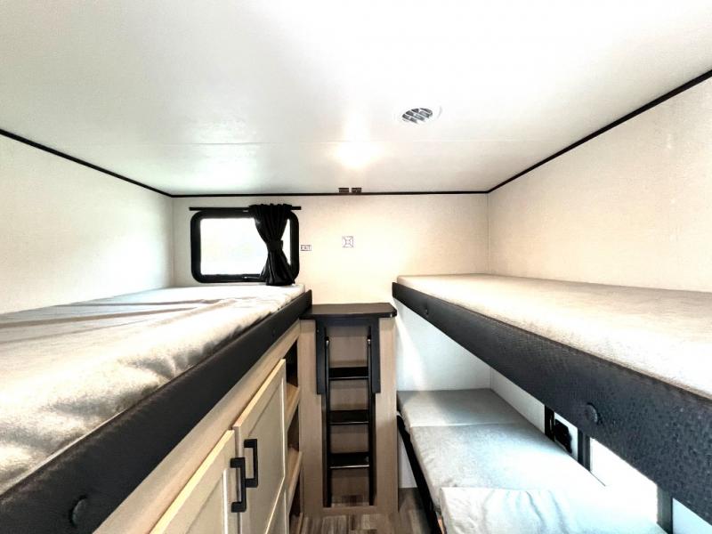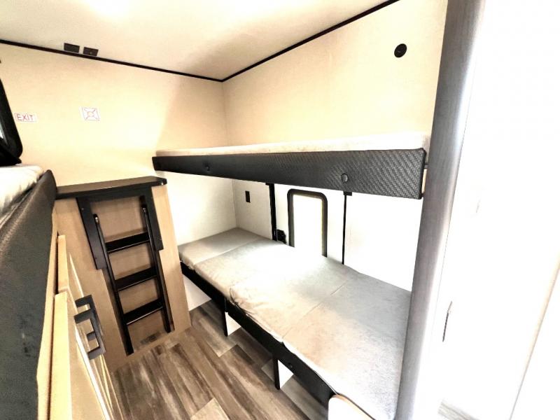It's time to ditch that old tent and upgrade to this spacious travel trailer! There is a rear private bunkhouse includes a flip-up bunk over a 28" x 76" bunk, plus a bunk across the room and a wardrobe. You'll enjoy the front private bedroom all to yourselves with a queen bed and dual wardrobes, and the full bath is close by for easy nighttime use. A U-shaped dinette slide and sofa in the main living area provide your crew with space to relax and dine together, and the fully equipped kitchen lets you cook up your best meals. Outside, you'll find exterior storage, an 18' power awning, plus an outdoor refrigerator, shelf, and TV prep!
