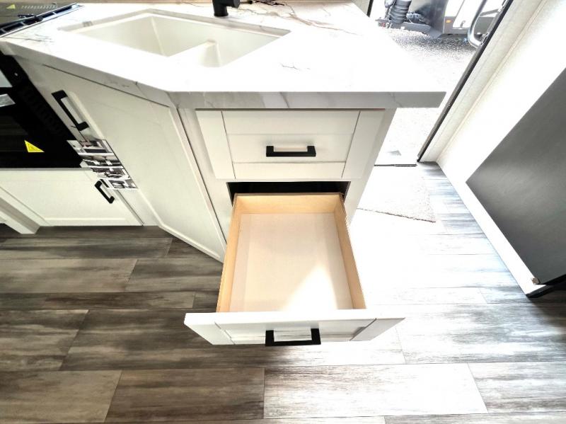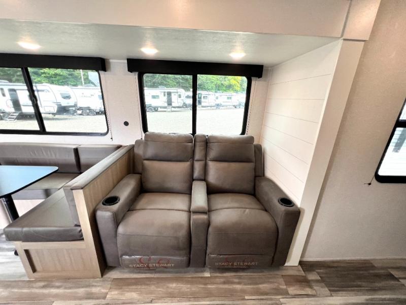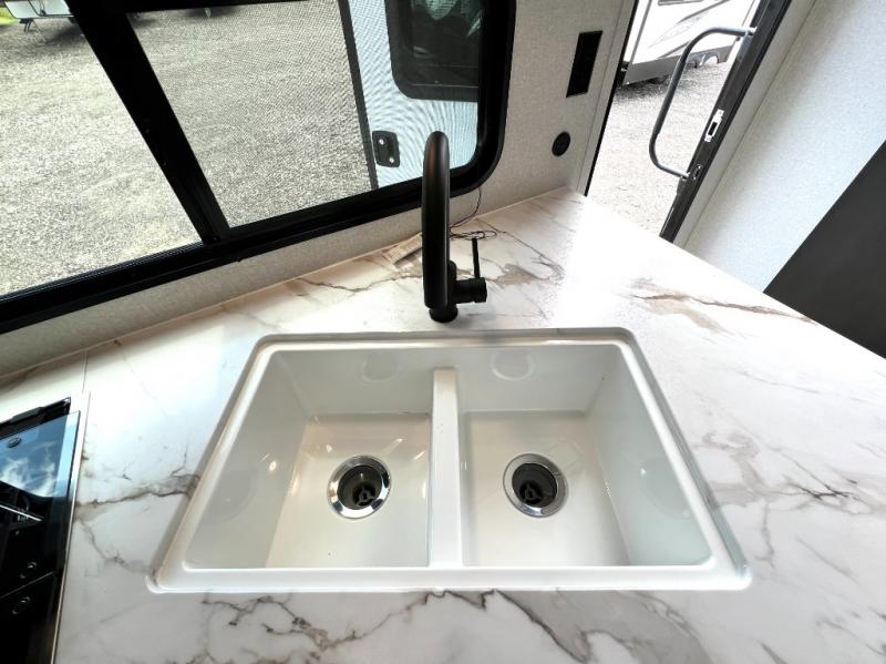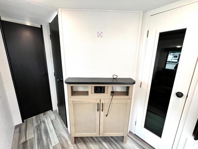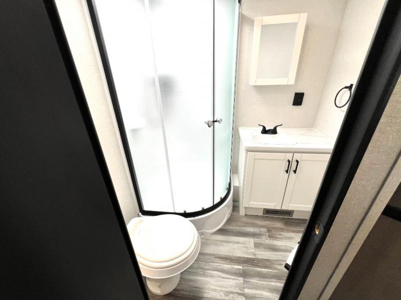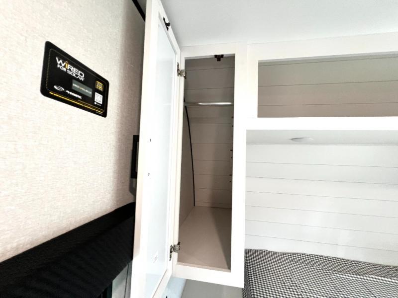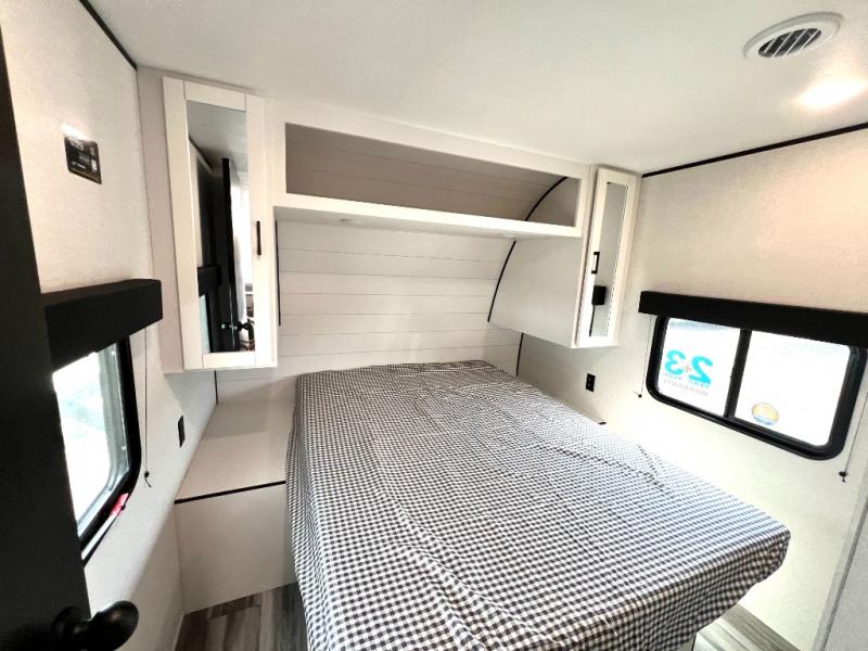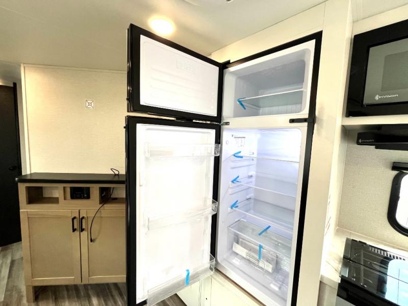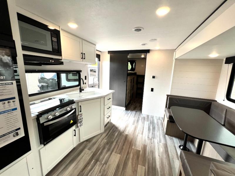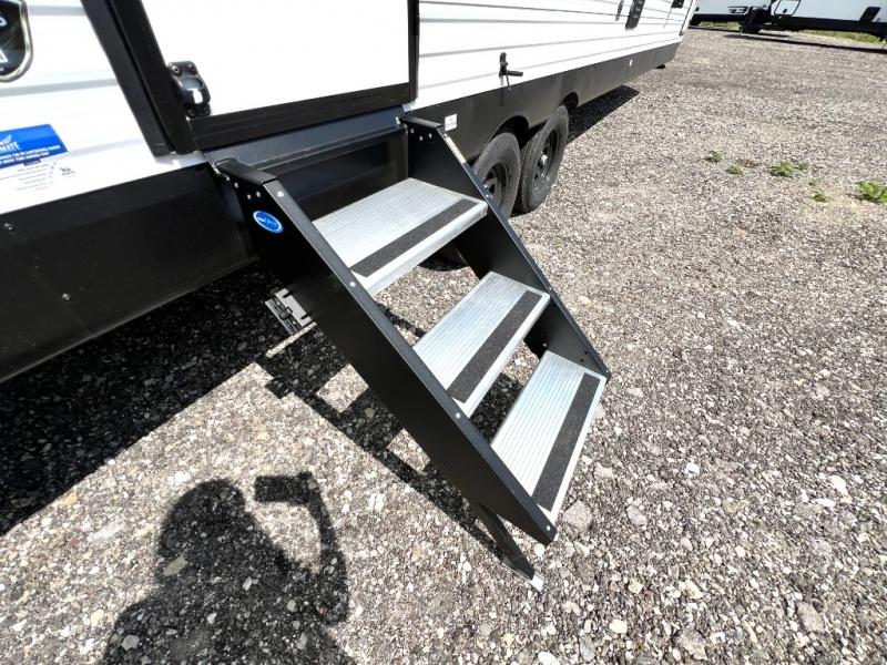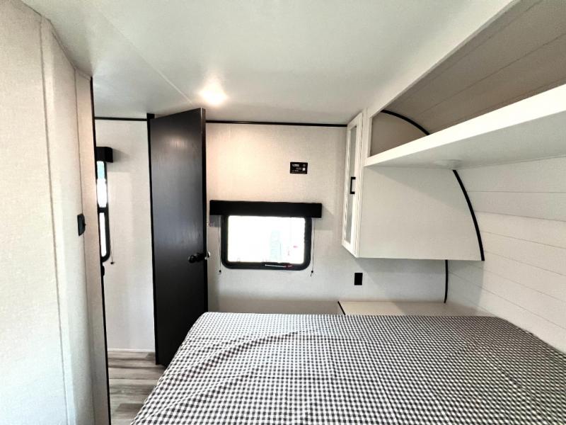 It's time to ditch that old tent and upgrade to this spacious travel trailer! There is a rear private bunkhouse includes a flip-up bunk over a 28" x 76" bunk, plus a bunk across the room and a wardrobe. You'll enjoy the front private bedroom all to yourselves with a queen bed and dual wardrobes, and the full bath is close by for easy nighttime use. A U-shaped dinette slide and sofa in the main living area provide your crew with space to relax and dine together, and the fully equipped kitchen lets you cook up your best meals. Outside, you'll find exterior storage, an 18' power awning, plus an outdoor refrigerator, shelf, and TV prep!