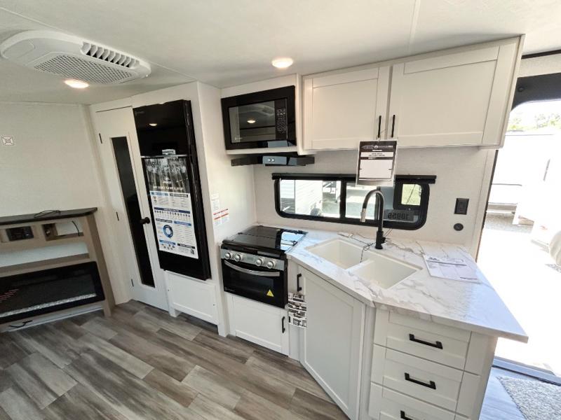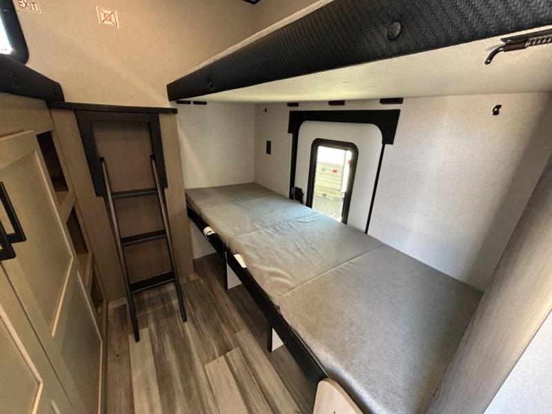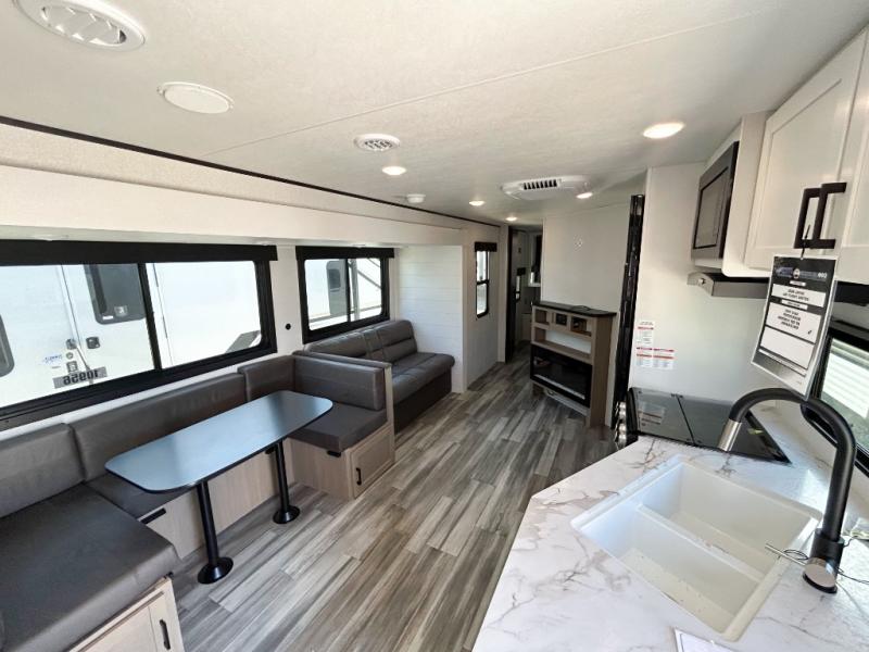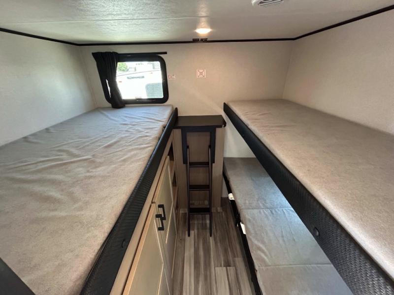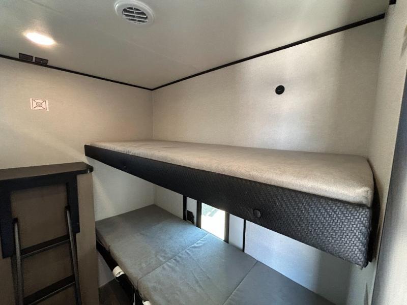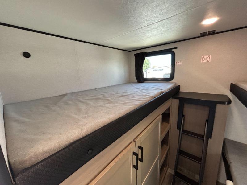 It's time to ditch that old tent and upgrade to this spacious travel trailer! There is a rear private bunkhouse includes a flip-up bunk over a 28" x 76" bunk, plus a bunk across the room and a wardrobe. You'll enjoy the front private bedroom all to yourselves with a queen bed and dual wardrobes, and the full bath is close by for easy nighttime use. A U-shaped dinette slide and sofa in the main living area provide your crew with space to relax and dine together, and the fully equipped kitchen lets you cook up your best meals. Outside, you'll find exterior storage, an 18' power awning, plus an outdoor refrigerator, shelf, and TV prep!