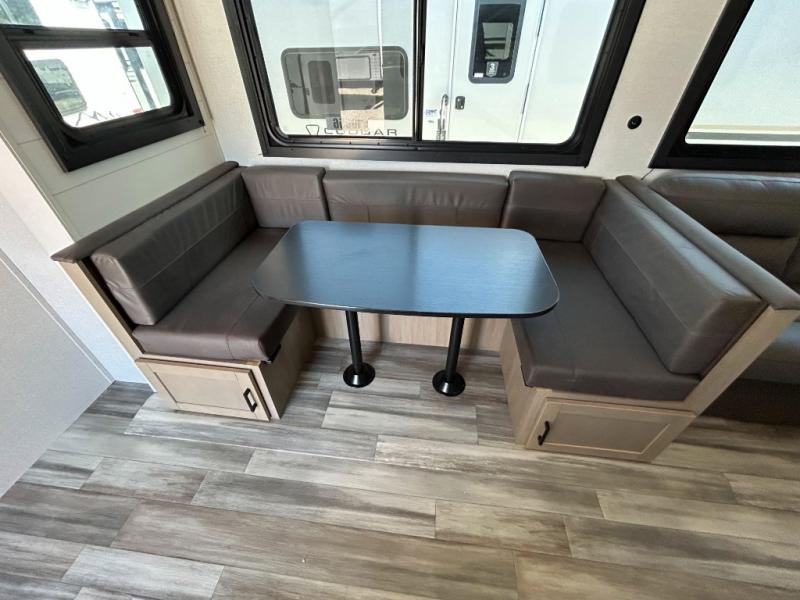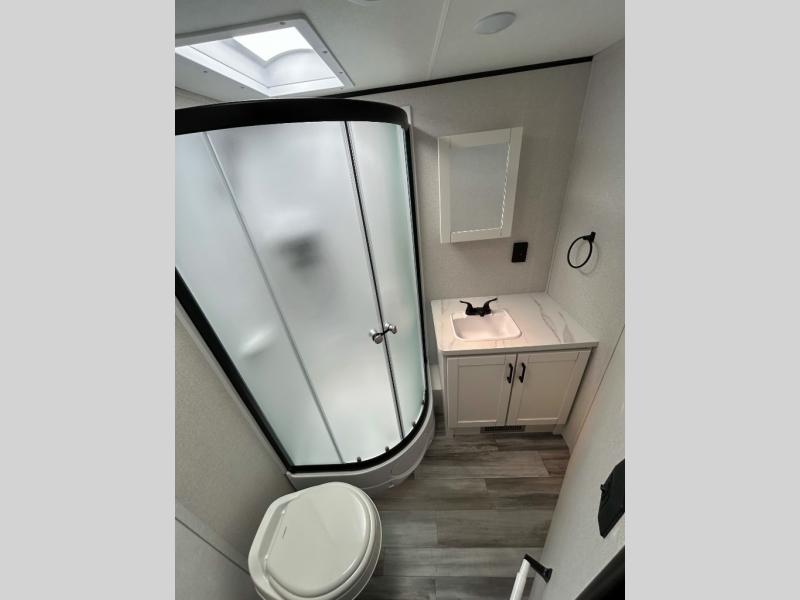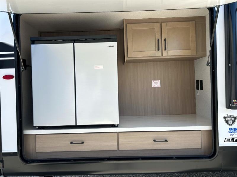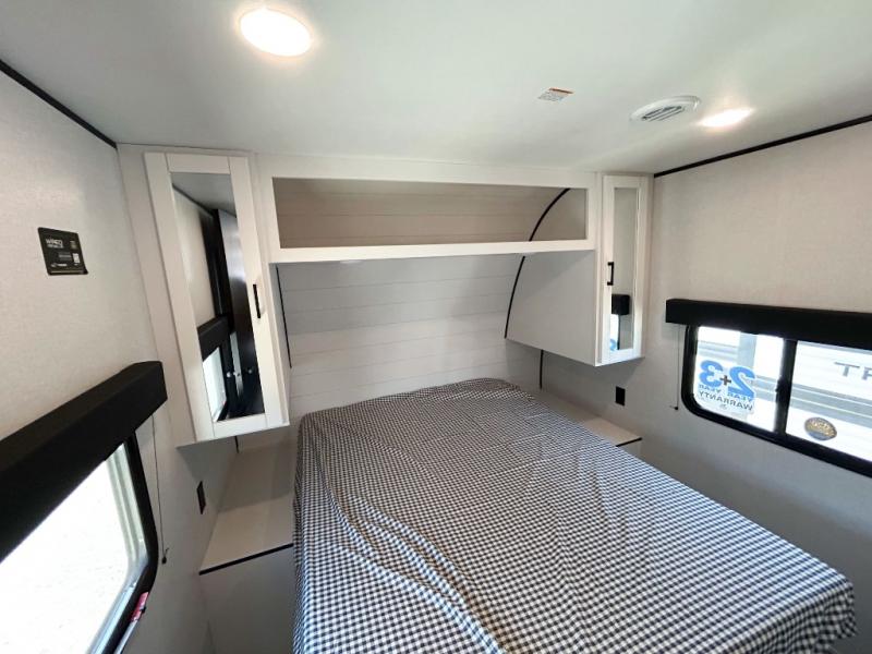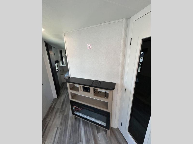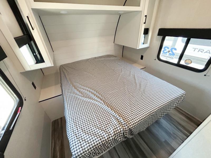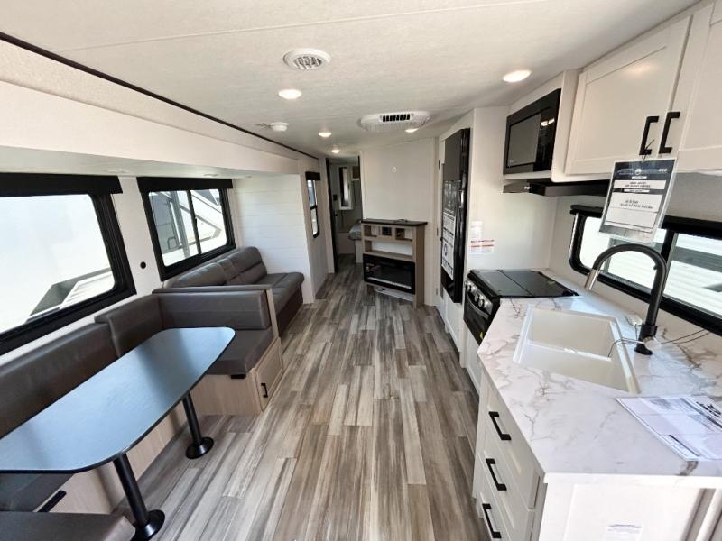 It's time to ditch that old tent and upgrade to this spacious travel trailer! There is a rear private bunkhouse includes a flip-up bunk over a 28" x 76" bunk, plus a bunk across the room and a wardrobe. You'll enjoy the front private bedroom all to yourselves with a queen bed and dual wardrobes, and the full bath is close by for easy nighttime use. A U-shaped dinette slide and sofa in the main living area provide your crew with space to relax and dine together, and the fully equipped kitchen lets you cook up your best meals. Outside, you'll find exterior storage, an 18' power awning, plus an outdoor refrigerator, shelf, and TV prep!