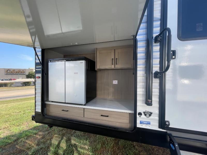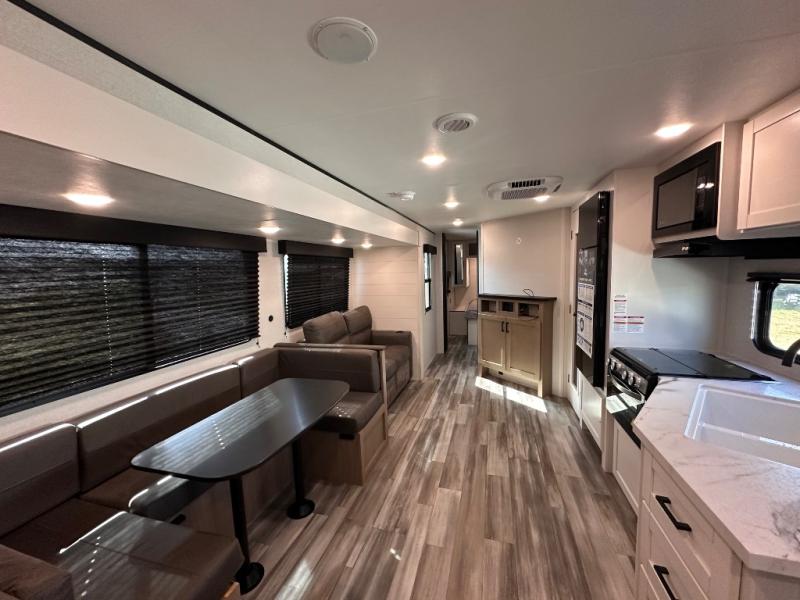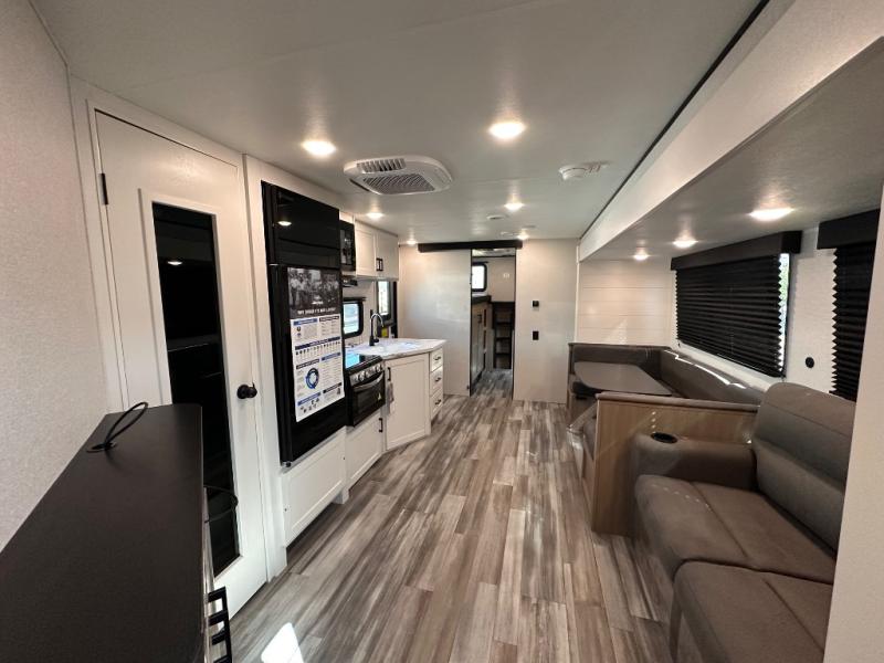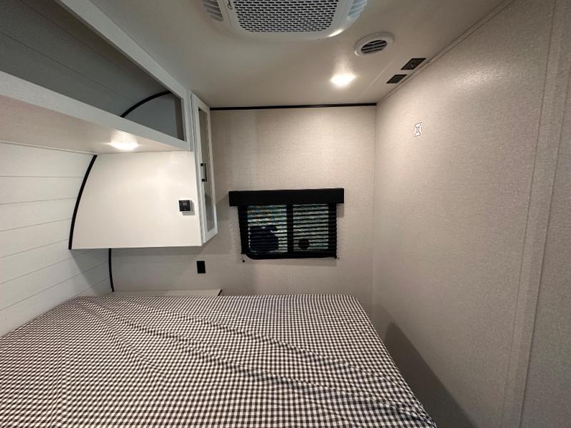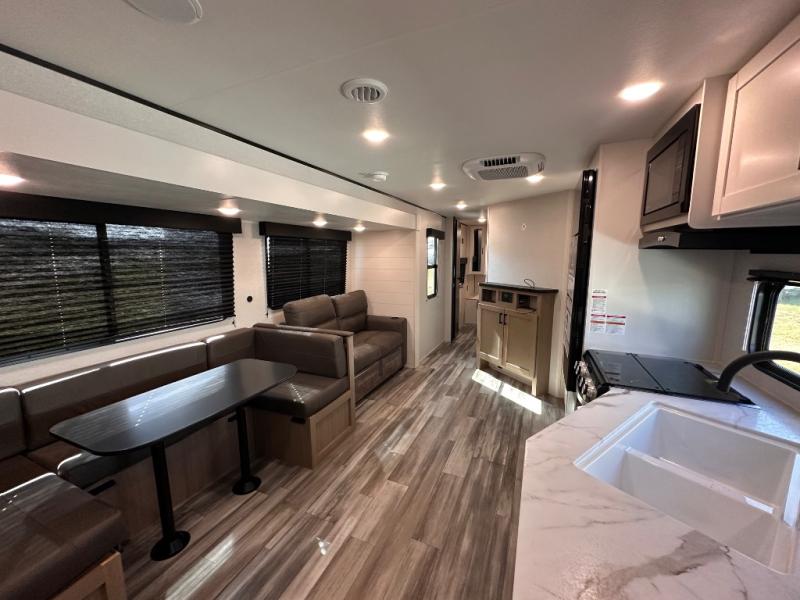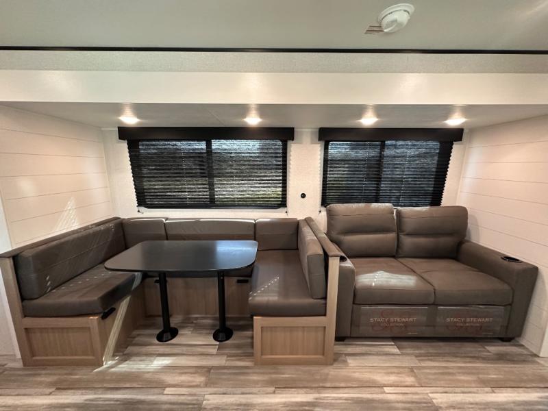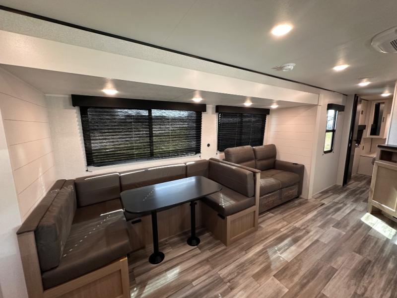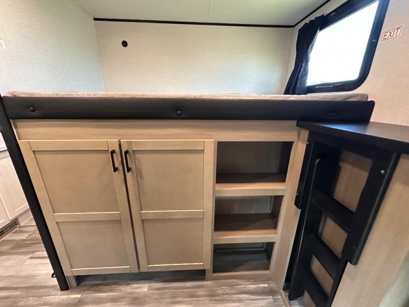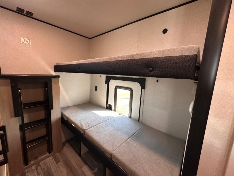 It's time to ditch that old tent and upgrade to this spacious travel trailer! There is a rear private bunkhouse includes a flip-up bunk over a 28" x 76" bunk, plus a bunk across the room and a wardrobe. You'll enjoy the front private bedroom all to yourselves with a queen bed and dual wardrobes, and the full bath is close by for easy nighttime use. A U-shaped dinette slide and sofa in the main living area provide your crew with space to relax and dine together, and the fully equipped kitchen lets you cook up your best meals. Outside, you'll find exterior storage, an 18' power awning, plus an outdoor refrigerator, shelf, and TV prep!