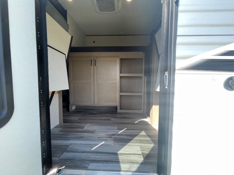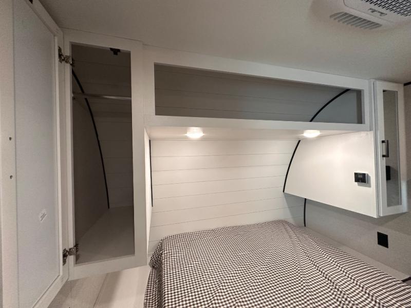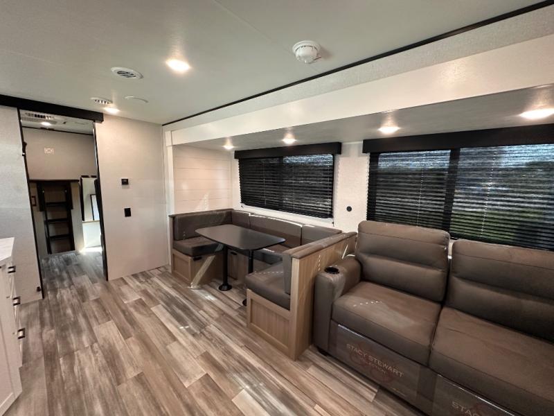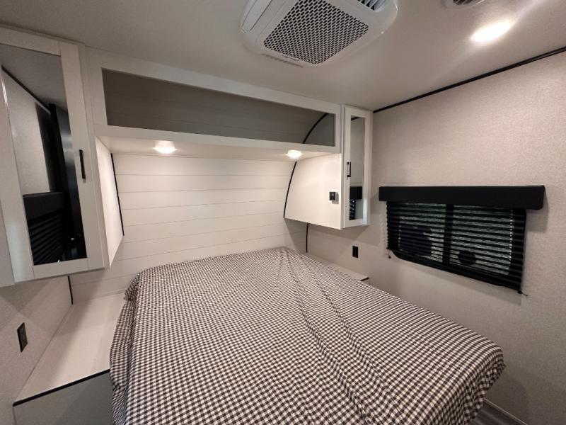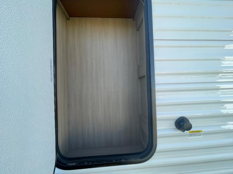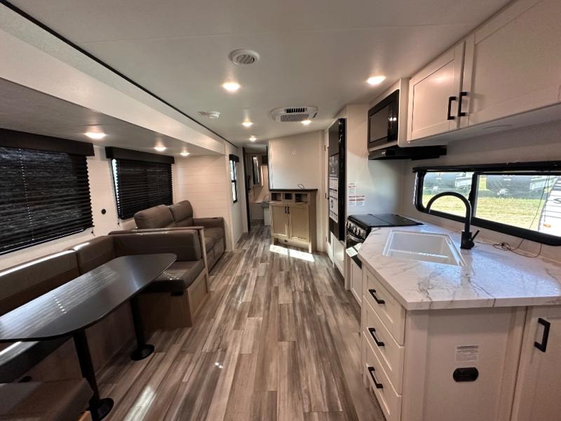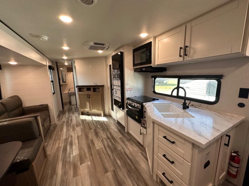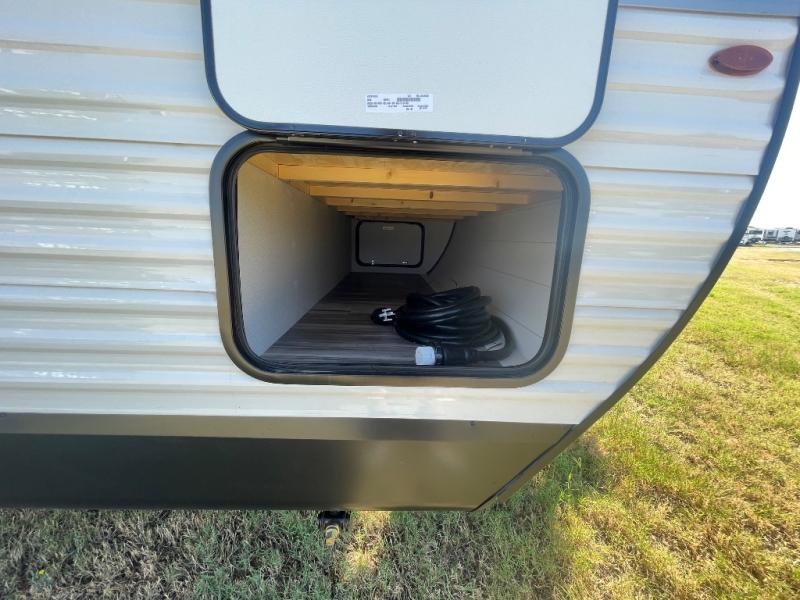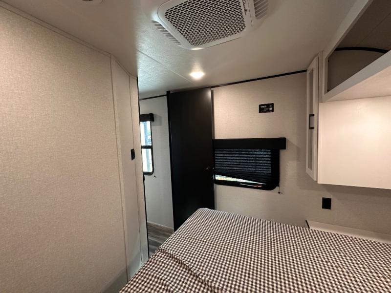 It's time to ditch that old tent and upgrade to this spacious travel trailer! There is a rear private bunkhouse includes a flip-up bunk over a 28" x 76" bunk, plus a bunk across the room and a wardrobe. You'll enjoy the front private bedroom all to yourselves with a queen bed and dual wardrobes, and the full bath is close by for easy nighttime use. A U-shaped dinette slide and sofa in the main living area provide your crew with space to relax and dine together, and the fully equipped kitchen lets you cook up your best meals. Outside, you'll find exterior storage, an 18' power awning, plus an outdoor refrigerator, shelf, and TV prep!