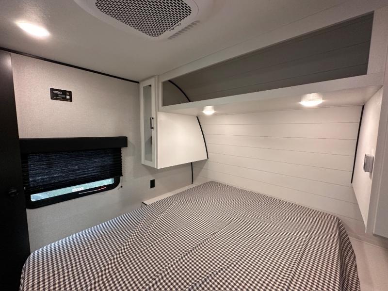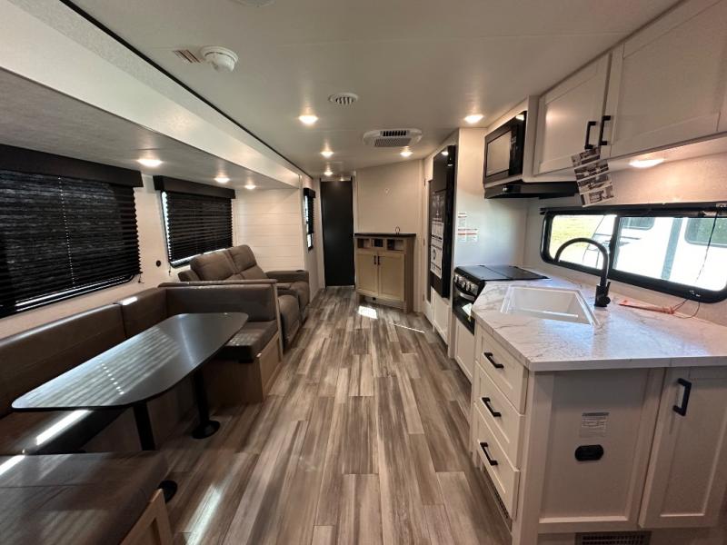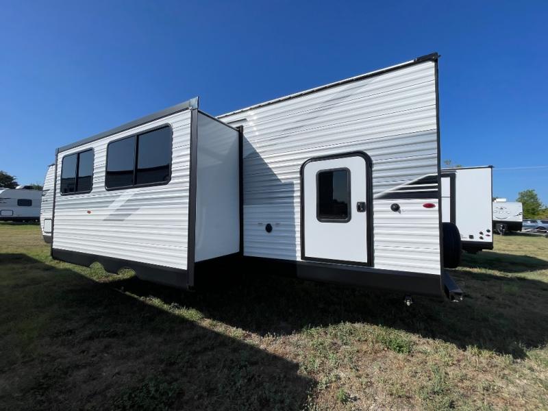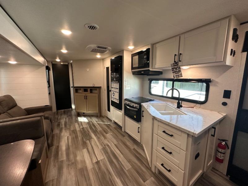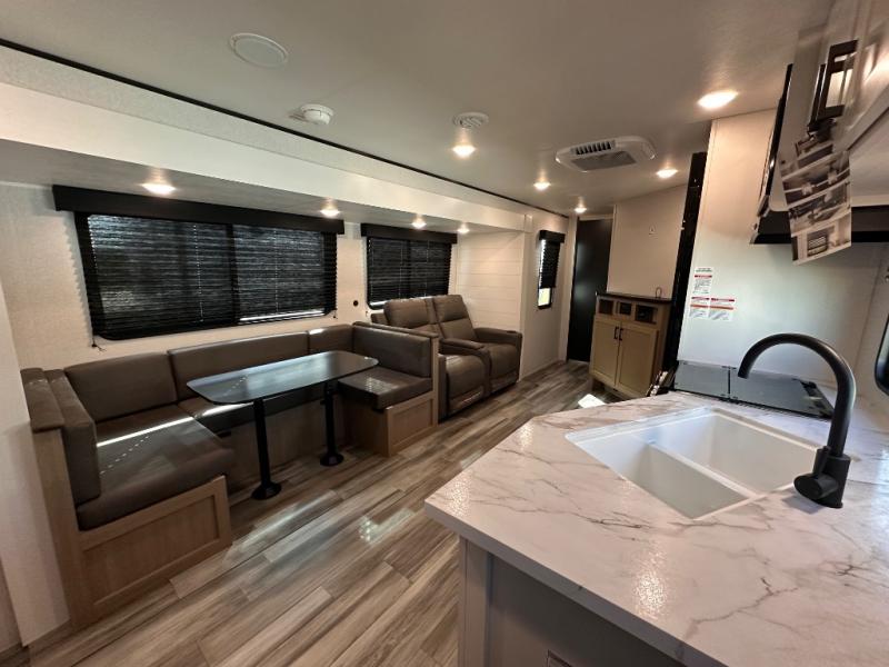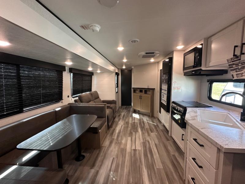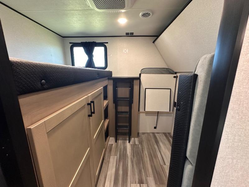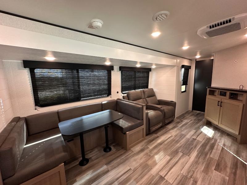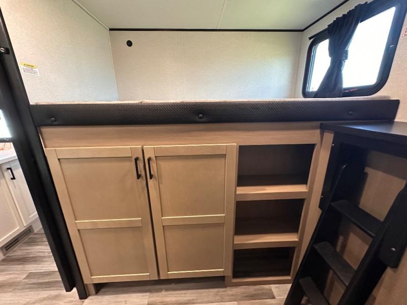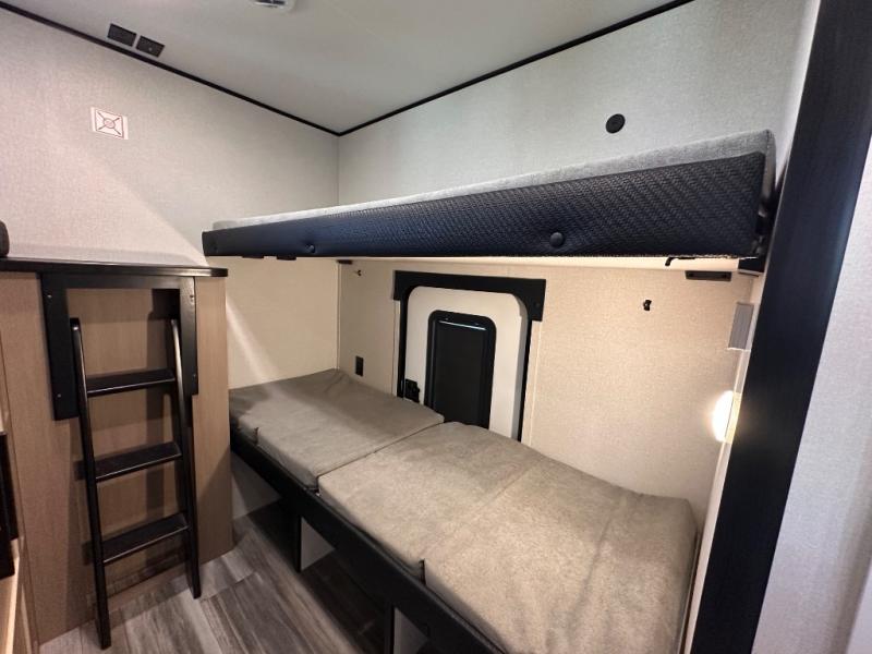 It's time to ditch that old tent and upgrade to this spacious travel trailer! There is a rear private bunkhouse includes a flip-up bunk over a 28" x 76" bunk, plus a bunk across the room and a wardrobe. You'll enjoy the front private bedroom all to yourselves with a queen bed and dual wardrobes, and the full bath is close by for easy nighttime use. A U-shaped dinette slide and sofa in the main living area provide your crew with space to relax and dine together, and the fully equipped kitchen lets you cook up your best meals. Outside, you'll find exterior storage, an 18' power awning, plus an outdoor refrigerator, shelf, and TV prep!